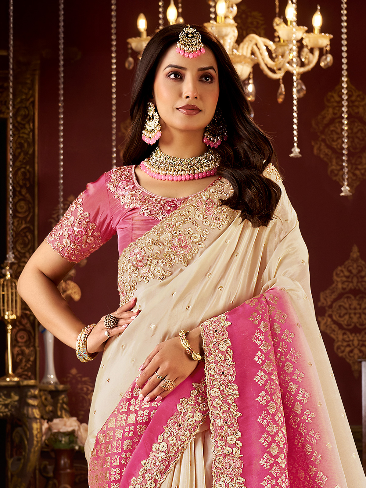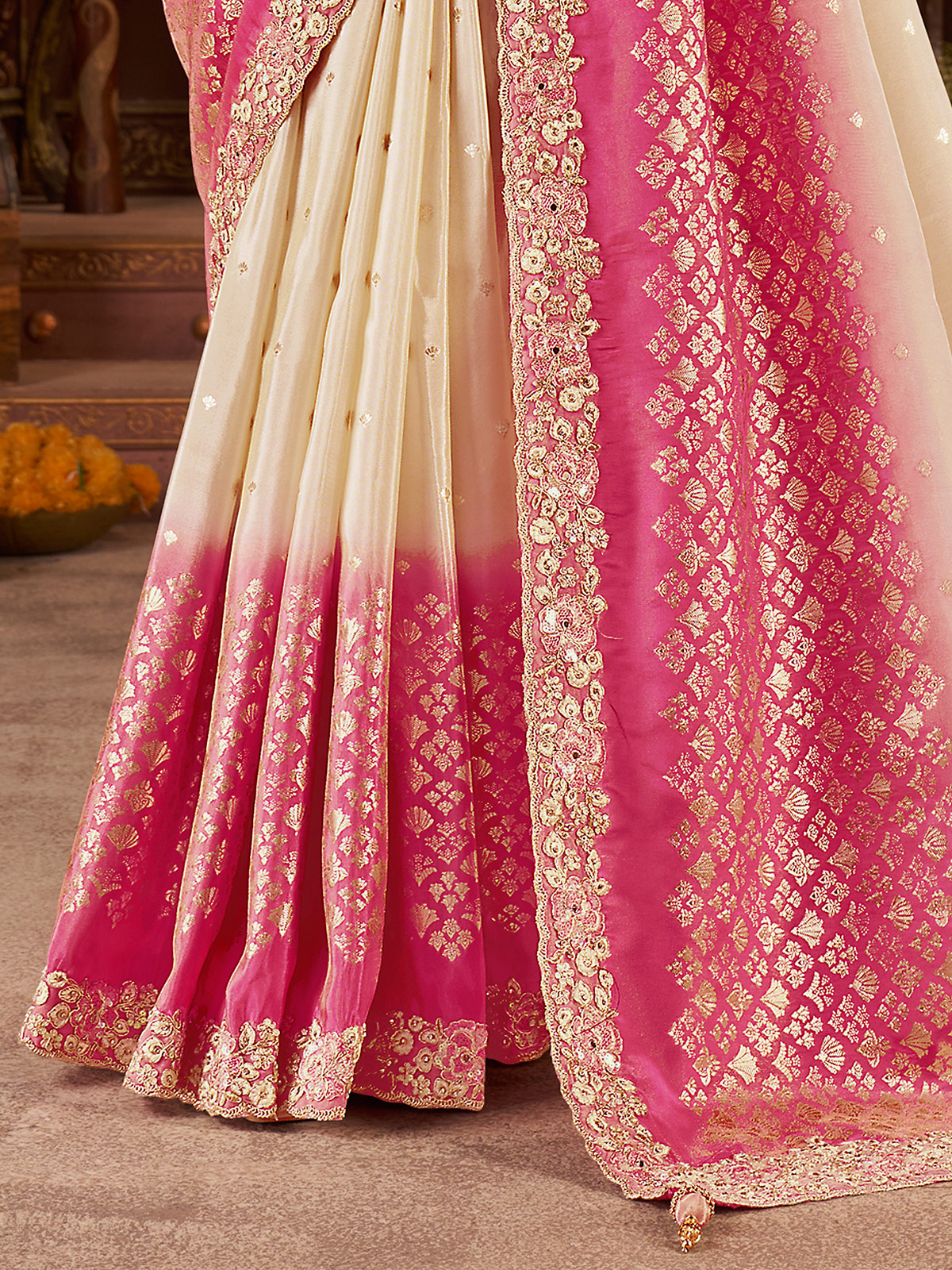 This shaded pink and cream soft silk saree is enhanced with embroidery, sequins, mirror work, stone, zardosi, and zari work. Comes with an unstitched blouse piece, making it ideal for weddings, receptions, and festive celebrations.