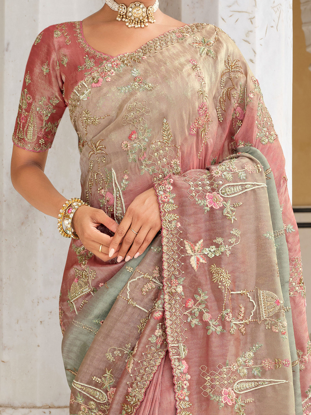Adorned in soft pink shades, this silk saree highlights exquisite khatli work detailed with embroidery, sequins, zardosi, beads, zari and thread accents. Designed to impress at weddings, sangeet and receptions, it is paired with a matching unstitched blouse for personalized styling.
