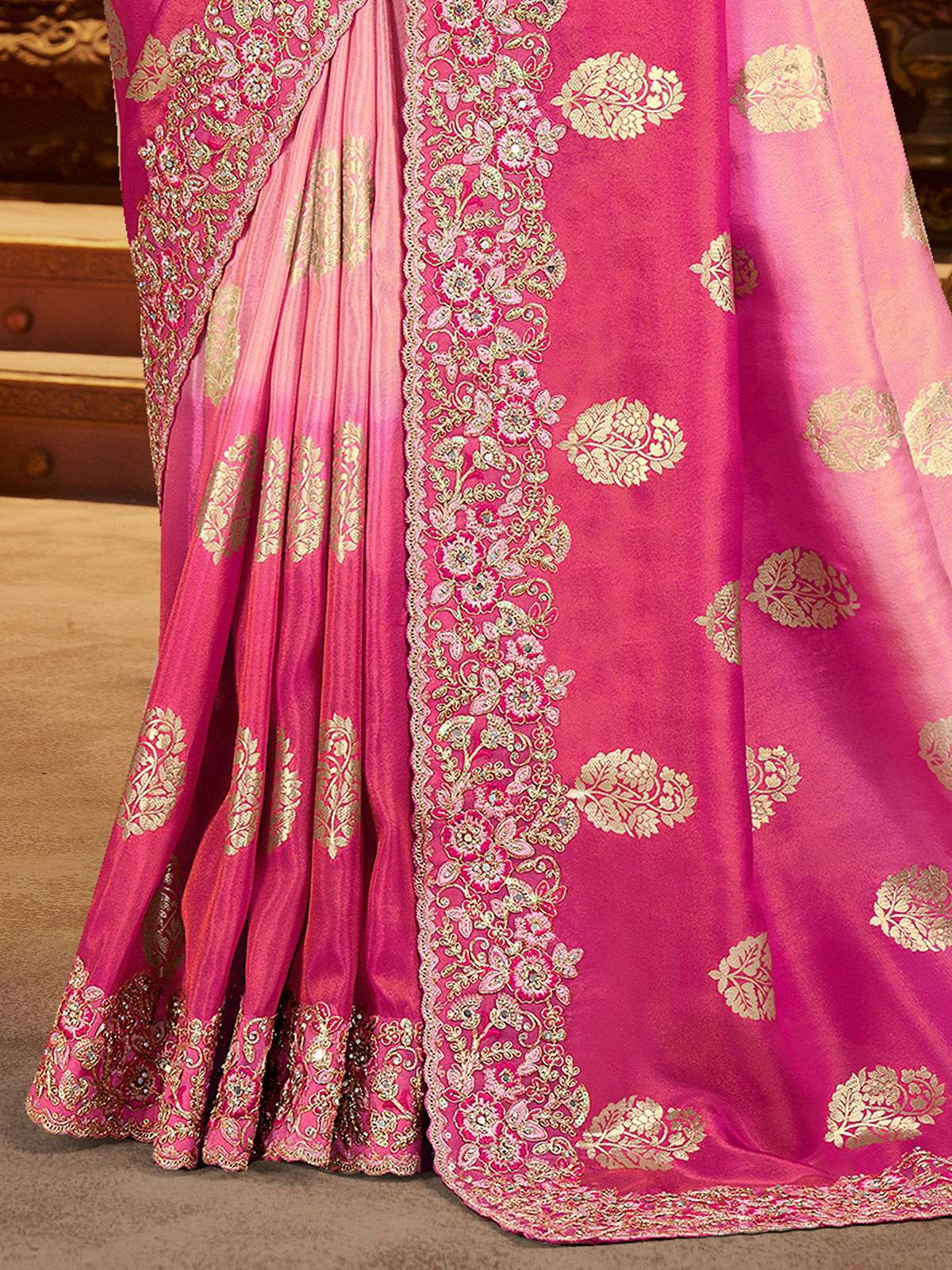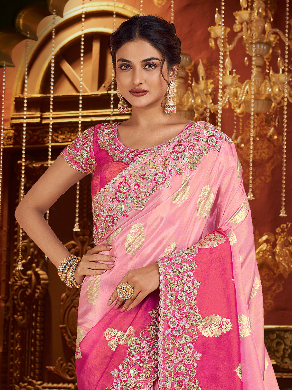 This shaded pink soft silk saree is adorned with elegant embroidery, sequins, mirror work, stone, zardosi, and zari. Teamed with an unstitched blouse piece, it offers a graceful festive look for weddings, sangeet, and receptions.