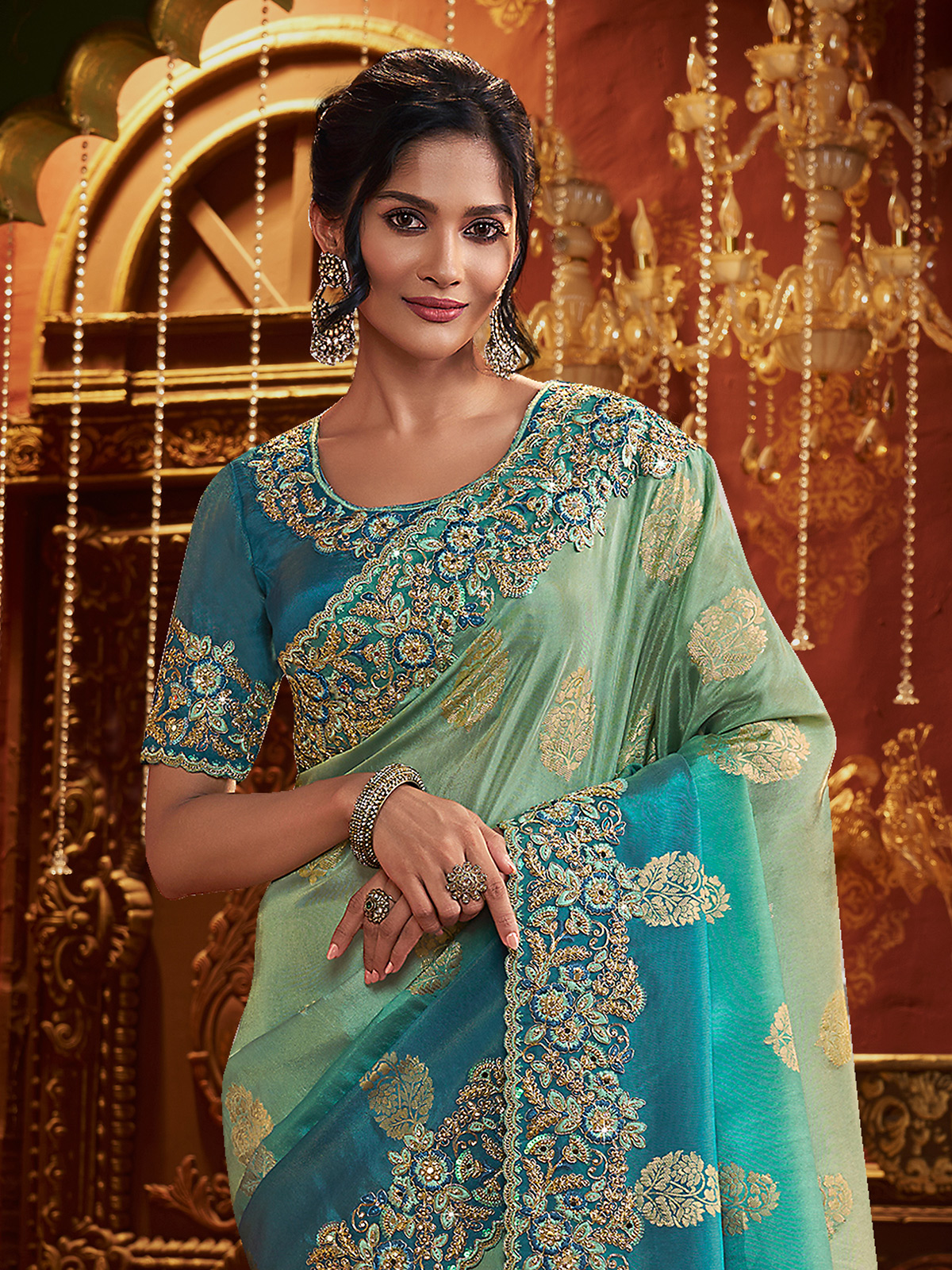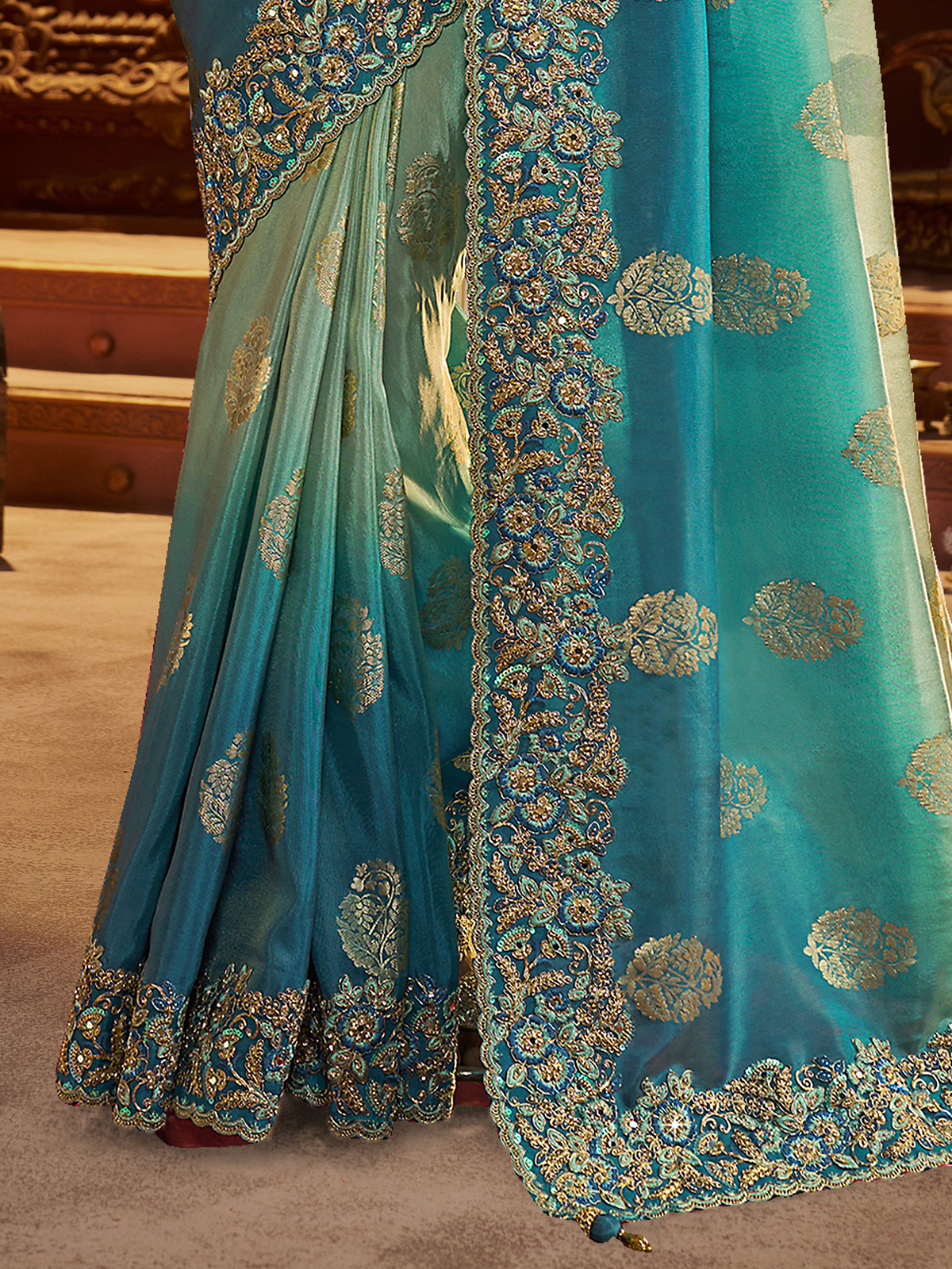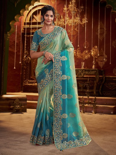 Designed in a beautiful shaded pista green and blue combination, this soft silk saree showcases embroidery with sequins, mirror work, stone, zardosi, and zari. Includes an unstitched blouse piece, perfect for weddings, receptions, and festive celebrations.