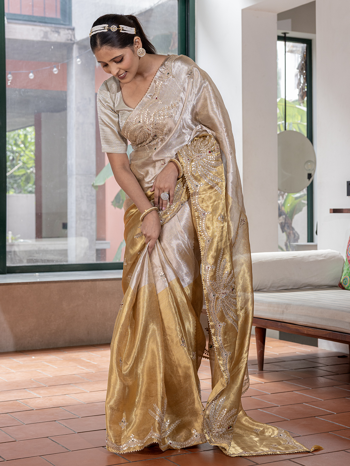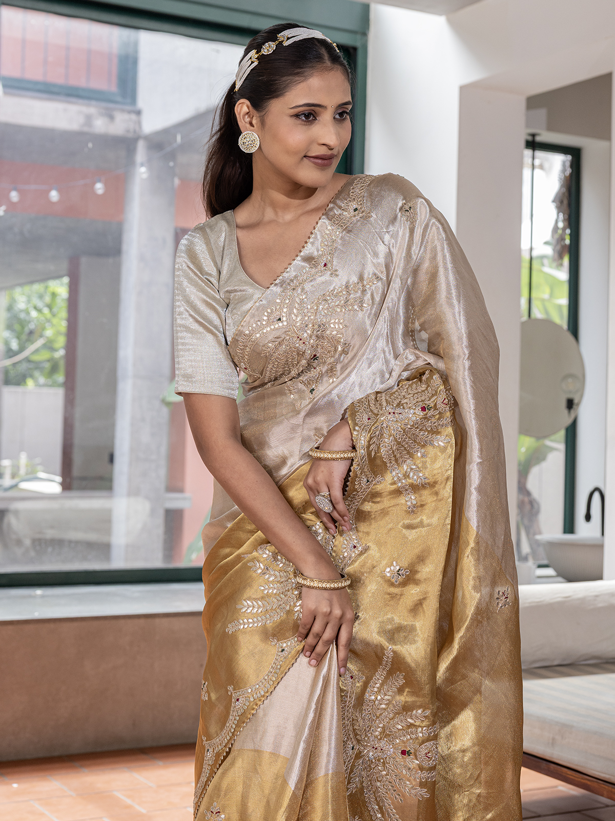 This silver and golden silk saree gleams with regal radiance, its luxurious texture adorned with resham, sequins, beads and gota that shine with festive grandeur. Paired with an unstitched blouse for personalized styling, it is perfect for weddings, receptions and traditional celebrations filled with elegance and charm.