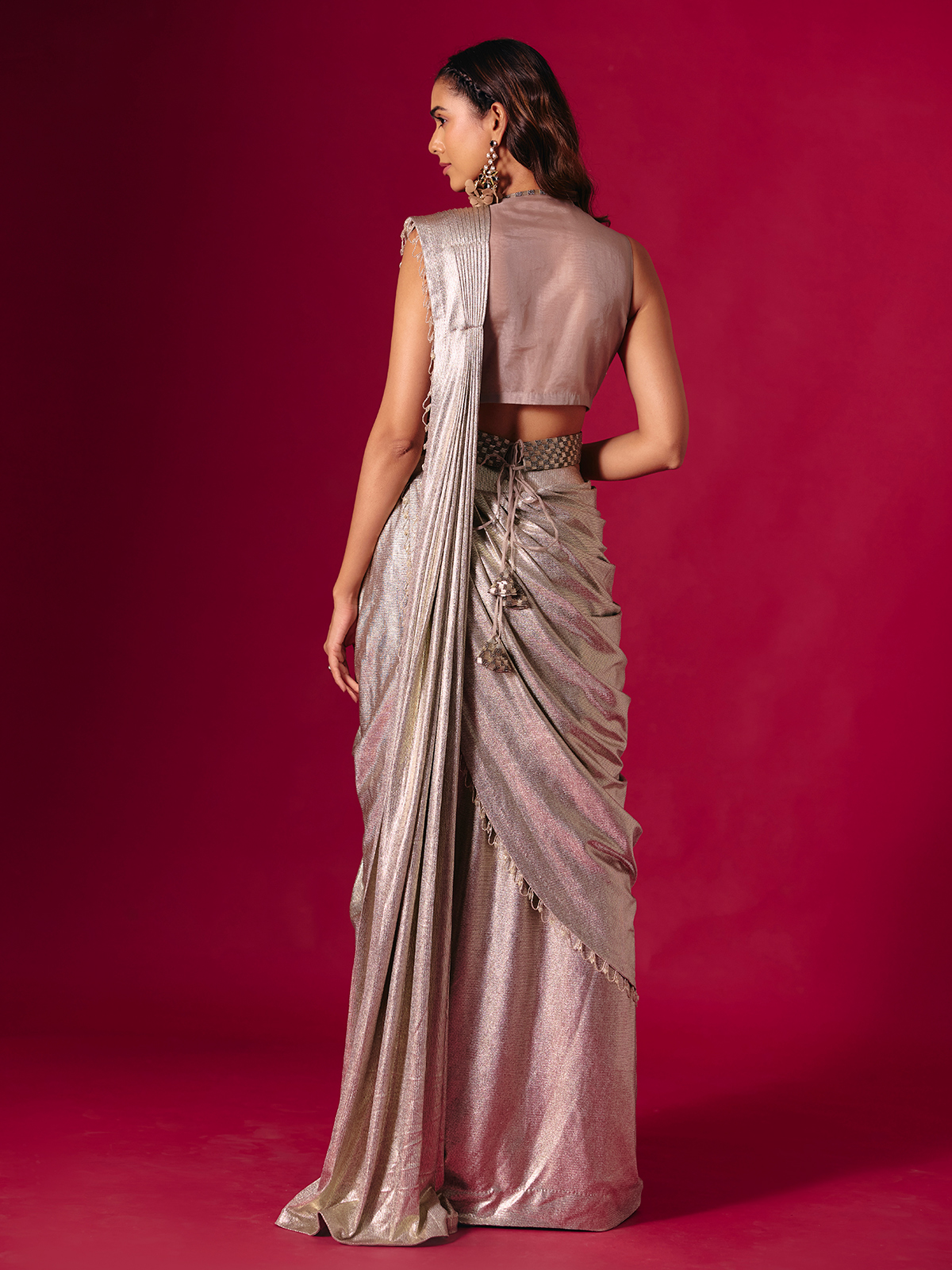 Shimmering in silver lycra, this ready-to-wear saree is elevated with Swarovski and bead highlights for a luminous festive look. Its effortless drape and sleek silhouette make it an excellent choice for reception and party wear, offering comfort with striking elegance.
