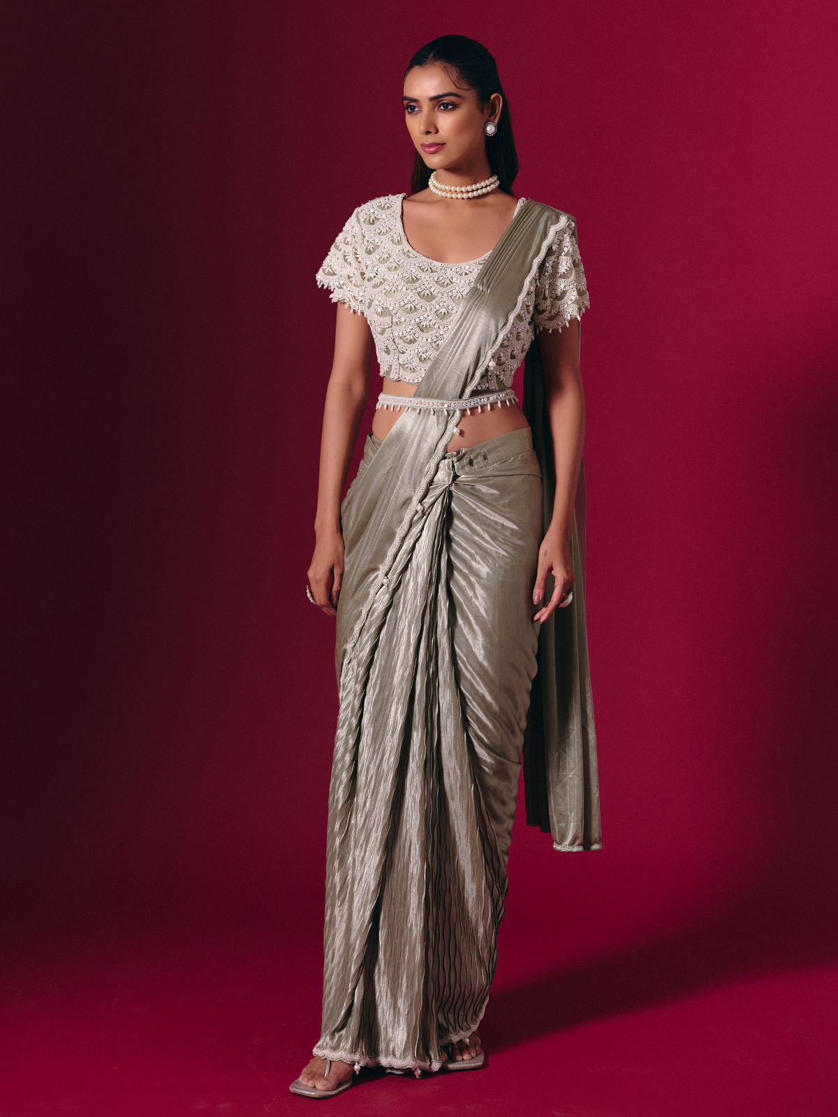 This silver shimmer saree radiates elegance with beads, pearls, and sequin embellishments. The designer waist belt shapes the silhouette with subtle glamour. A perfect style for parties, receptions, and evening events where sparkle takes the spotlight.