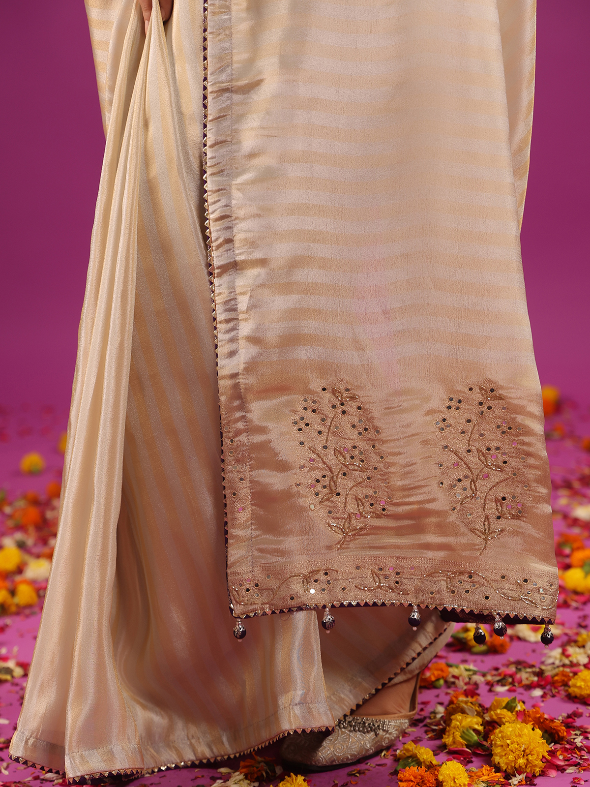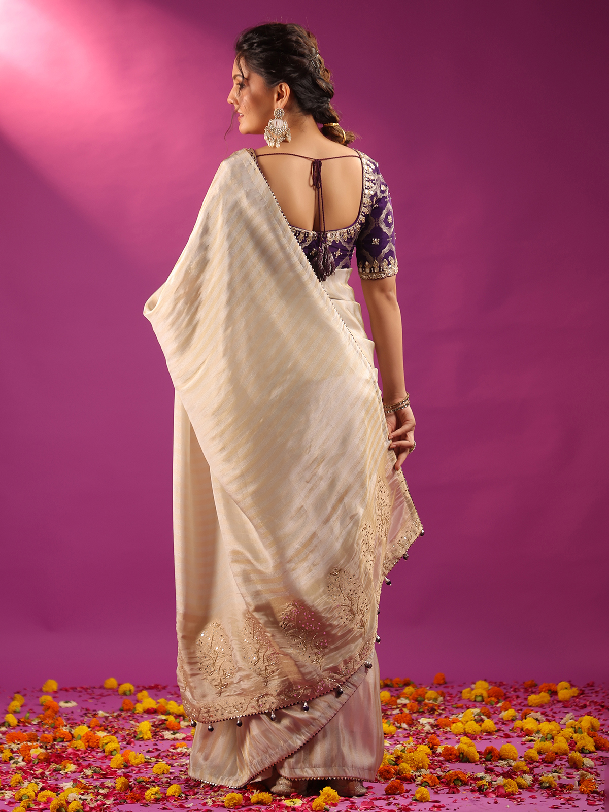 Draped in serene silver silk, this saree captures subtle brilliance with every fold. Intricate zari, cutdana, aabla, and beadwork shine gracefully. Includes an unstitched purple blouse piece, ideal for festive gatherings, weddings, and special celebrations.