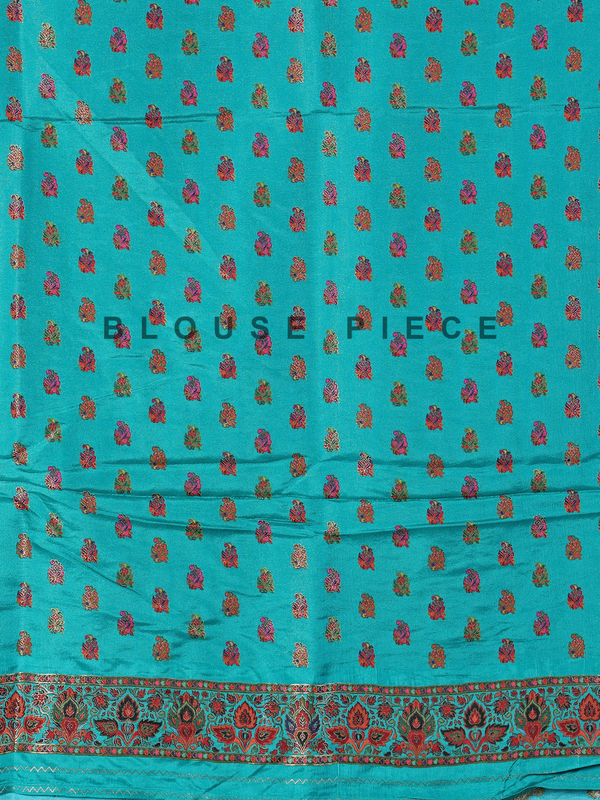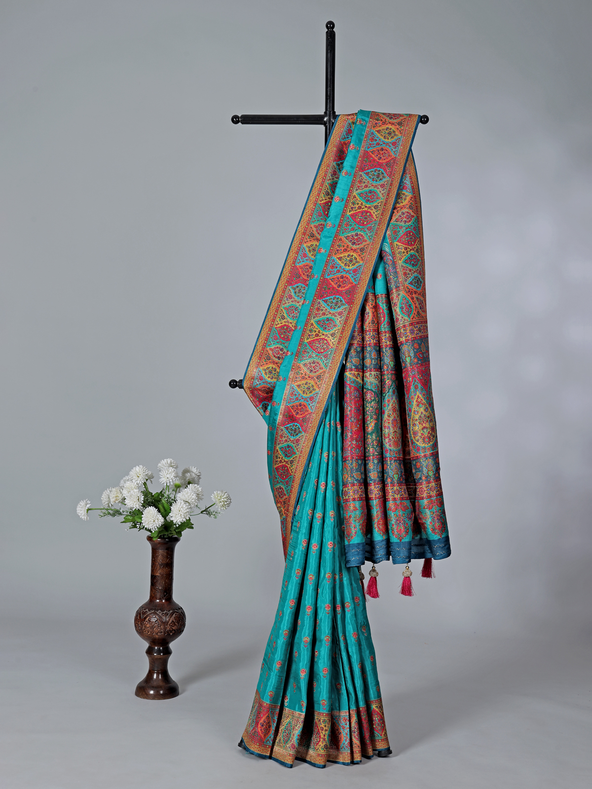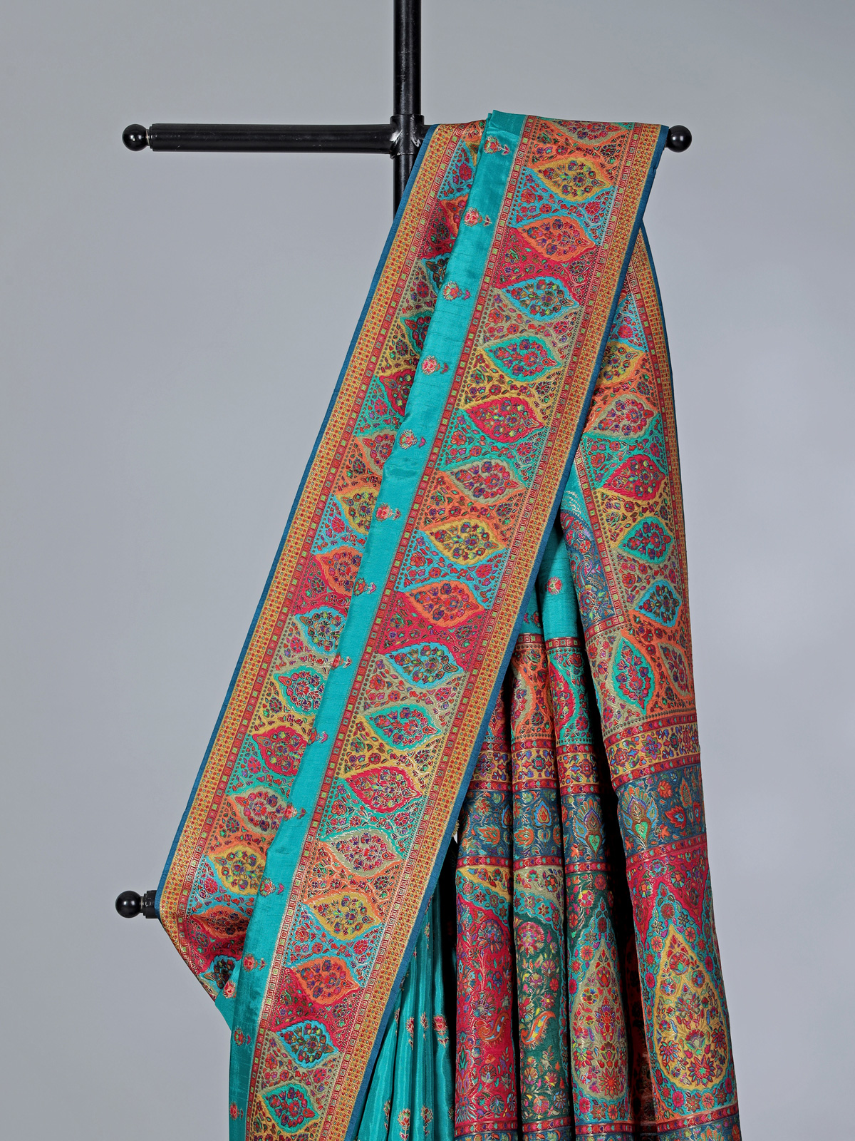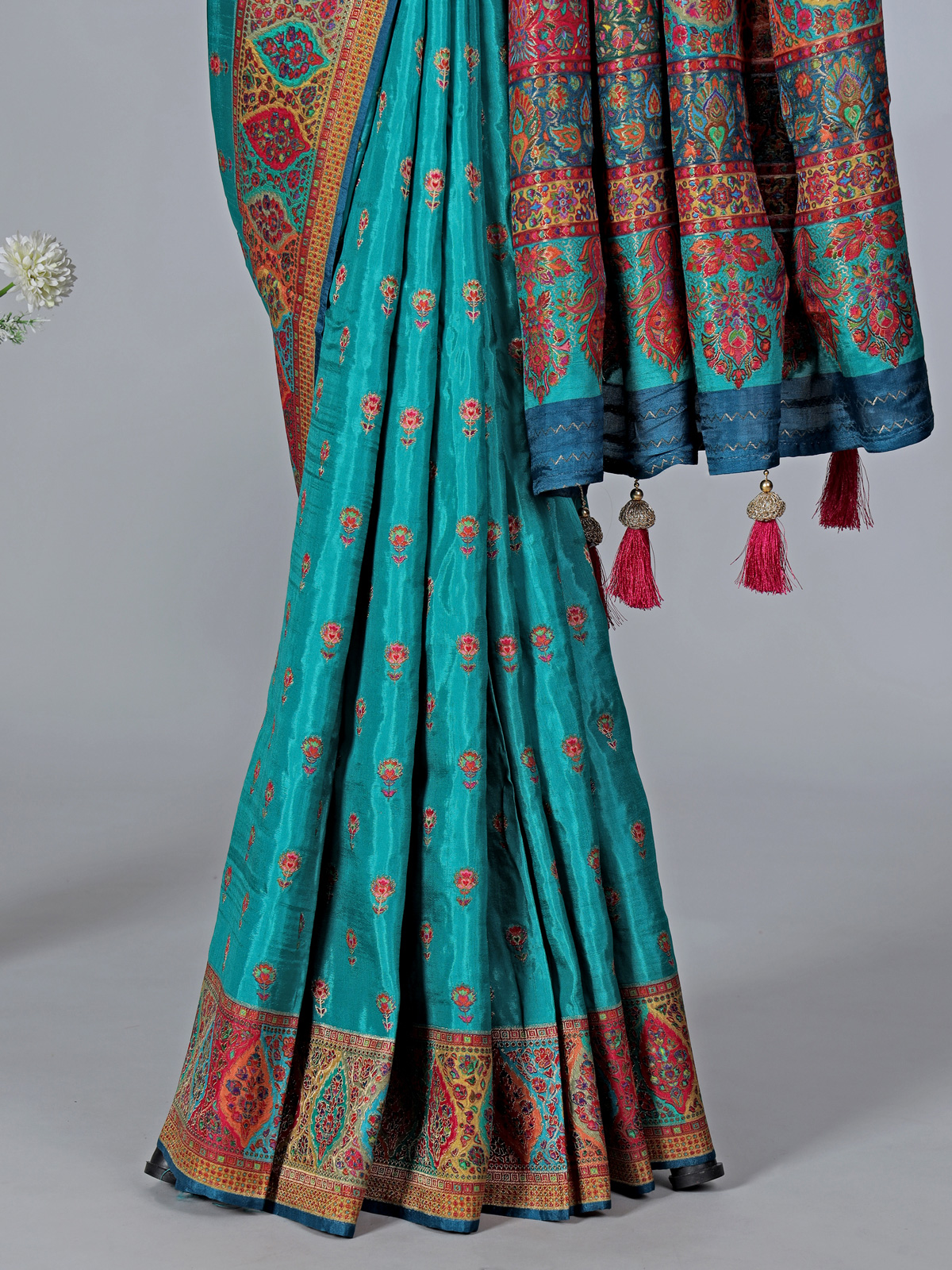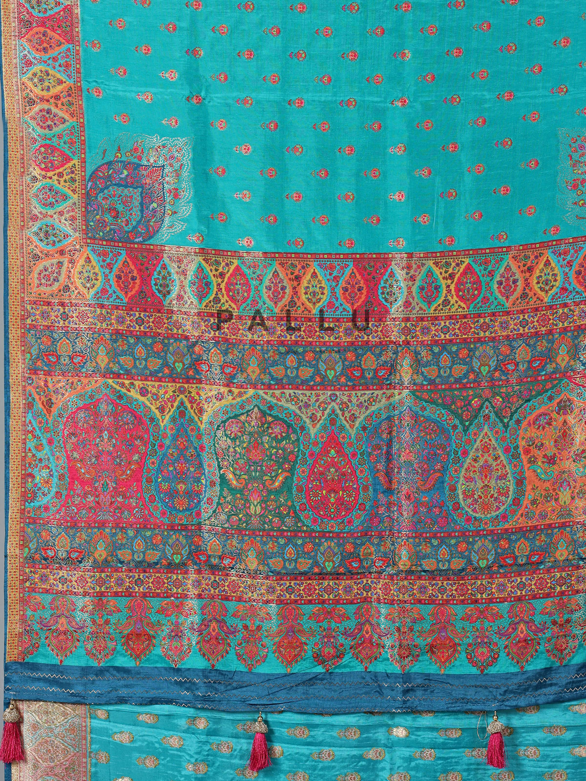 This sky blue art pasmina silk saree exudes refined charm with delicate embroidery, thread, and zari work. A prominent red border and richly patterned multicolored pallu with ethnic and paisley motifs elevate its appeal, making it an ideal choice for weddings, receptions, and festive occasions.