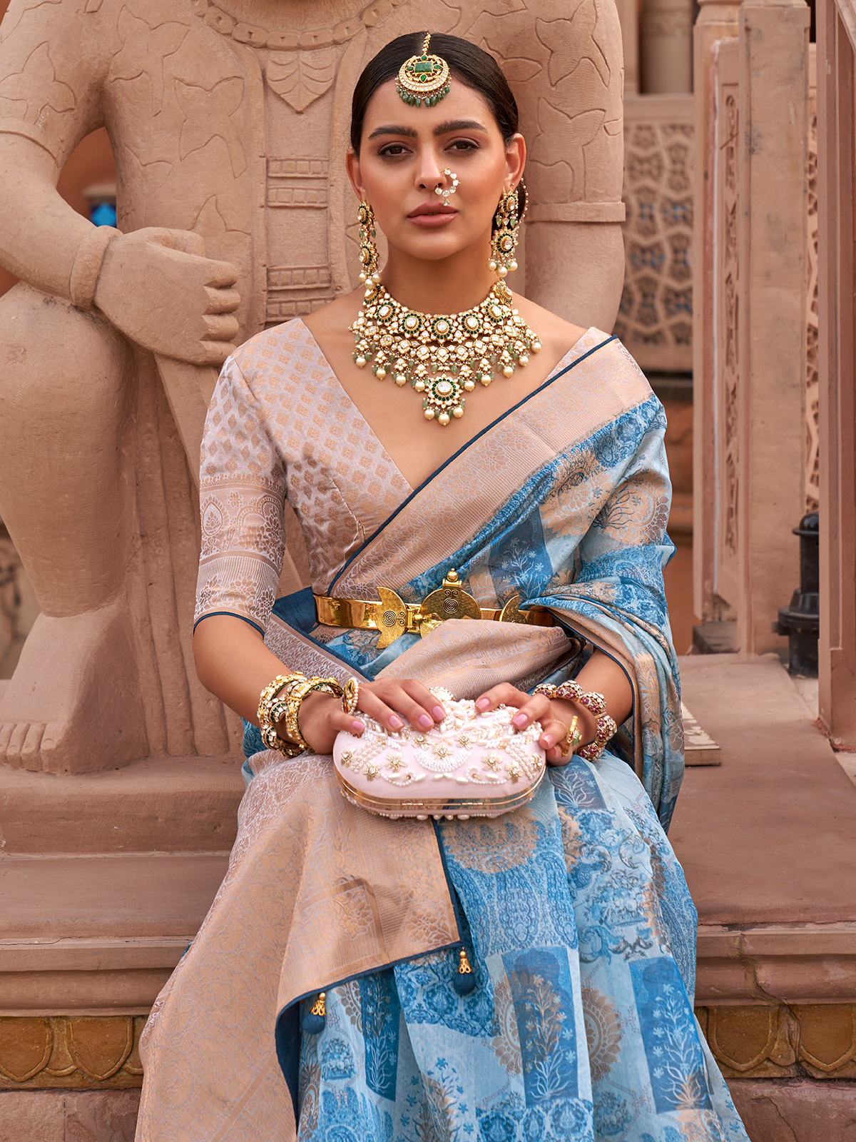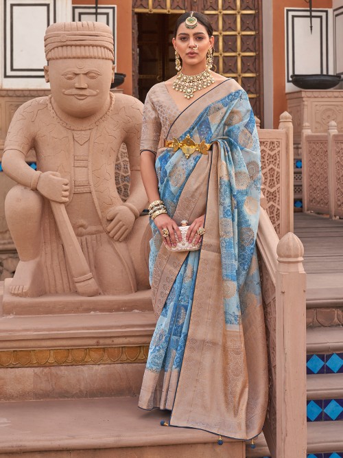 Elevate your ethnic look with this sky blue organza saree featuring delicate zari weaving and enchanting digital prints. Its sheer elegance and graceful drape make it an ideal pick for festive gatherings and wedding functions. Includes unstitched blouse.