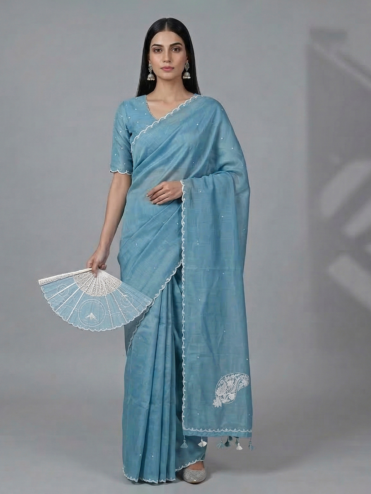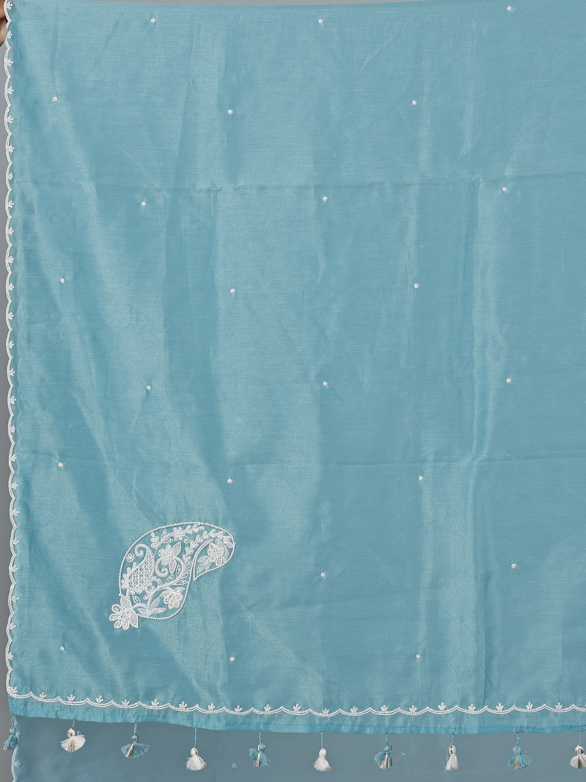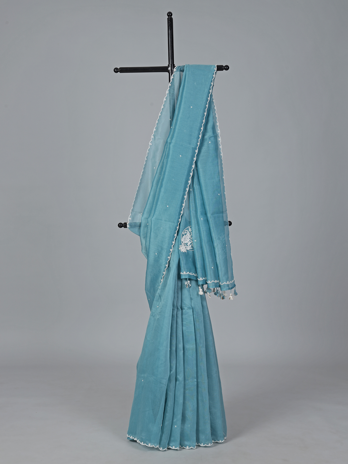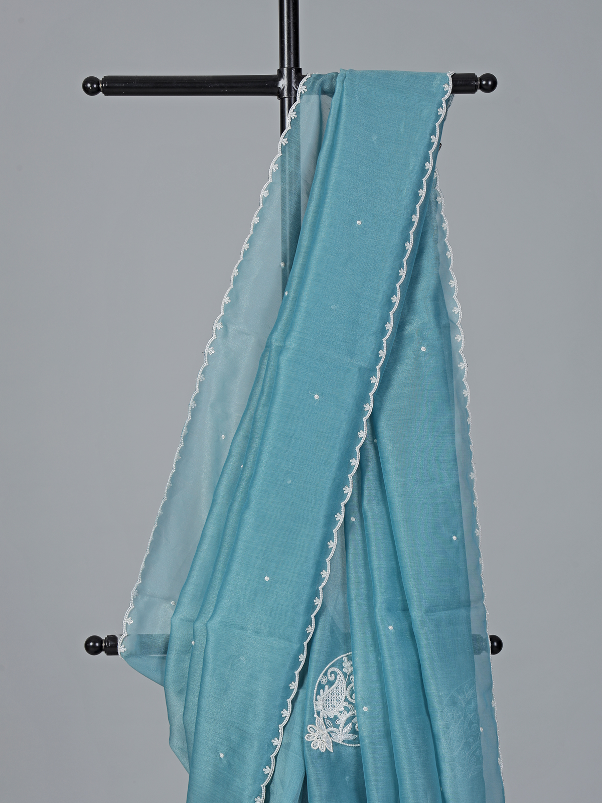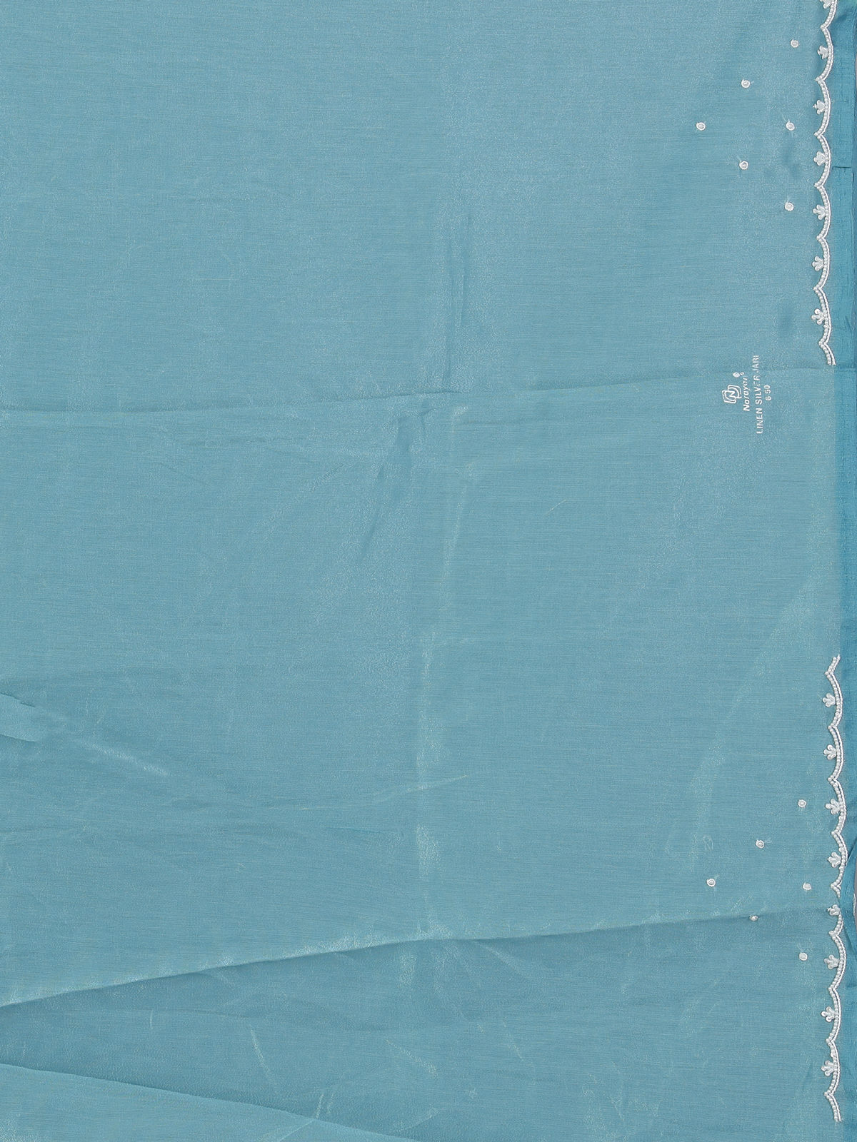Soft sky blue organza saree enriched with thread, cutdana, beads and sequins detailing. Its light, airy drape combined with shimmering embellishments creates a serene yet festive charm. Includes an unstitched blouse piece for a custom finish.