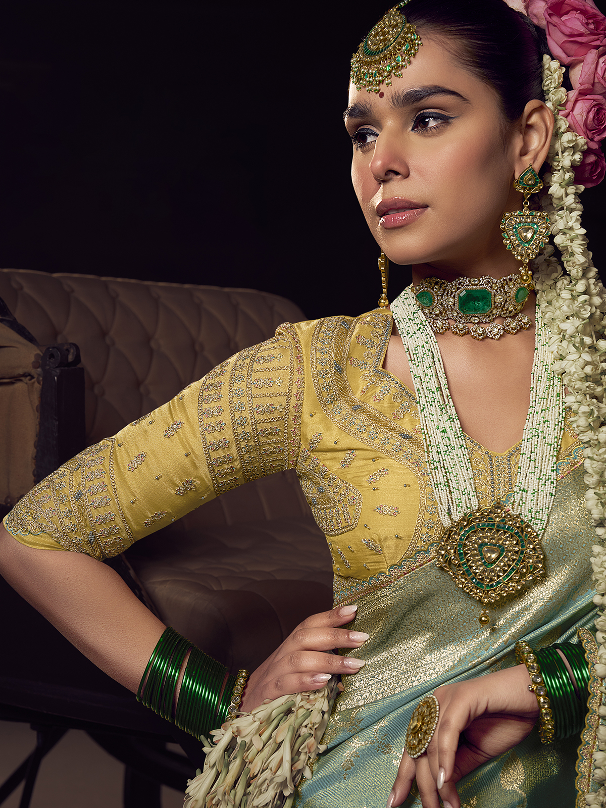 Exude serene beauty in this sky blue viscose tissue silk saree, enhanced with sparkling cutdana, beads, resham, and zari work. Perfect for weddings and festive events, it includes an unstitched blouse piece, letting you create a personalized, chic, and graceful outfit.