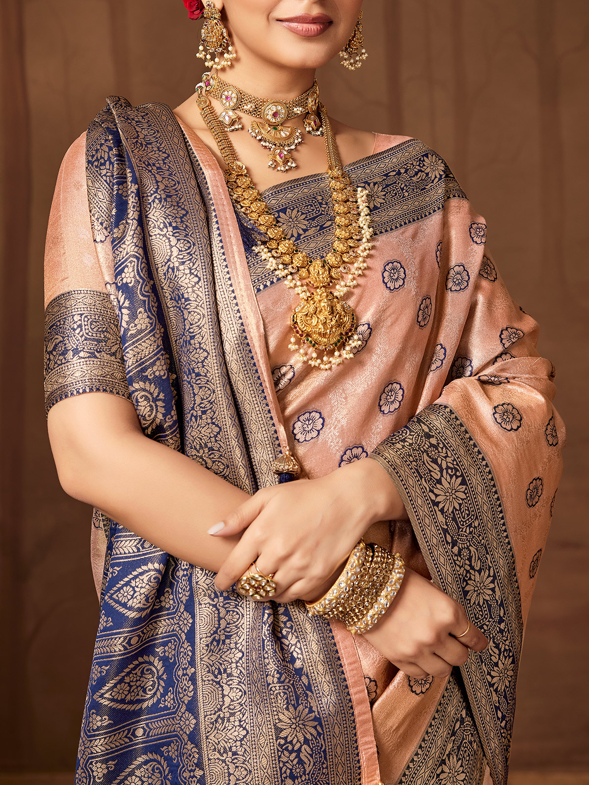 Soft and elegant, this peach silk saree is adorned with detailed floral motifs along the body and complemented with meena floral designs on the border and pallu. The lavish metallic zari work brings a shimmering radiance. With an unstitched blouse, it suits weddings, sangeet and reception events flawlessly.