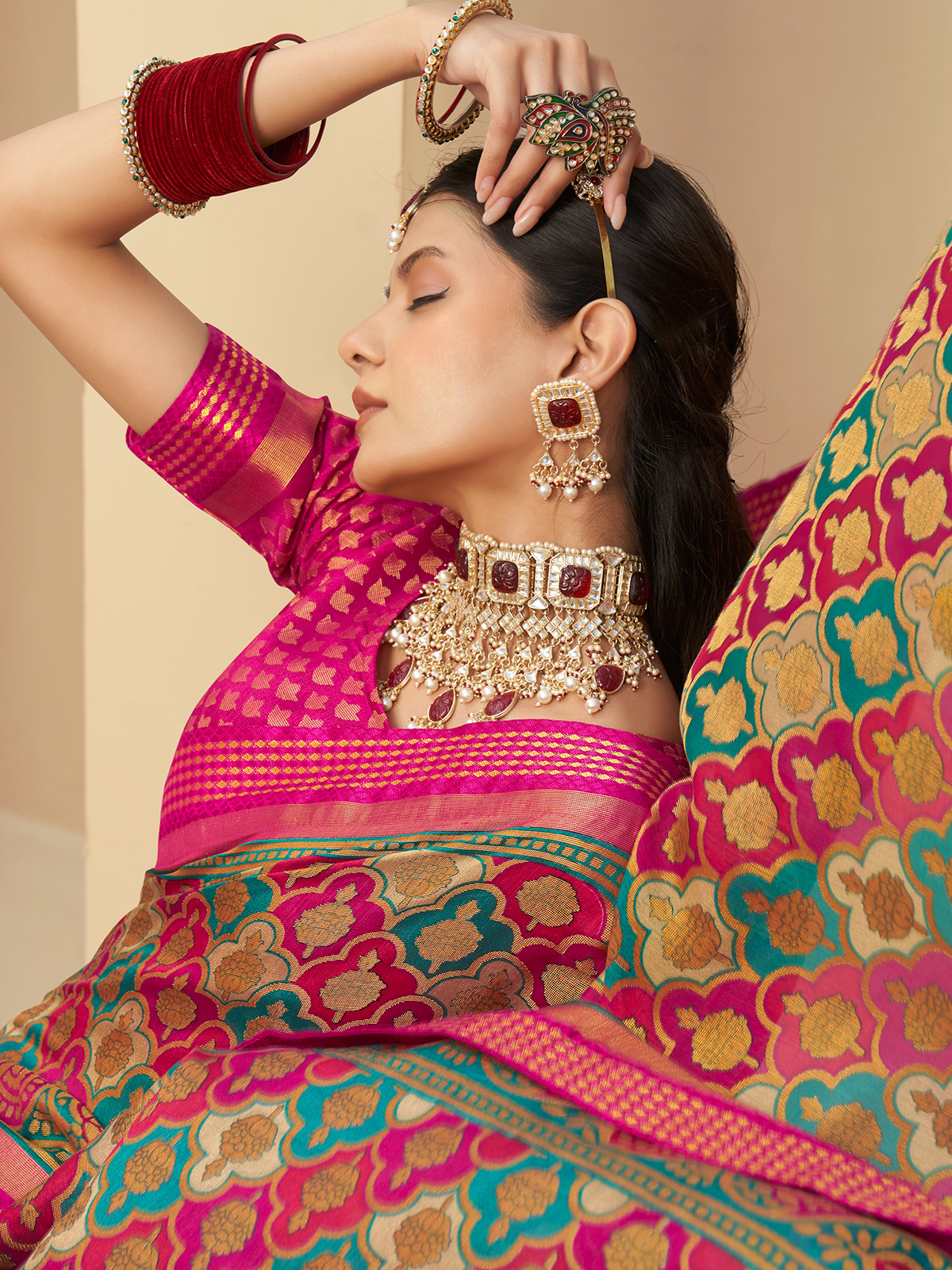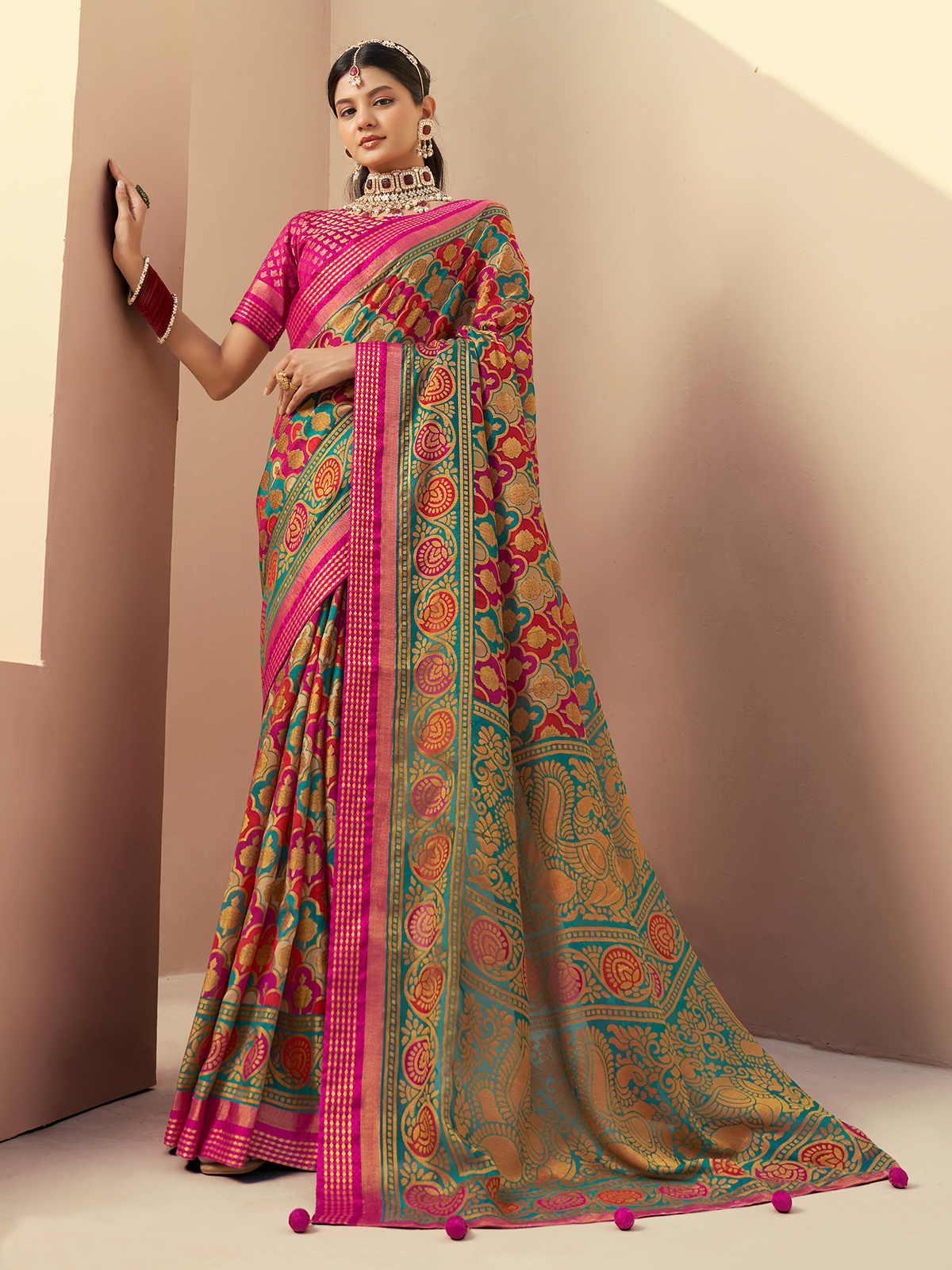 Gracefully styled in soft pink tones, this georgette saree features light printed details on a flowy, smooth fabric. Its gentle texture and easy drape make it ideal for festive days or small events. Includes an unstitched blouse piece for relaxed home tailoring.