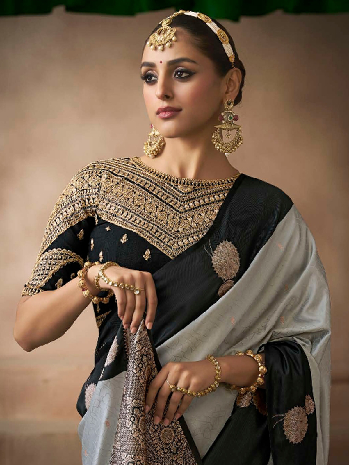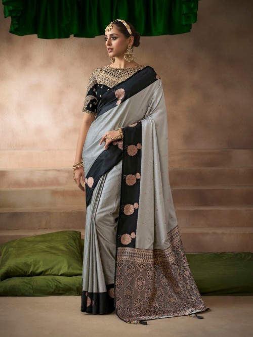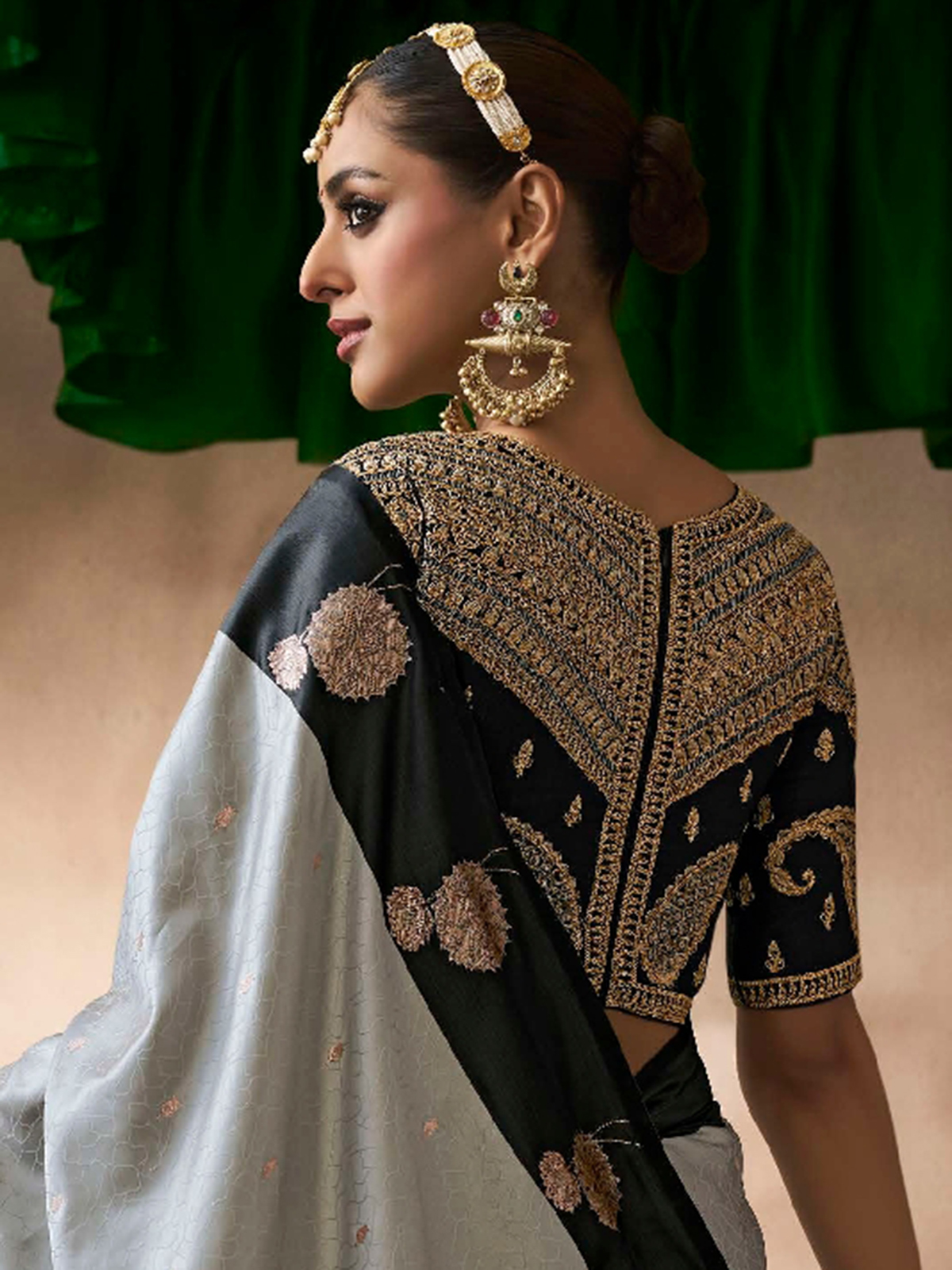 Elegant grey satin silk saree embellished with embroidery, resham, and sequins. The contrasting border and delicate butti weaving enhance its subtle sophistication. Perfect for weddings and festive gatherings, it comes with an unstitched blouse piece for a custom, graceful look.