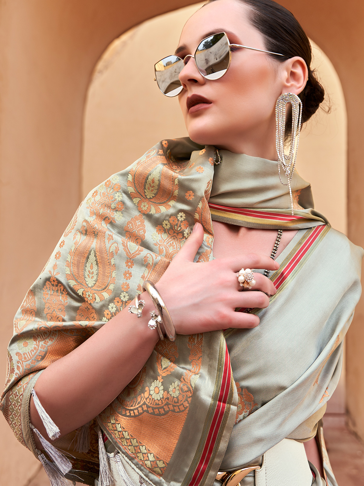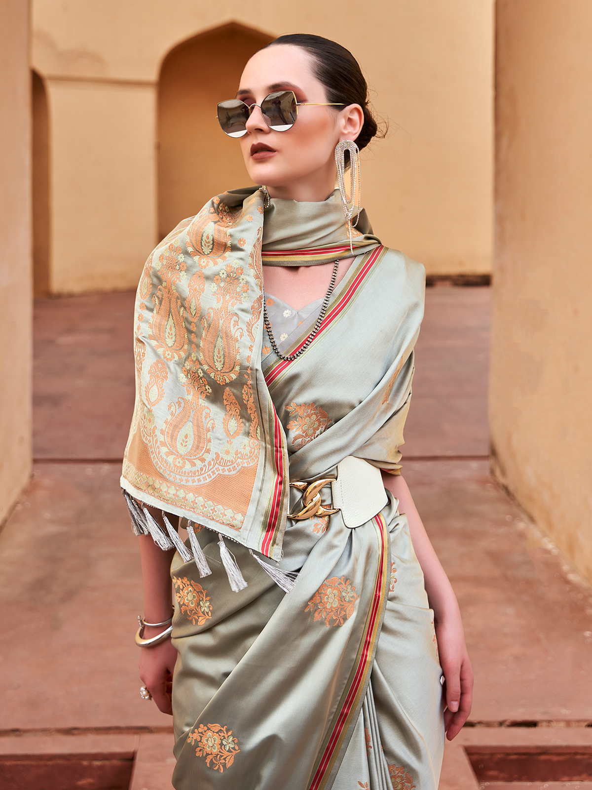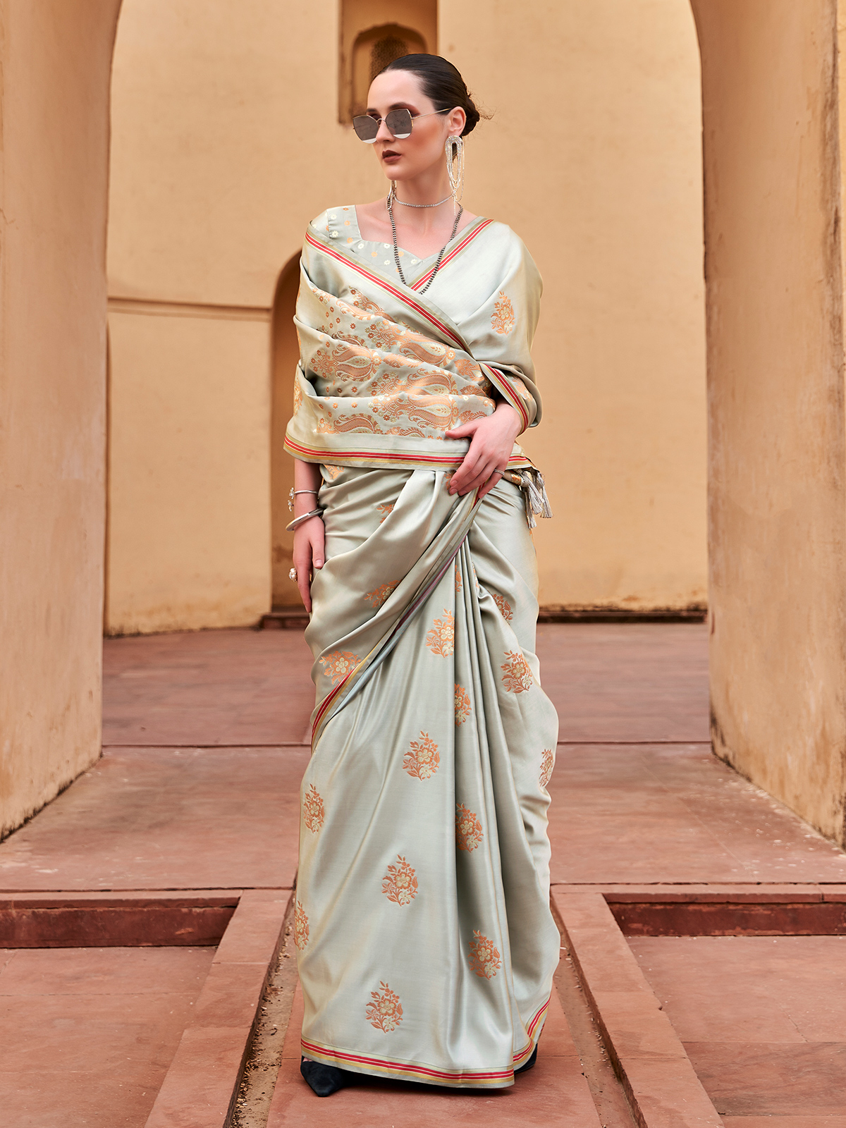 Subtle and refined, this grey satin silk saree shines with the grace of zari weaving. Its understated beauty makes it suitable for weddings and festive gatherings. Paired with an unstitched blouse piece, it provides the flexibility to design your own elegant ensemble.