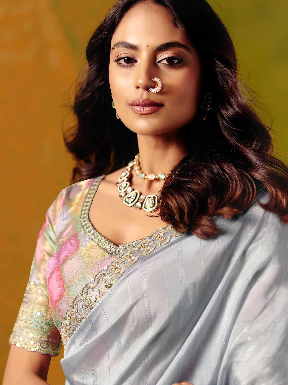 Sophisticated and modern, this grey zari silk saree is beautifully detailed with resham, sequins, thread, and zari work on the border and blouse. Paired with a sweetheart neck and elbow sleeves readymade blouse, it offers a classy, polished, and elegantly graceful look ideal for festivals, receptions, and weddings.