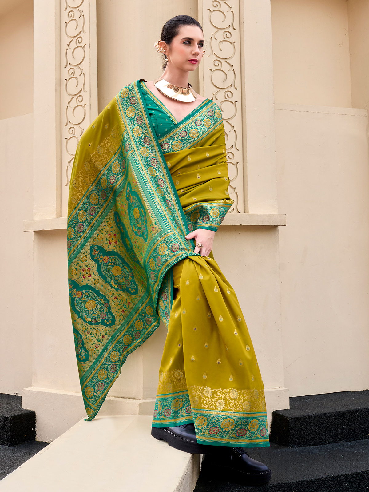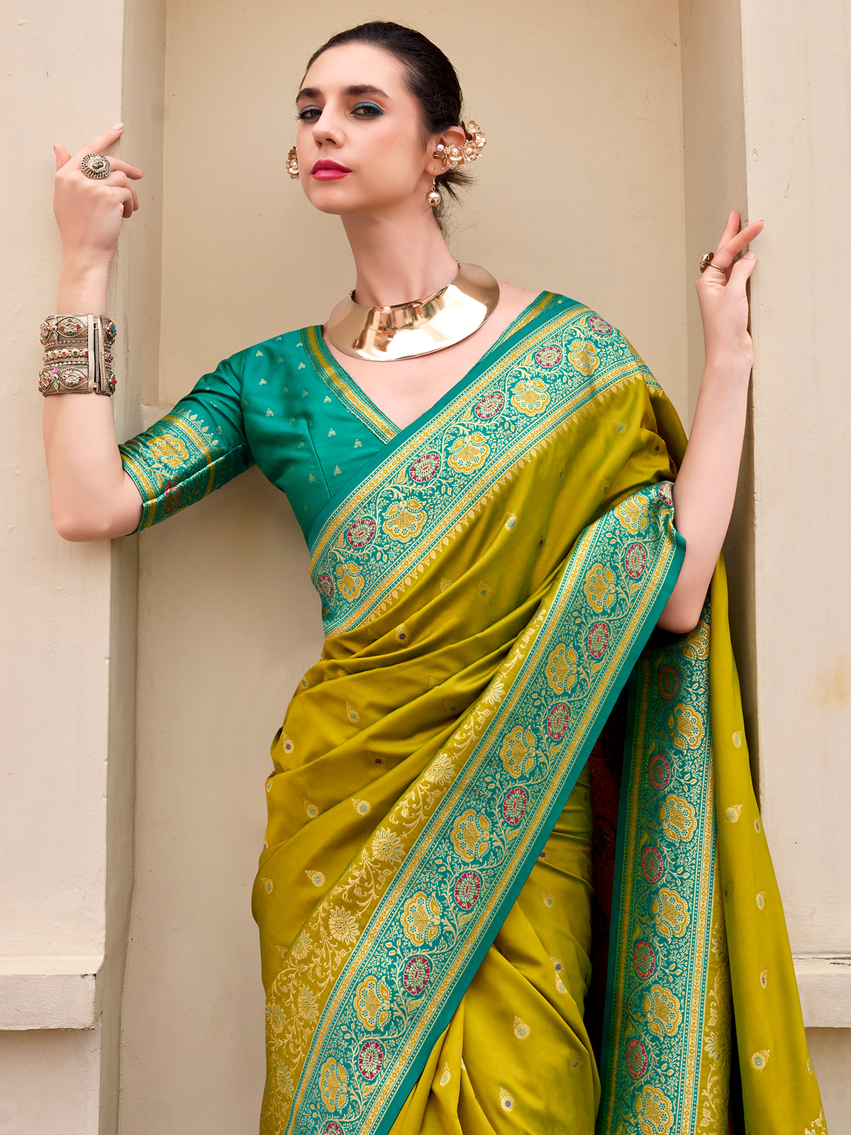 Designed for understated luxury, this elegant olive women saree features pure soft banarasi silk highlighted by luminous gold and silver zari detailing. Carefully woven motifs lend depth and richness to the fabric. Finished with an unstitched blouse, it is ideal for weddings, festive evenings, and elegant sangeet celebrations.
