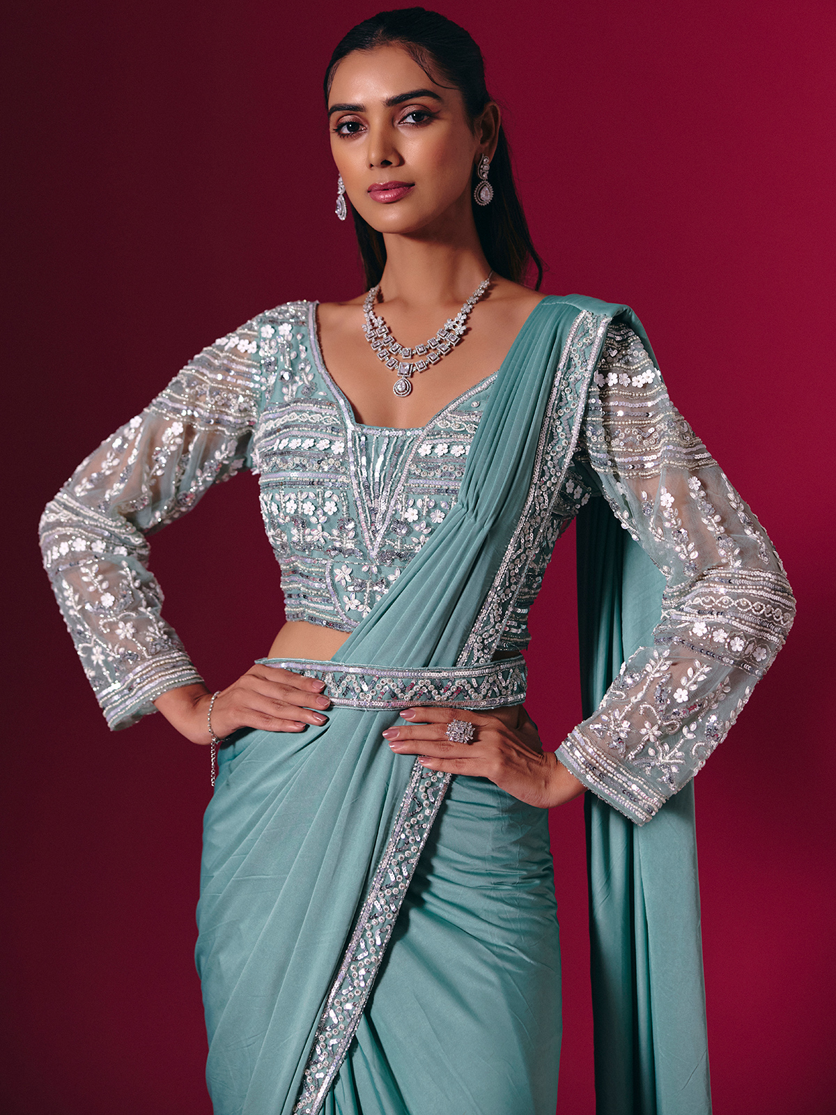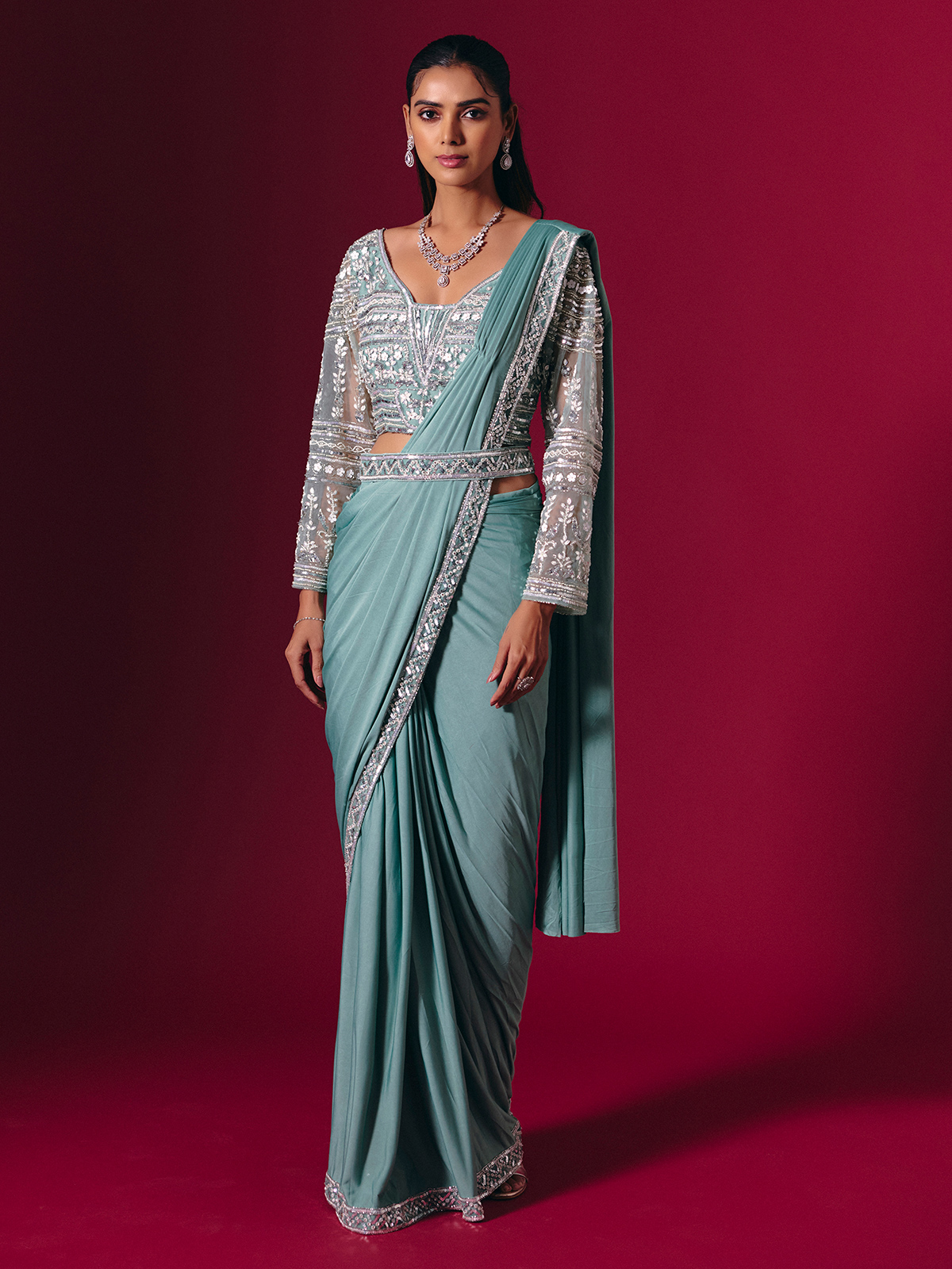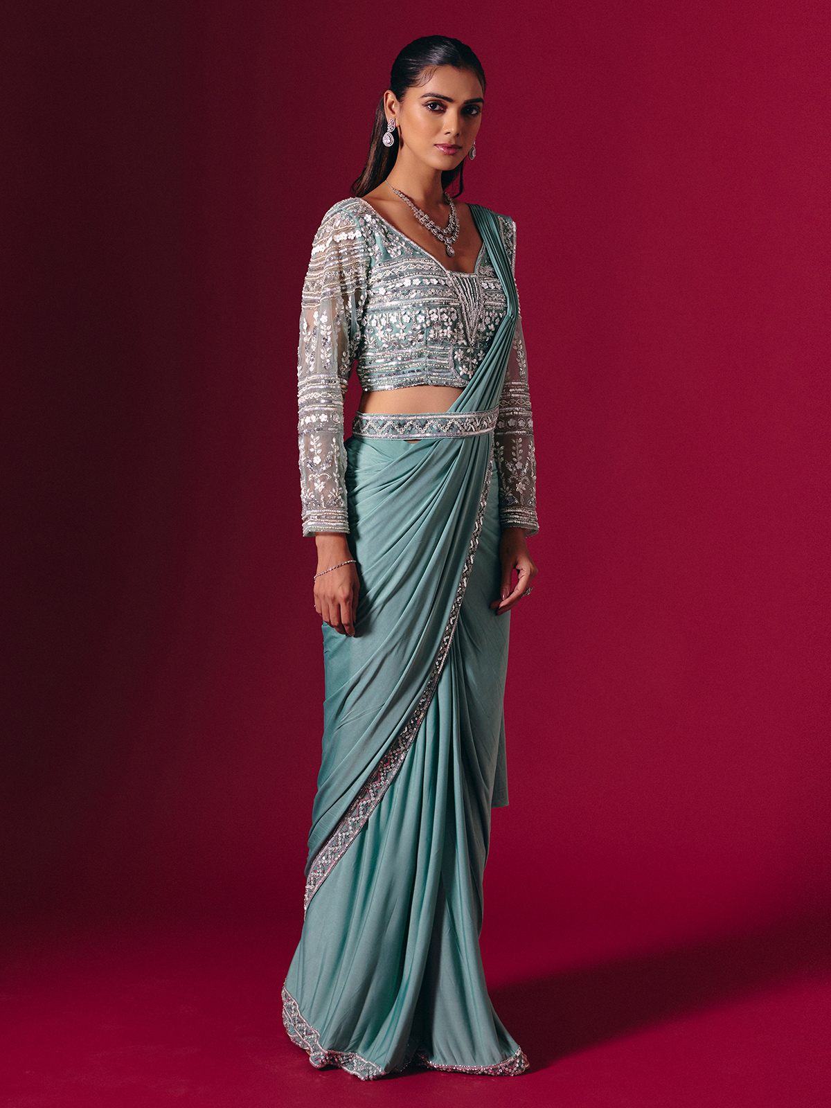 This refined sage green saree showcases cutdana, beads, sequins, diamonds, and pearls for an opulent festive look. The designer waist belt completes the silhouette with elegance. Ideal for weddings, receptions, and celebratory gatherings.