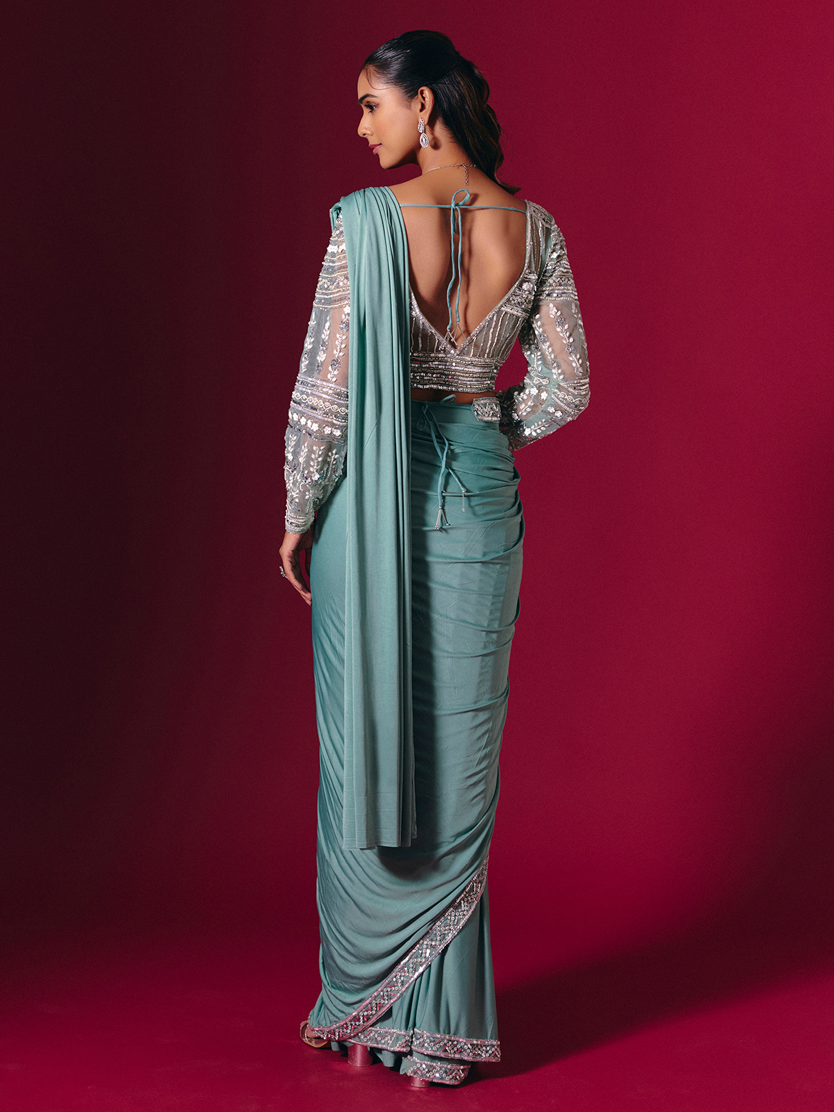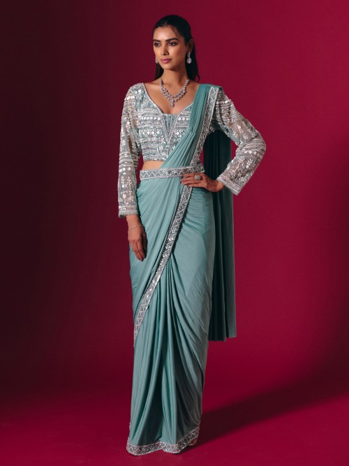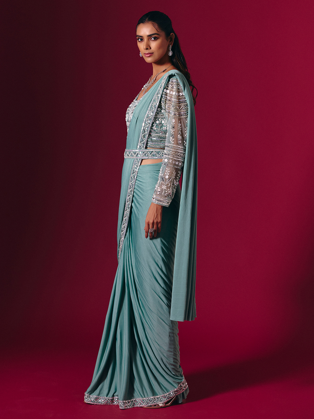 This refined sage green saree showcases cutdana, beads, sequins, diamonds, and pearls for an opulent festive look. The designer waist belt completes the silhouette with elegance. Ideal for weddings, receptions, and celebratory gatherings.