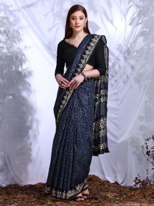 Stone Blue Printed Saree In Bhagalpuri Silk