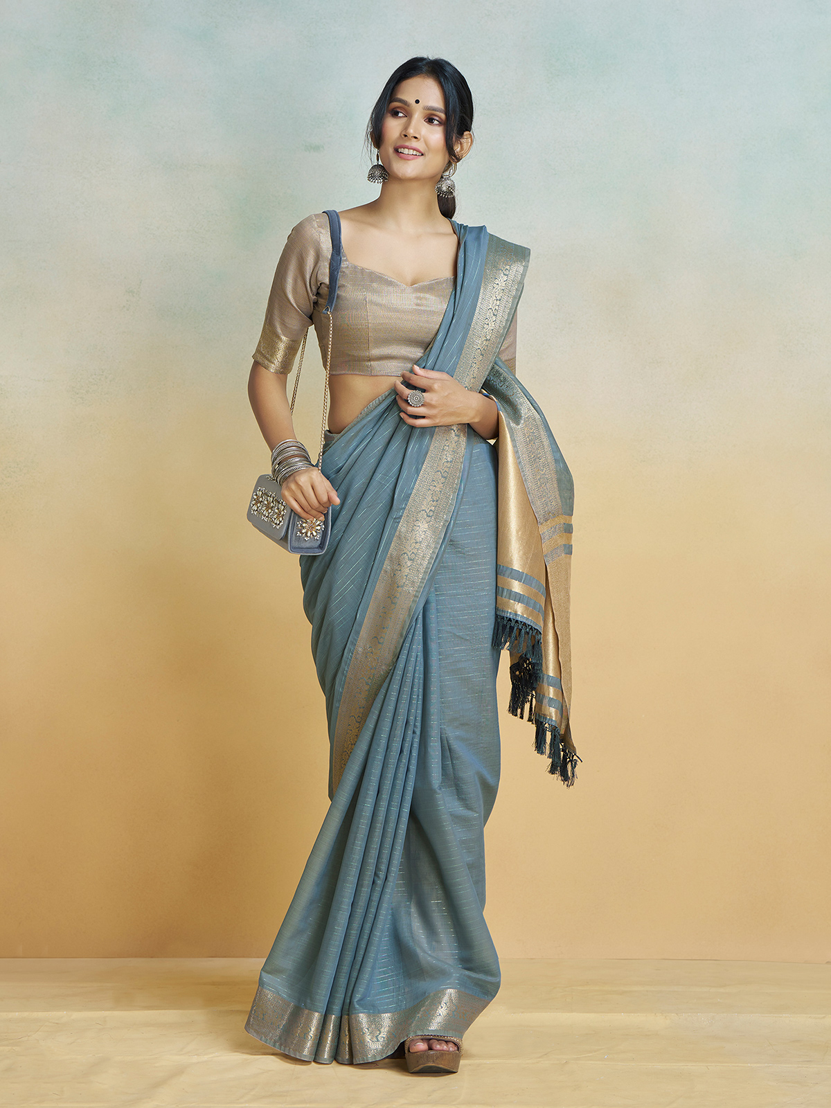 Stone blue silk adorned with fine zari weaving brings sophistication and festive charm. The unstitched blouse ensures a perfect fit for any wearer, while the elegant drape adds effortless grace. Perfect for weddings, receptions, and festive occasions, this saree is a celebration of luxury and traditional artistry.