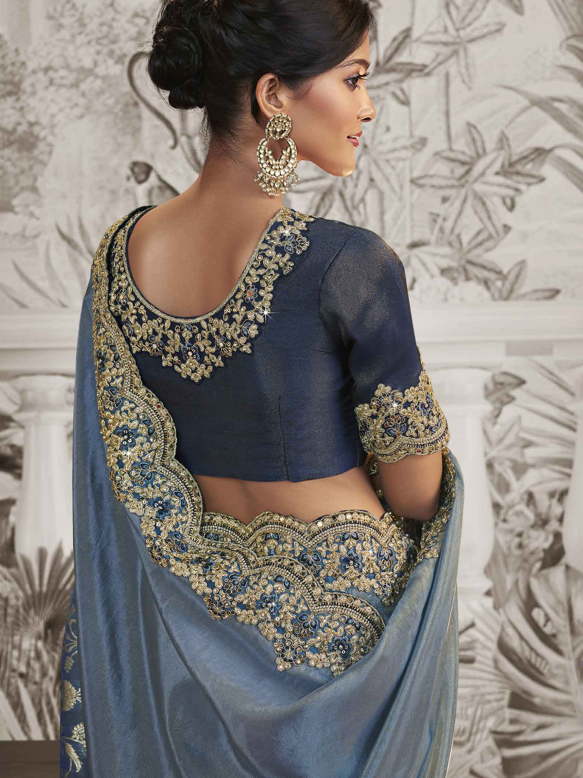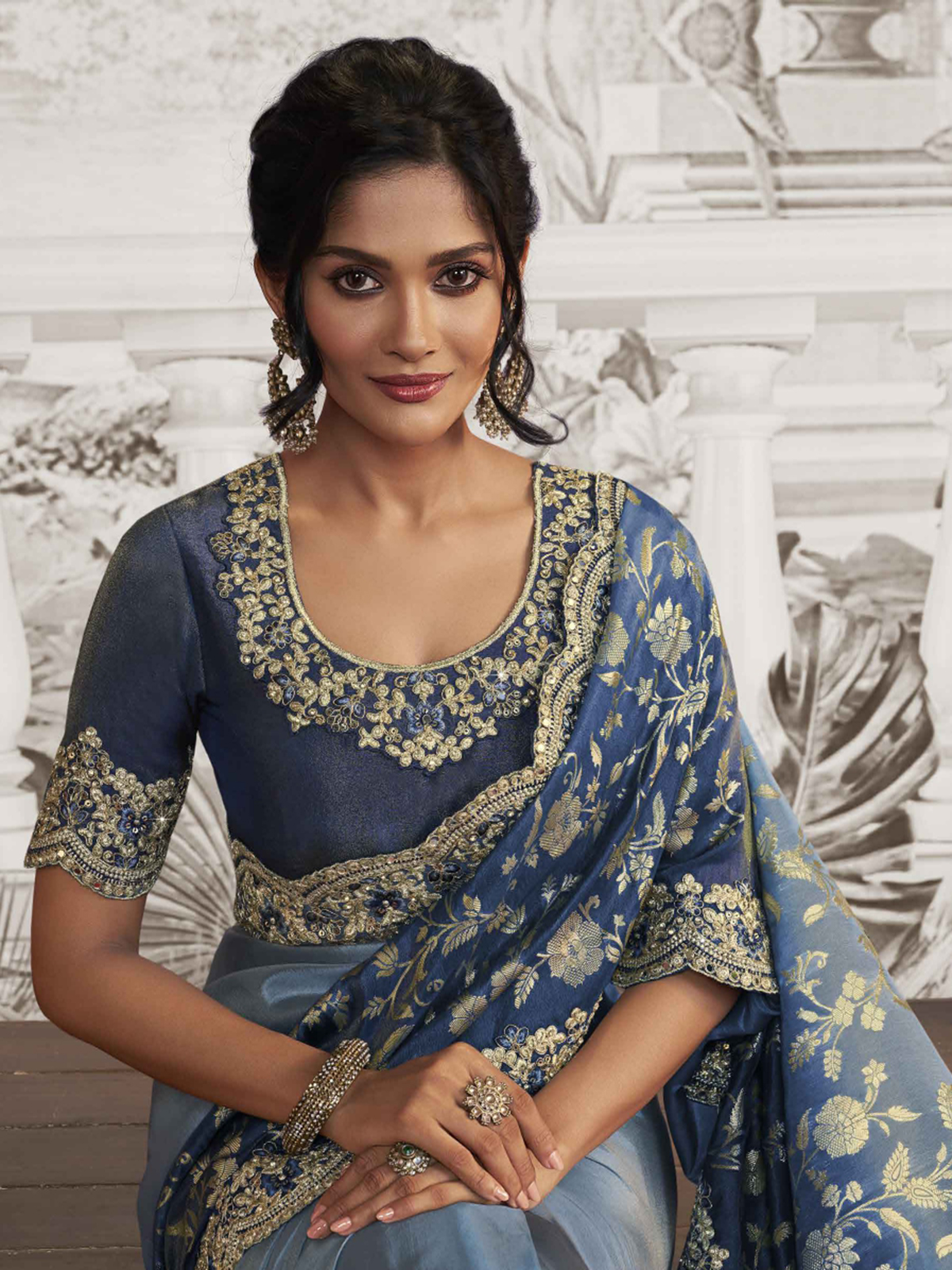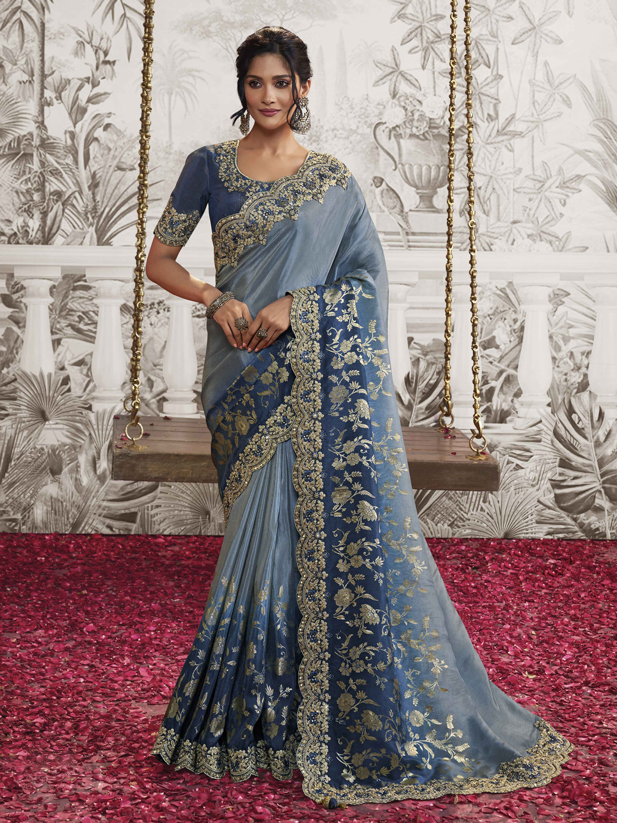 Experience regal charm in this shaded stone blue silk saree, enhanced by intricate zari and a dazzling border of embroidery, sequins, mirror, stones, and resham. The accompanying blouse mirrors the grandeur, making it a showstopper for weddings and grand traditional events.