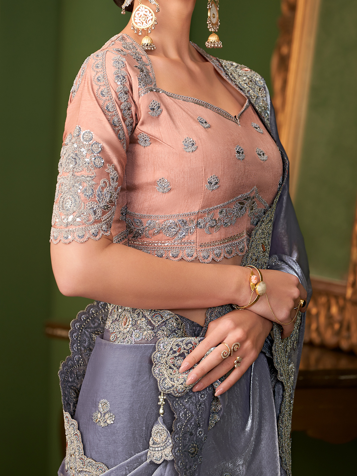 Rendered in sophisticated stone grey satin georgette silk saree. Showcases detailed embroidery with sequins, zardosi and thread accents. Paired with a contrast unstitched blouse piece, it delivers a polished ethnic look suitable for weddings, receptions, sangeet and festivities.