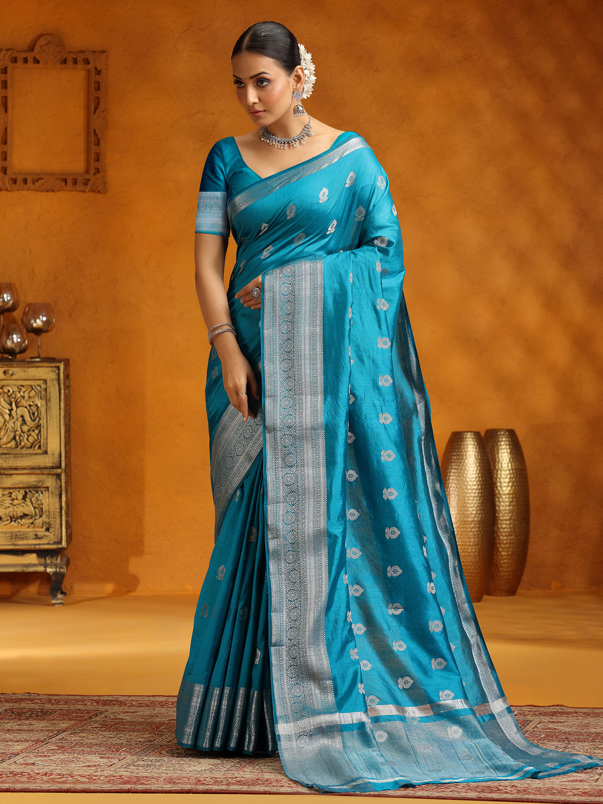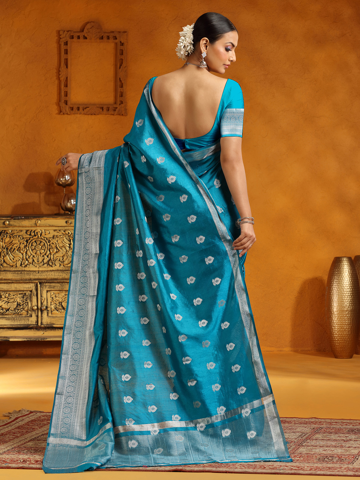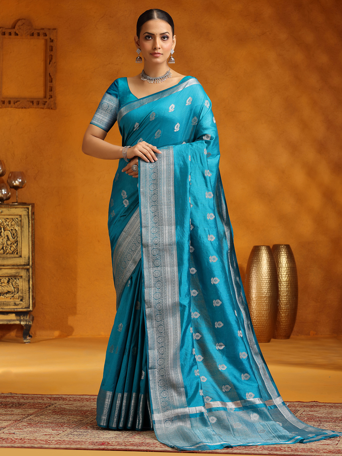 Balance tradition and trend with this silver zari aqua silk saree. Comes with an unstitched blouse.