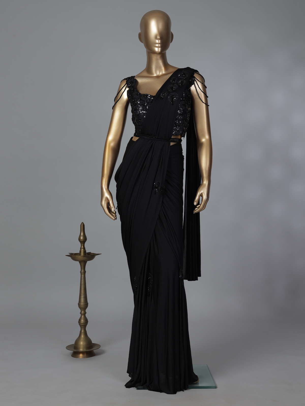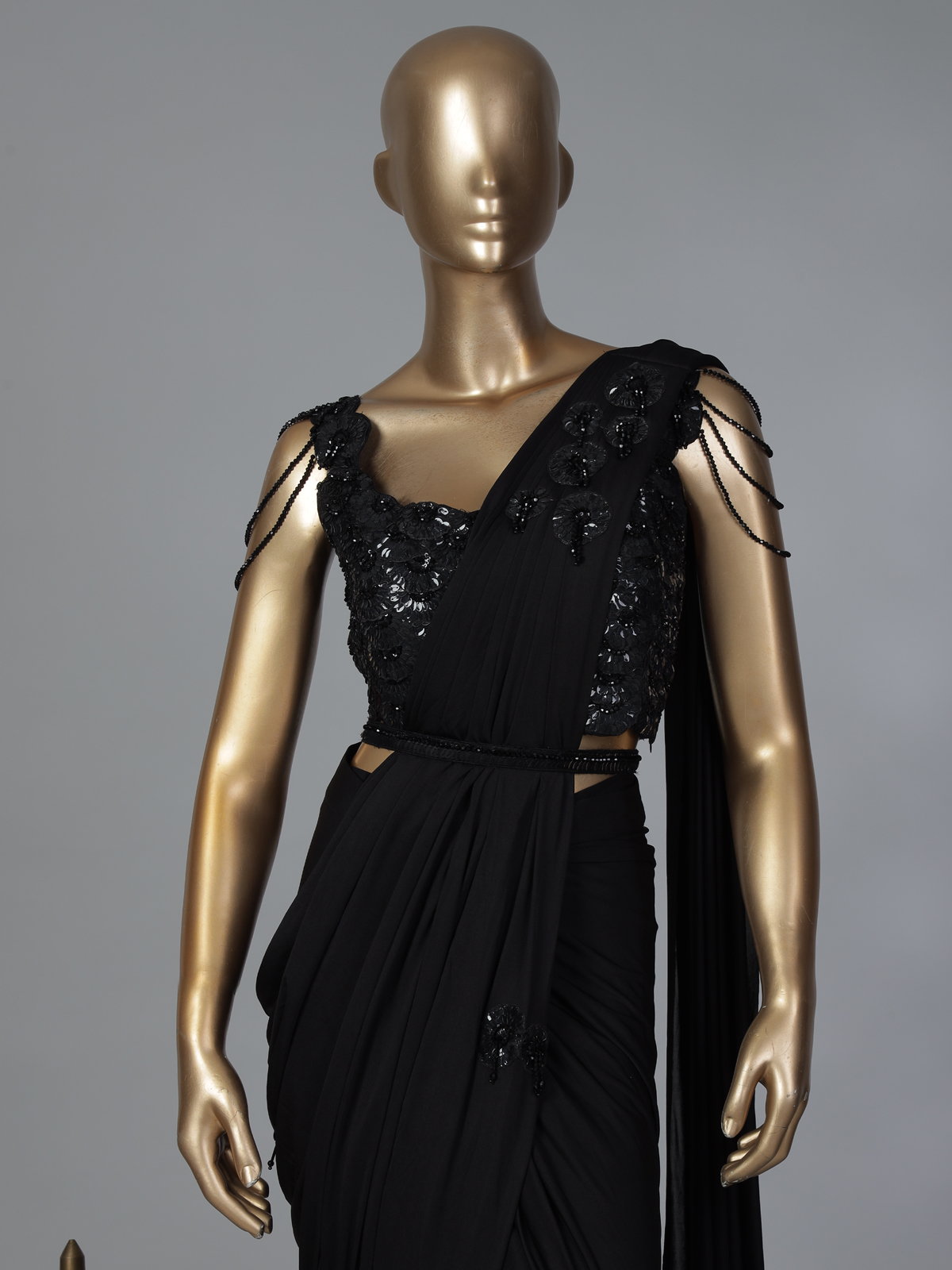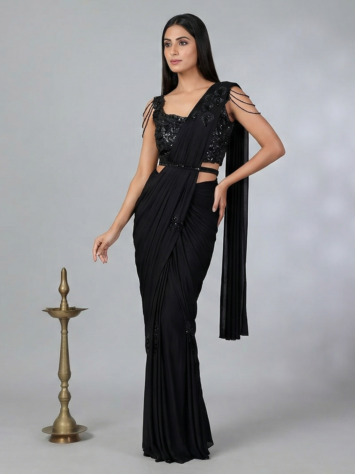 Bold and striking, this black lycra ready-to-wear saree creates a captivating festive statement. The sleeveless square-neck blouse is adorned with shimmering sequins, cutdana, and beads that enhance its brilliance. The belt defines the silhouette, making it perfect for receptions and evening events.