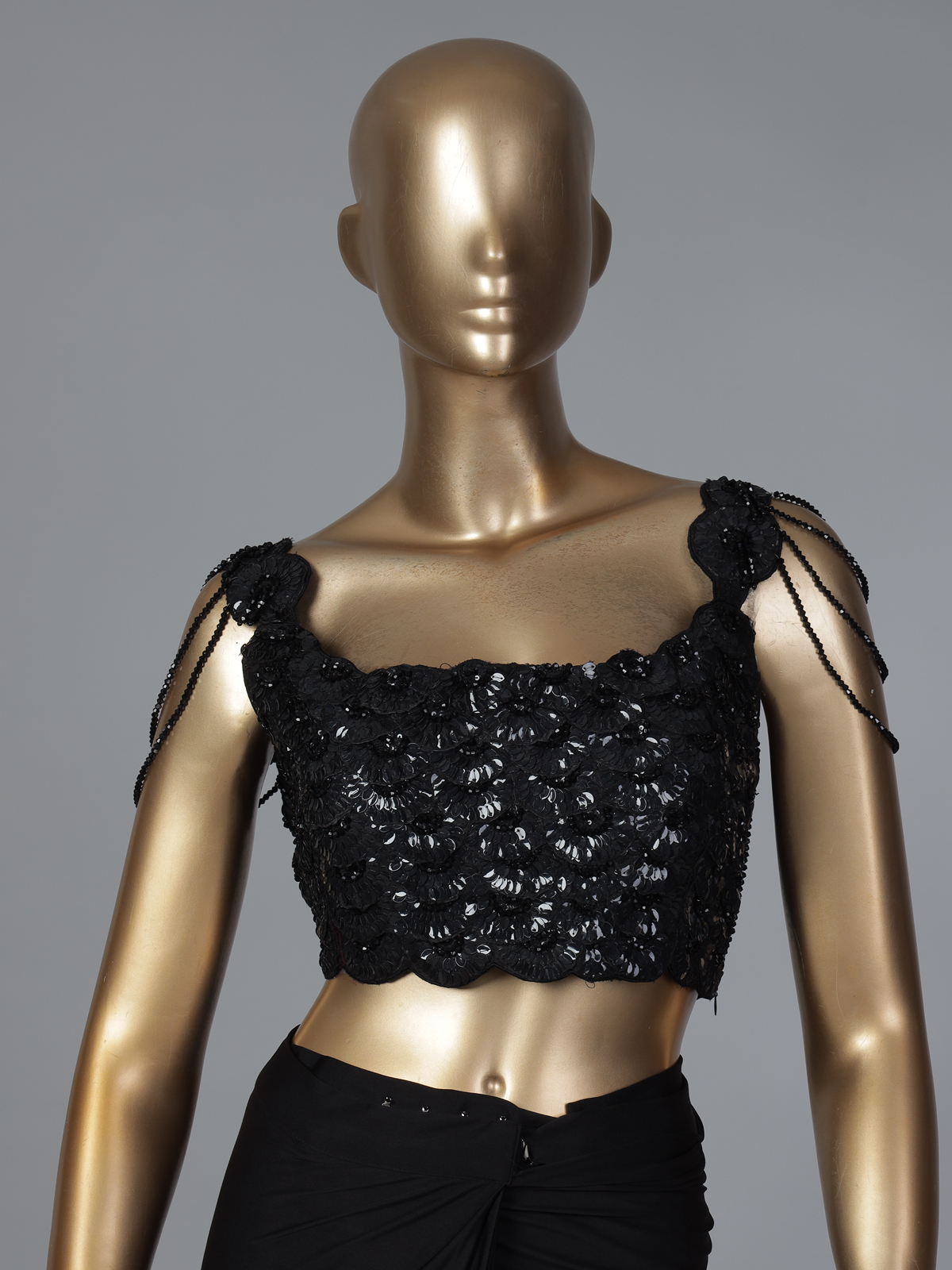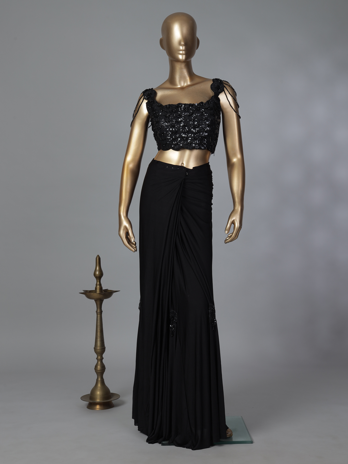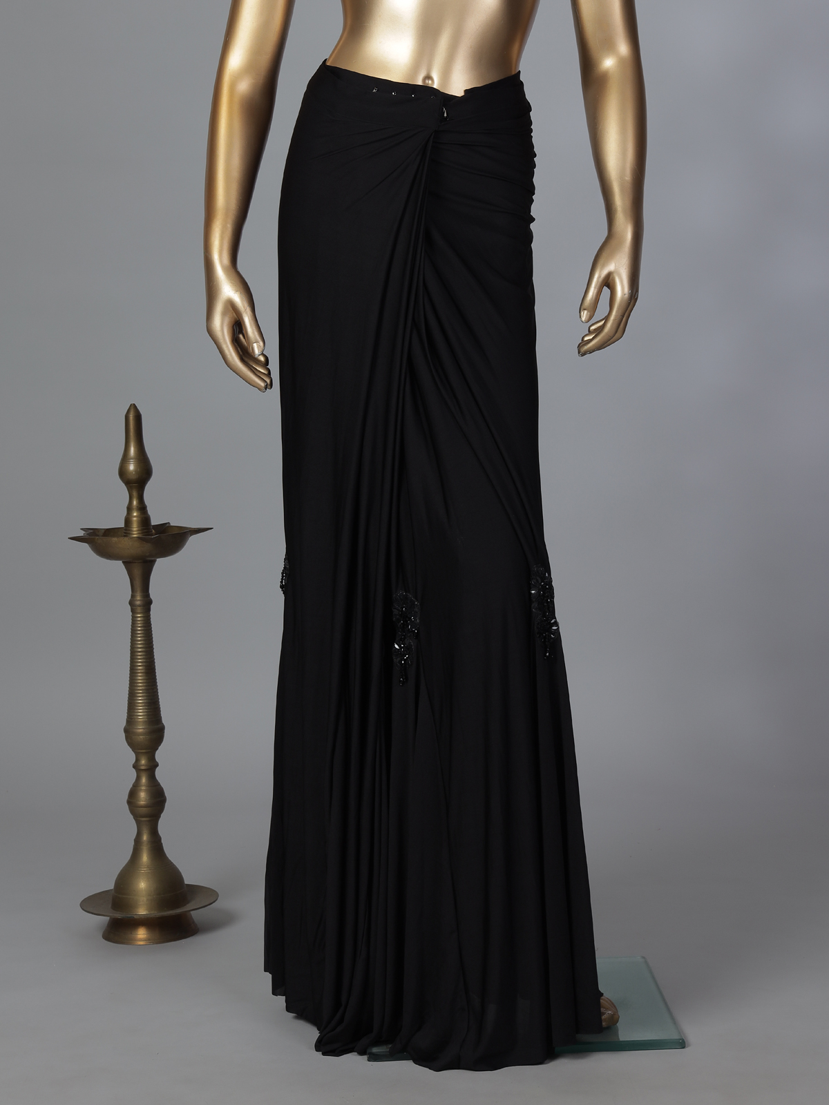 Bold and striking, this black lycra ready-to-wear saree creates a captivating festive statement. The sleeveless square-neck blouse is adorned with shimmering sequins, cutdana, and beads that enhance its brilliance. The belt defines the silhouette, making it perfect for receptions and evening events.