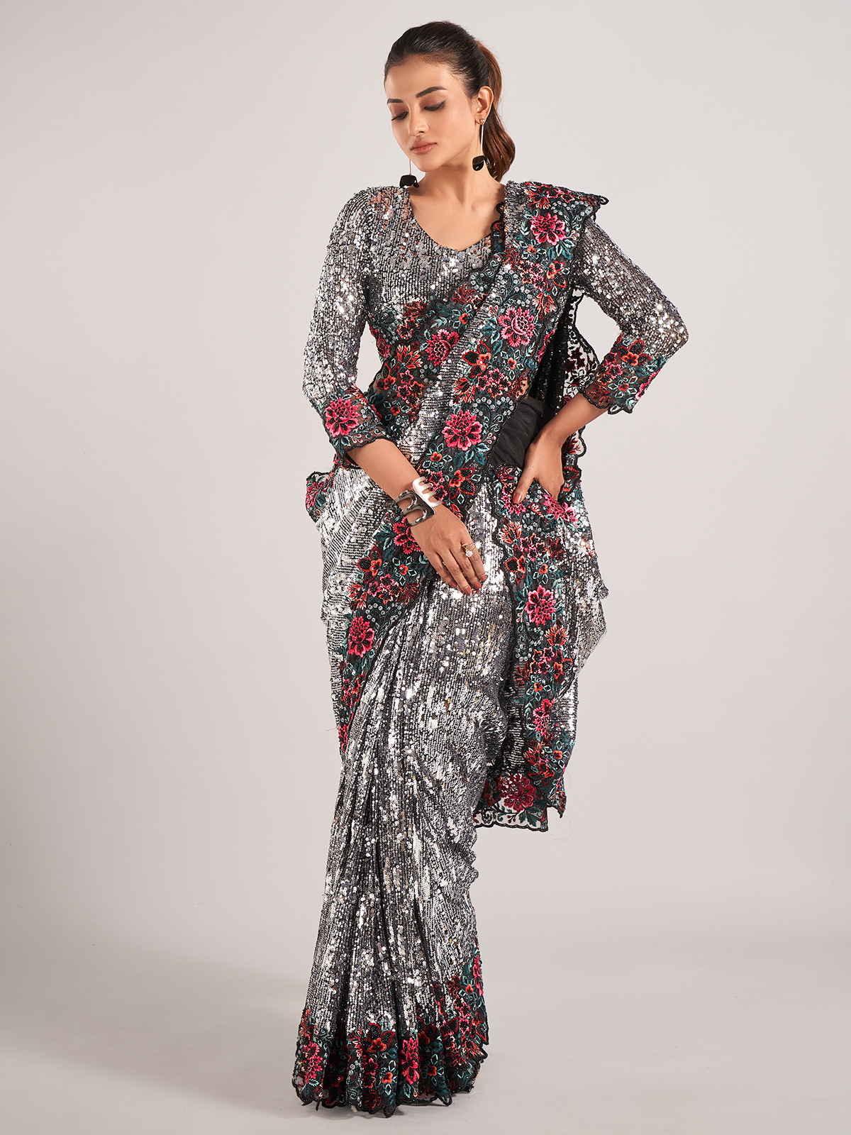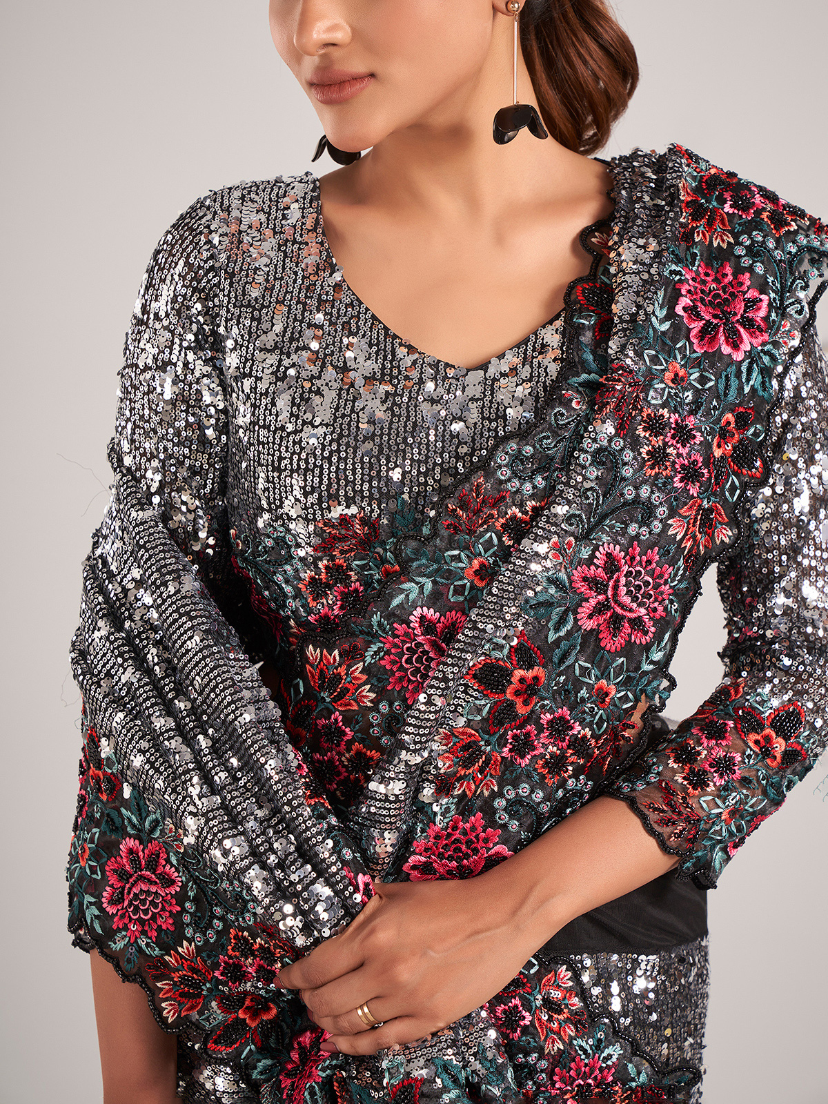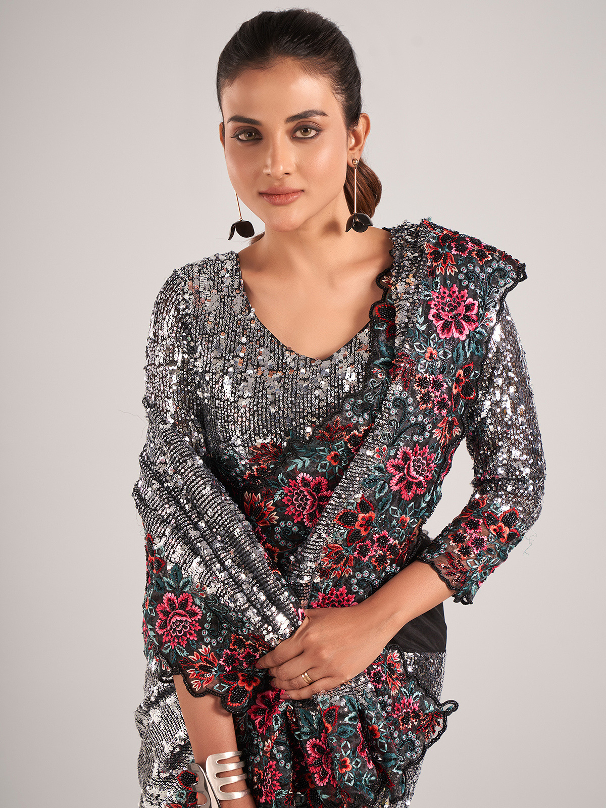 Elevate your look for your next function with our stunning black net saree, embellished with intricate embroidery, sequins, and cutdana work. The beautiful detailing adds a touch of glamour and sophistication, making it a captivating choice for any special occasion. Complete with a ready-made blouse, this saree offers both style and convenience, ensuring you make a lasting impression.