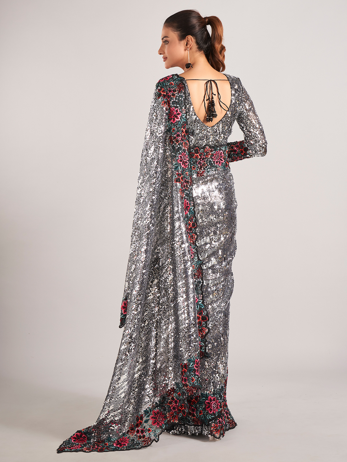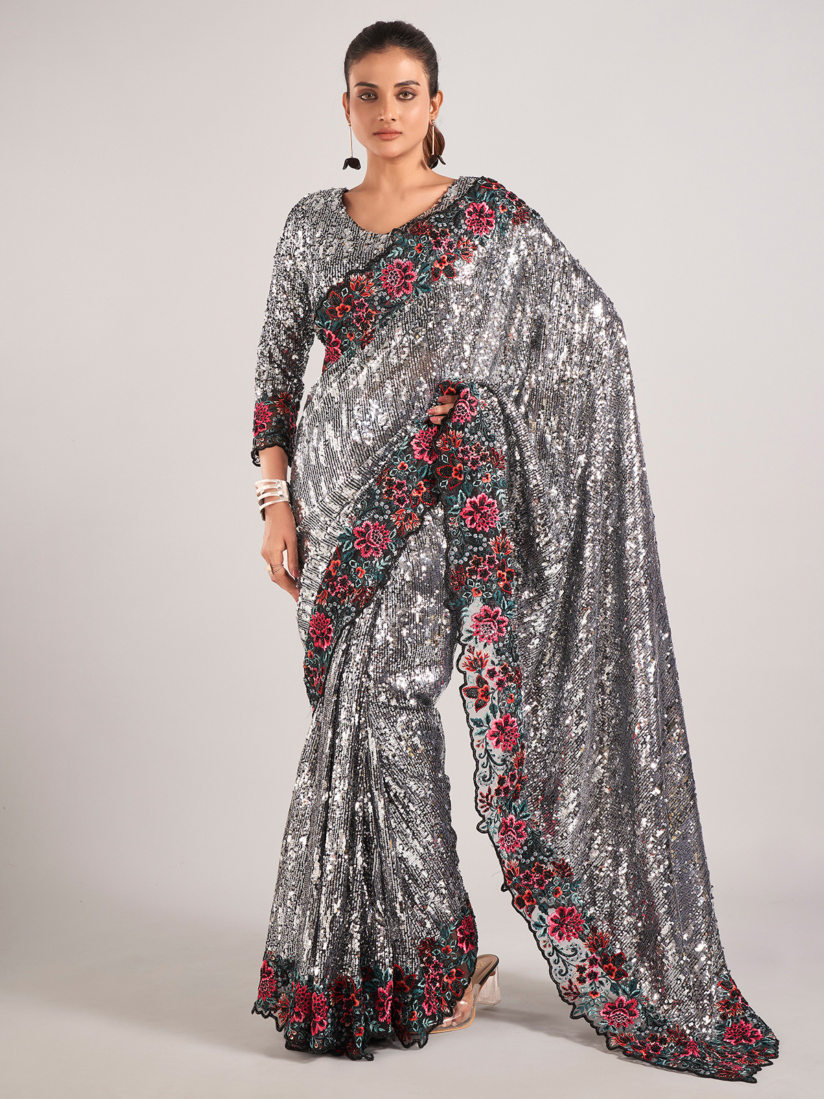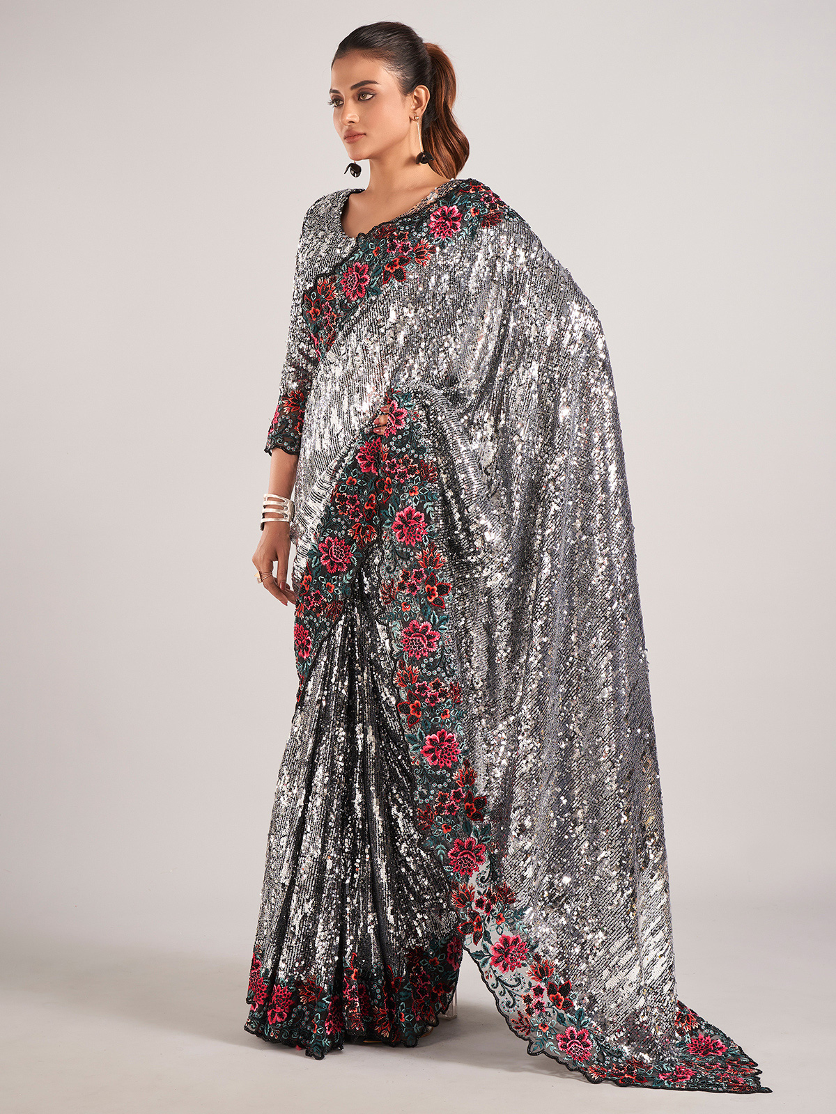 Elevate your look for your next function with our stunning black net saree, embellished with intricate embroidery, sequins, and cutdana work. The beautiful detailing adds a touch of glamour and sophistication, making it a captivating choice for any special occasion. Complete with a ready-made blouse, this saree offers both style and convenience, ensuring you make a lasting impression.