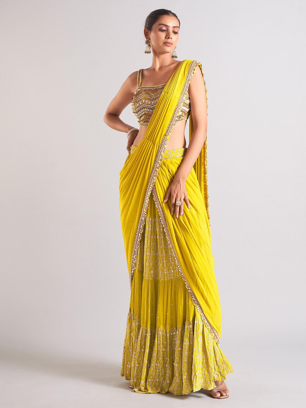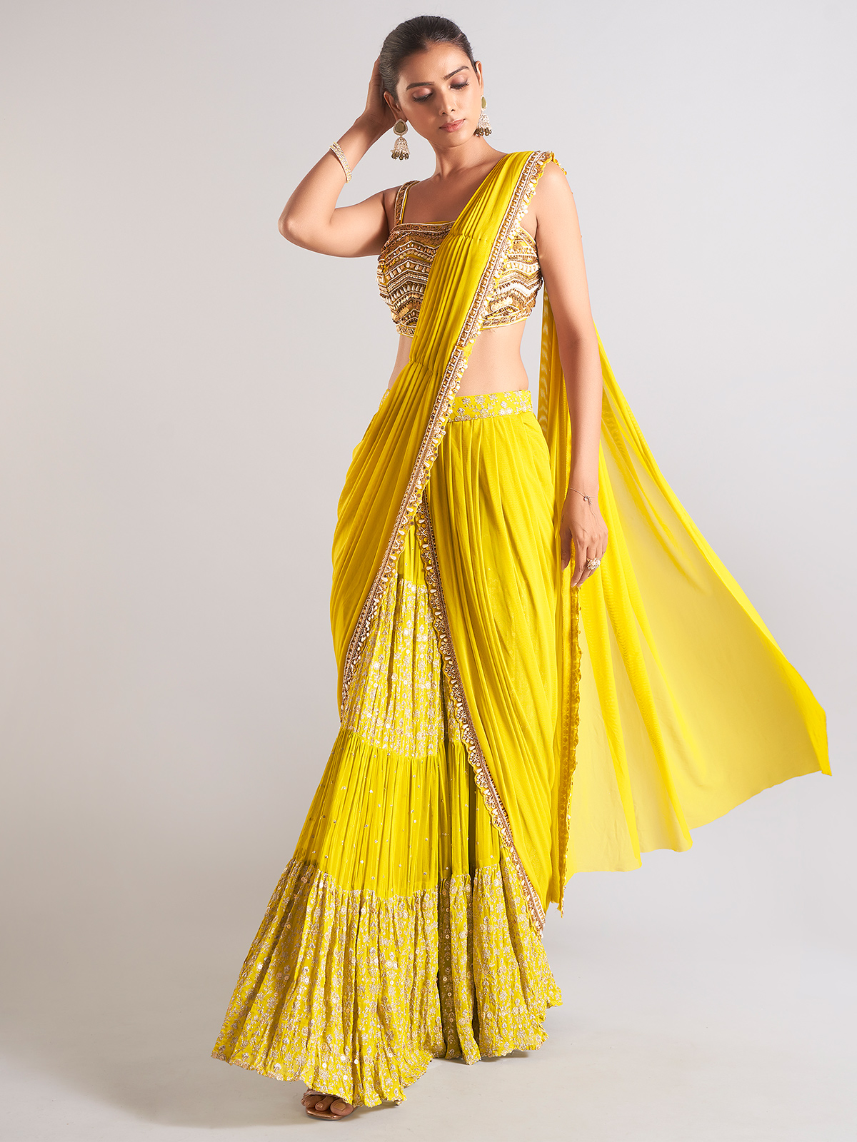Enhance your ethnic charm with this classy yellow georgette ready-to-wear saree. Embellished with coins, beads, sequins, resham, and zardosi, it stands out as a unique choice. Includes a ready-made blouse for convenience.