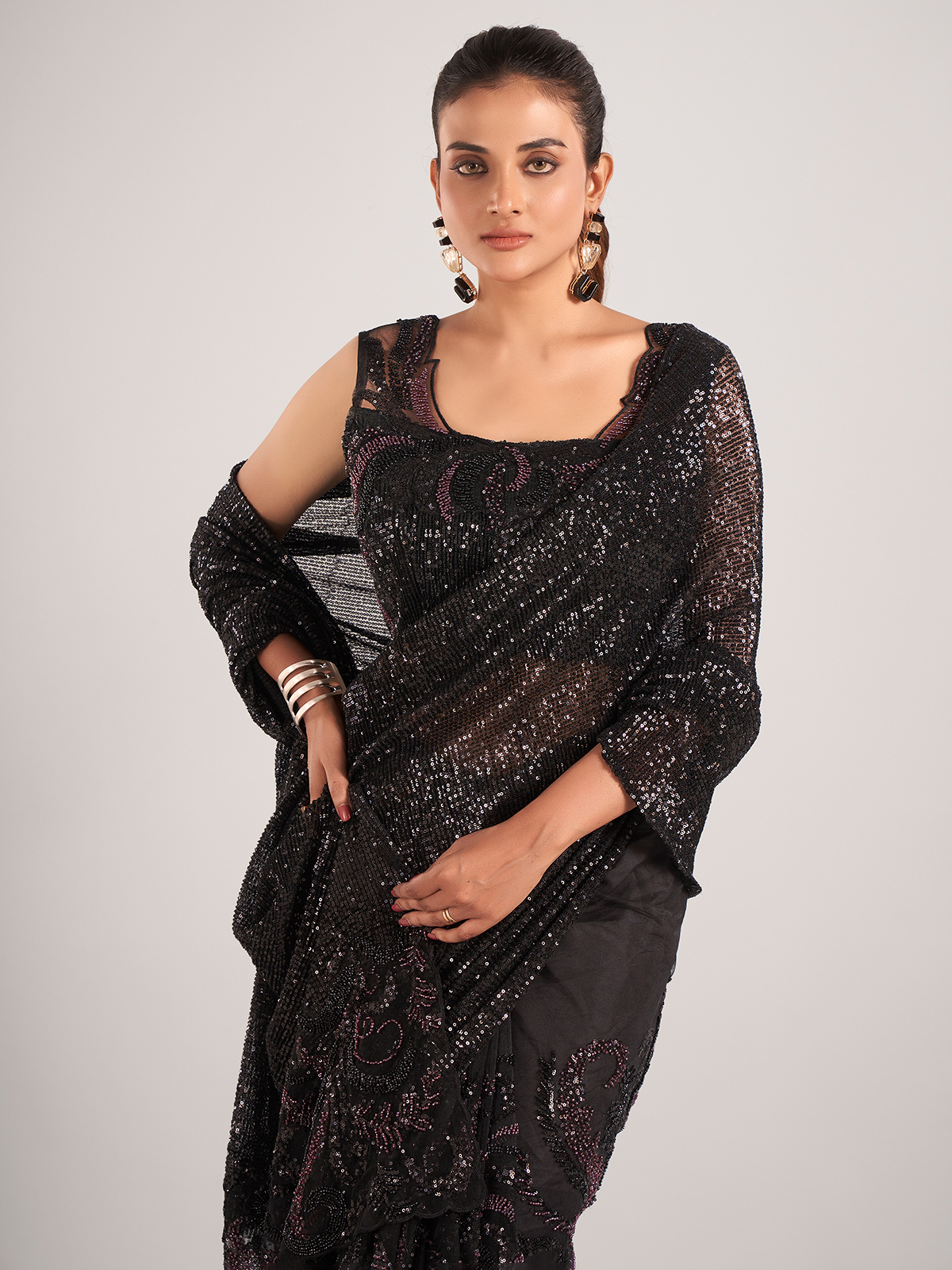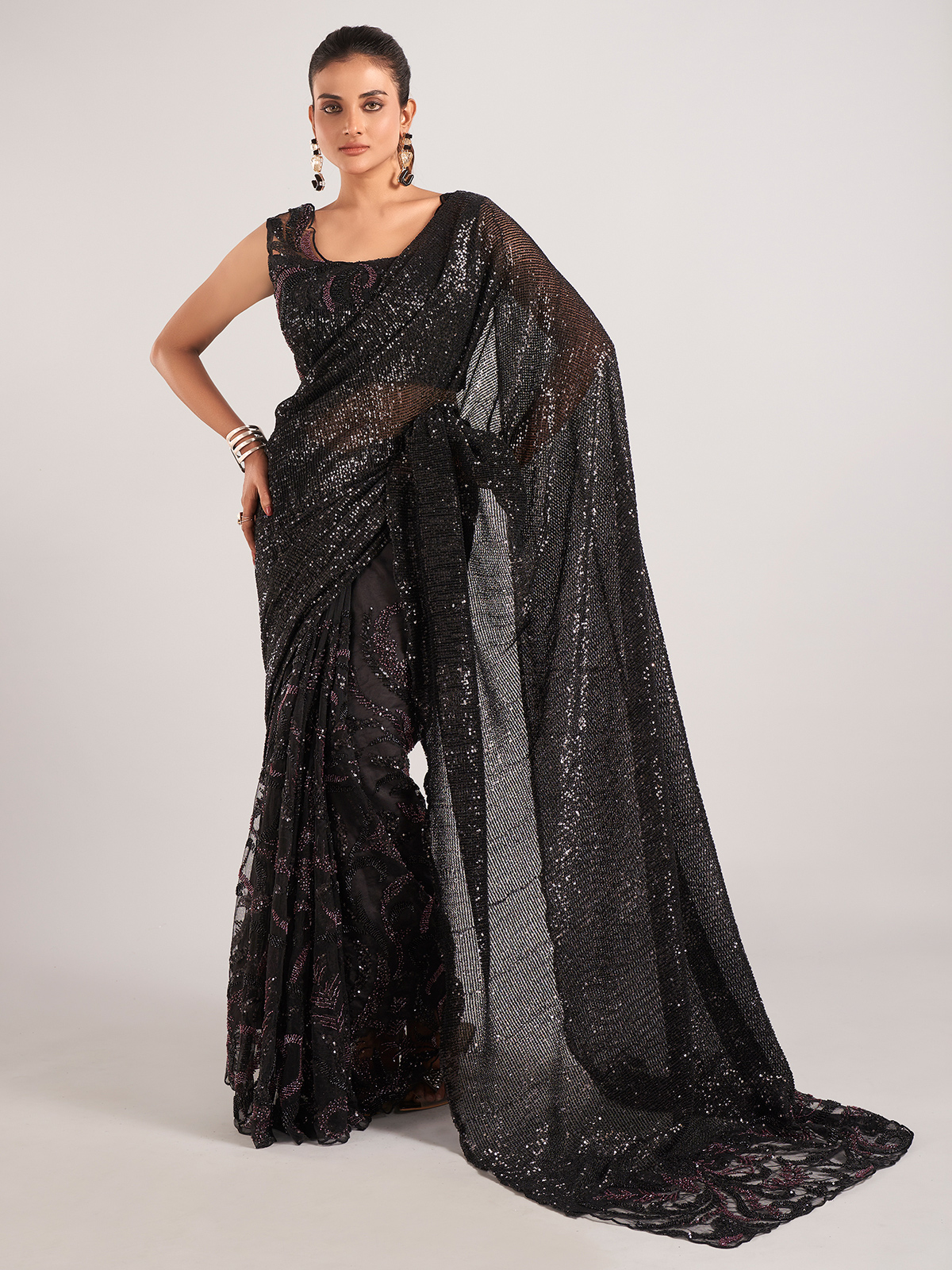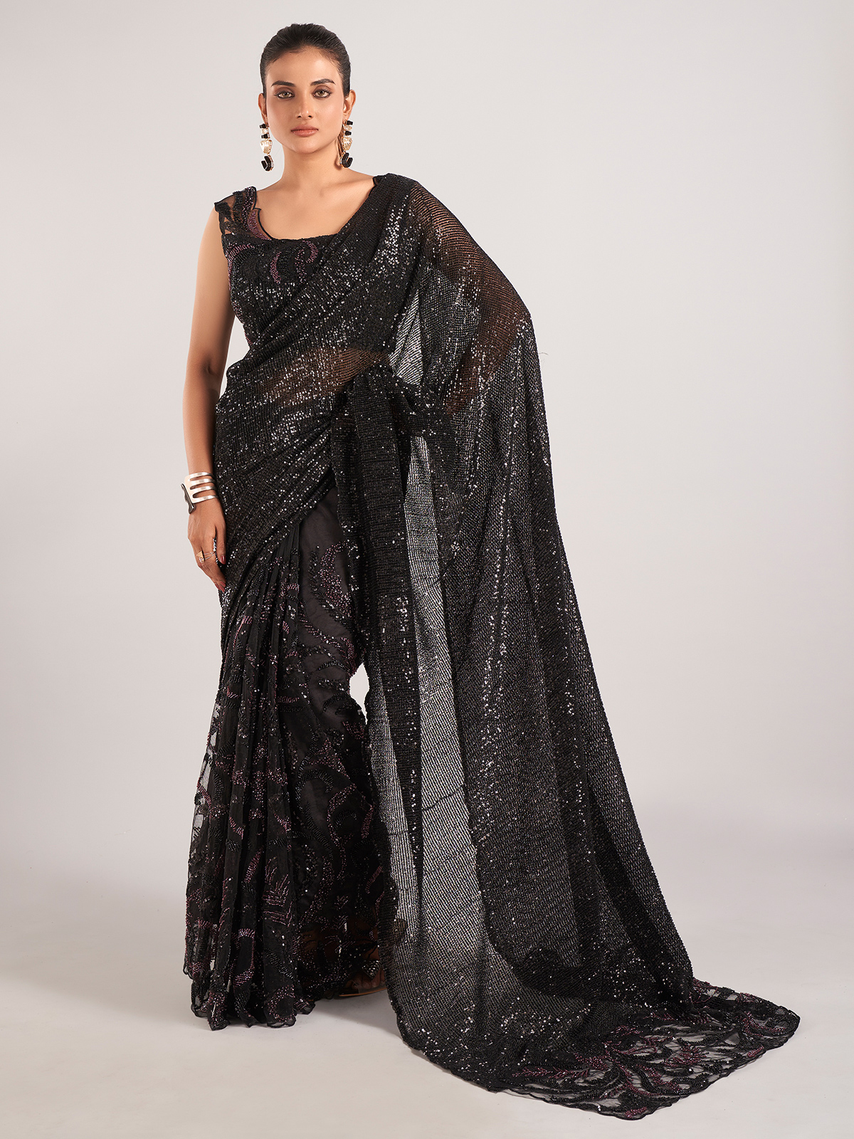 Easy to style and comfortable to wear, this black net designer saree is perfect for any occasion where you want to make a chic statement. Adorned with intricate cutdana, beads, and sequins work, it adds a touch of glamour and sophistication. Complete with a ready-made blouse, this saree offers both convenience and style, making it an essential addition to your wardrobe.