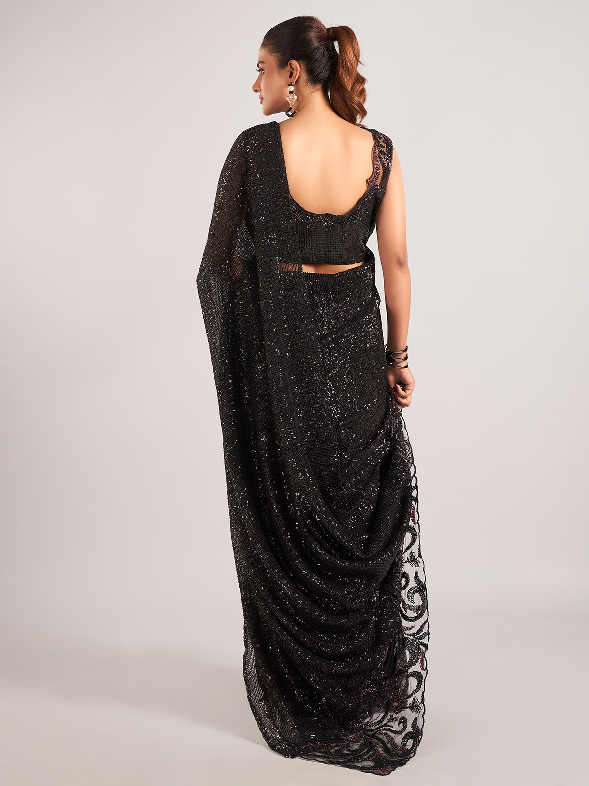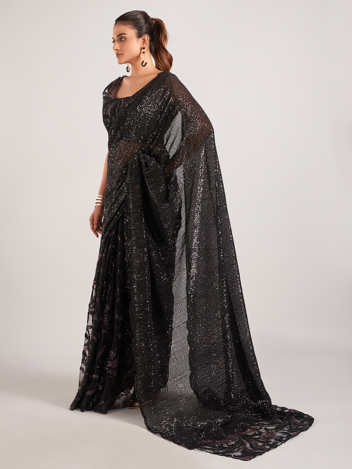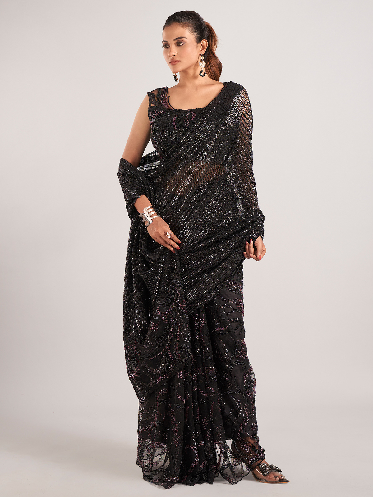 Easy to style and comfortable to wear, this black net designer saree is perfect for any occasion where you want to make a chic statement. Adorned with intricate cutdana, beads, and sequins work, it adds a touch of glamour and sophistication. Complete with a ready-made blouse, this saree offers both convenience and style, making it an essential addition to your wardrobe.