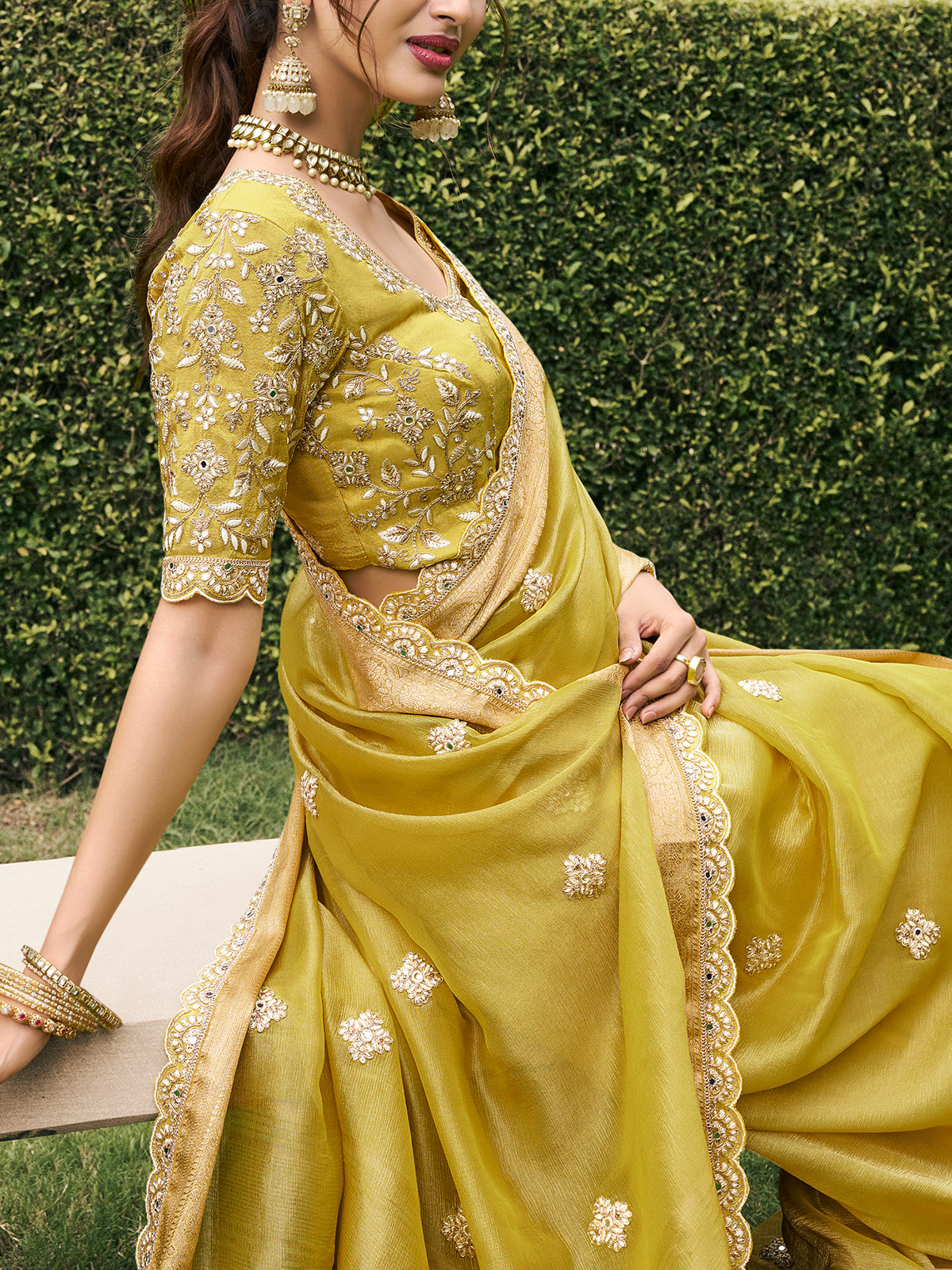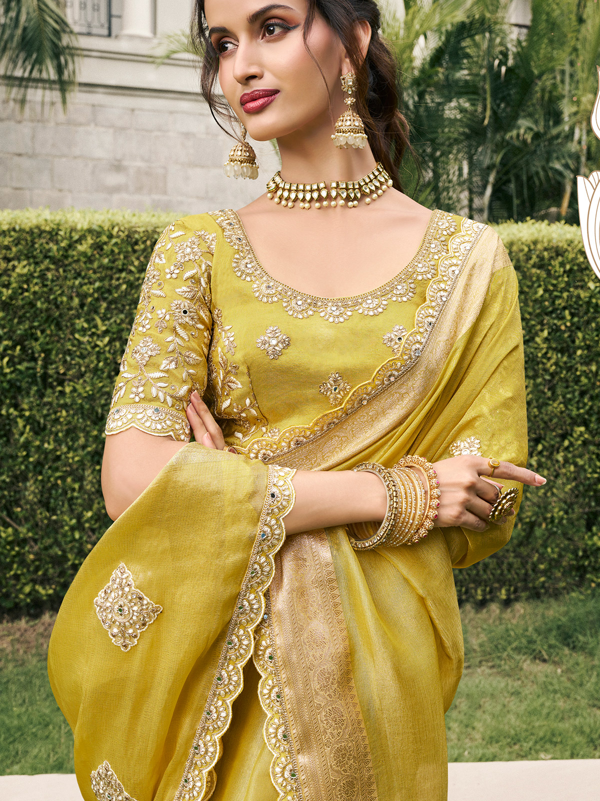 Sunlit Pastel Yellow Tissue Silk Saree For Wedding Wear