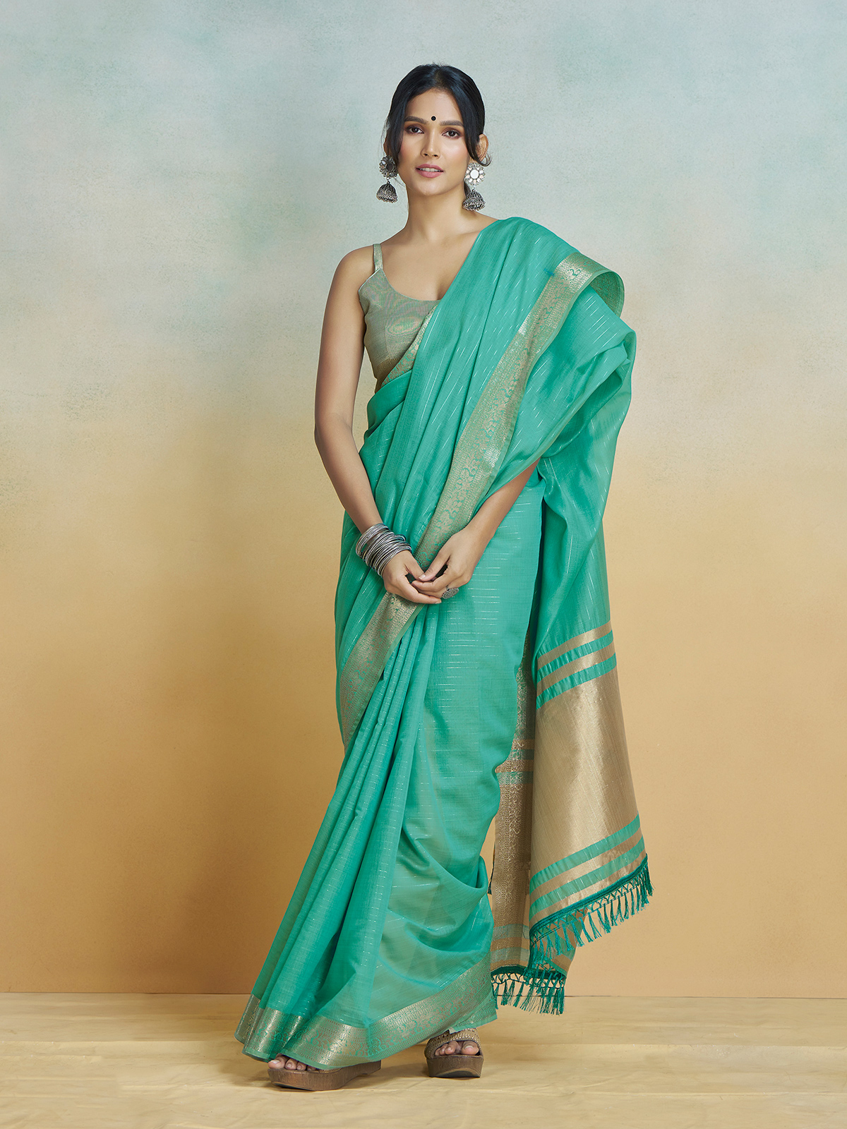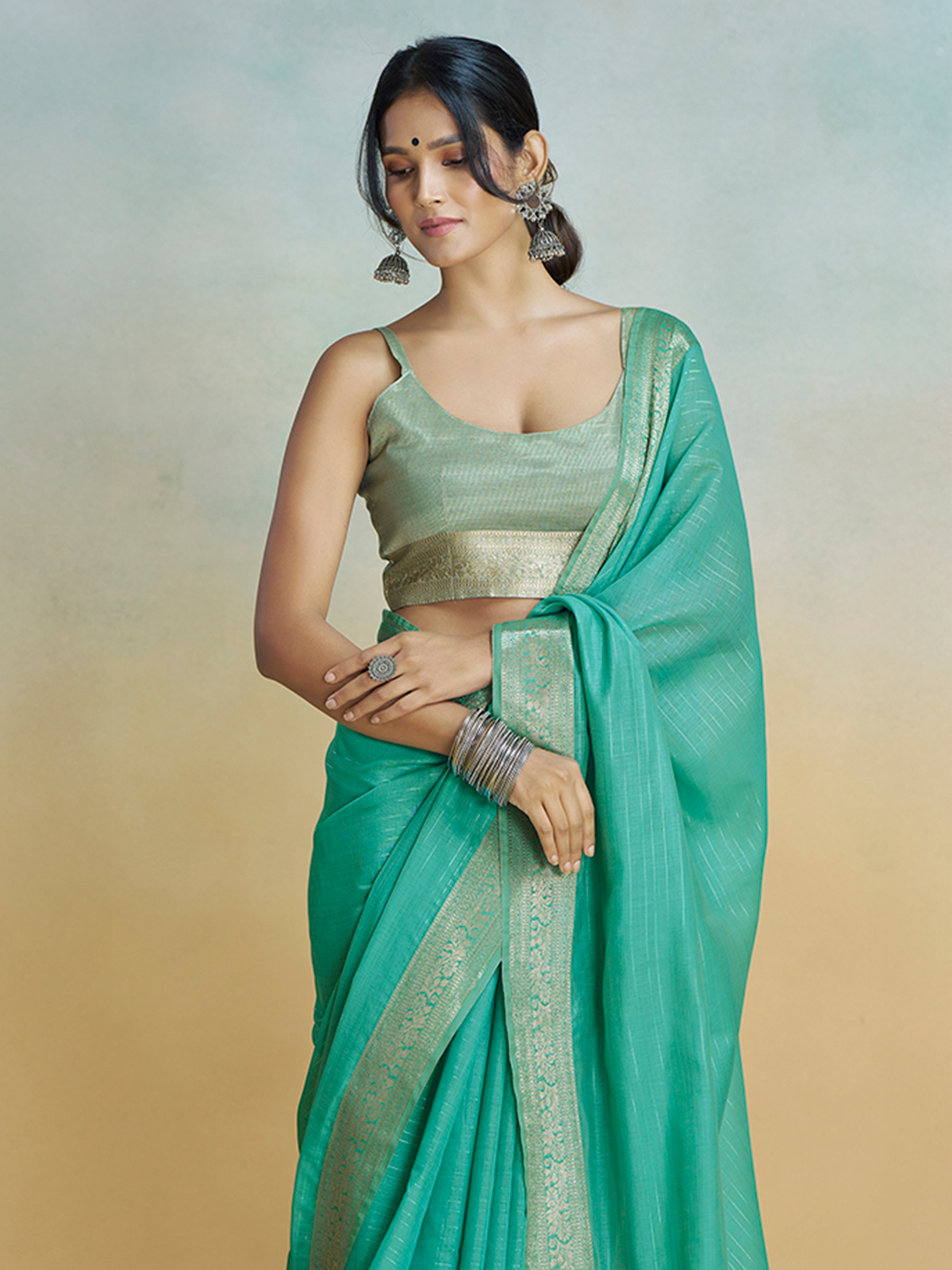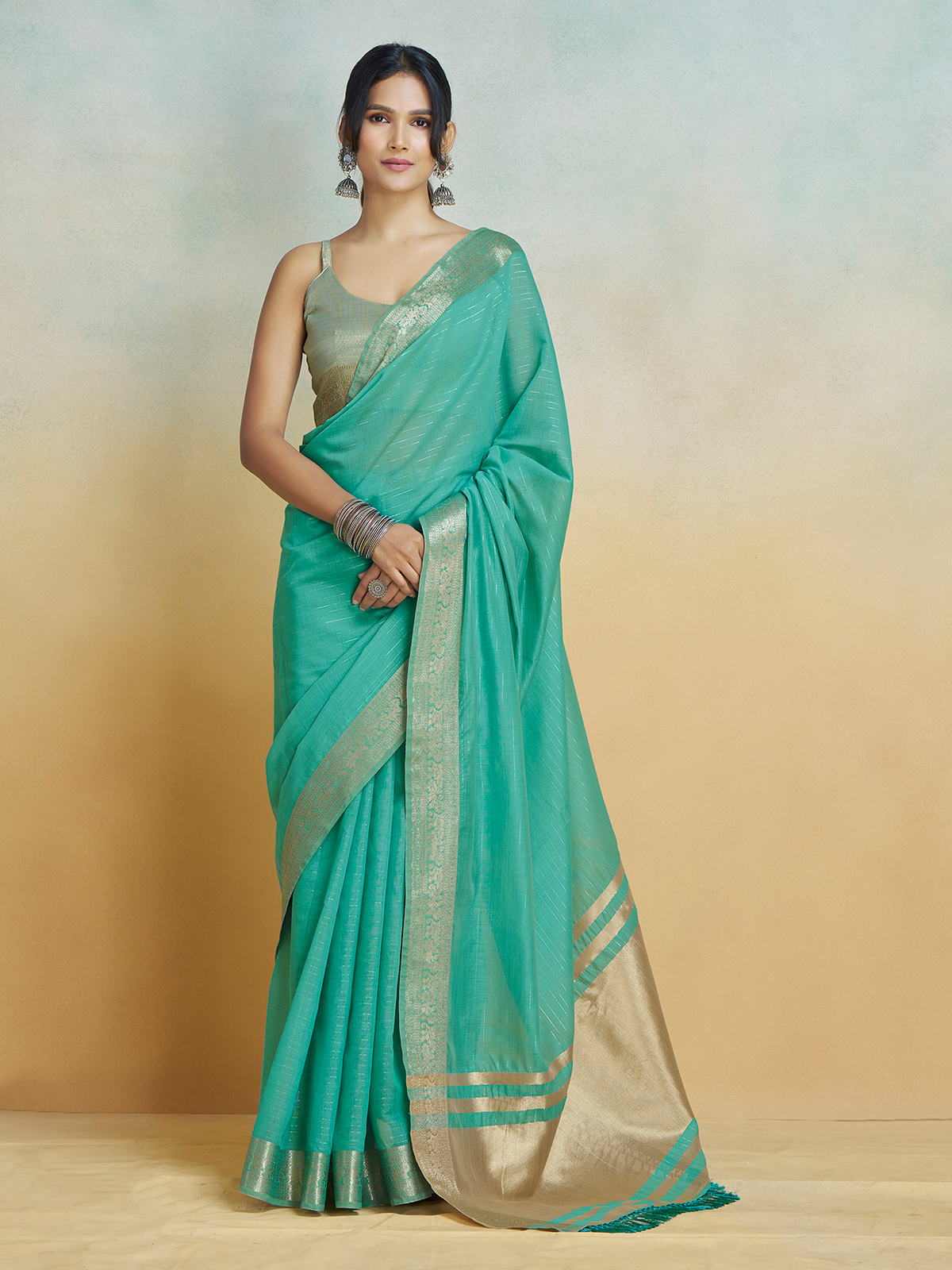 Radiant teal silk adorned with fine zari weaving brings a serene festive charm. The unstitched blouse allows a custom fit, enhancing the flowing drape. Ideal for wedding ceremonies, receptions, and festive celebrations, this saree marries intricate craftsmanship with a contemporary sense of style and sophistication.