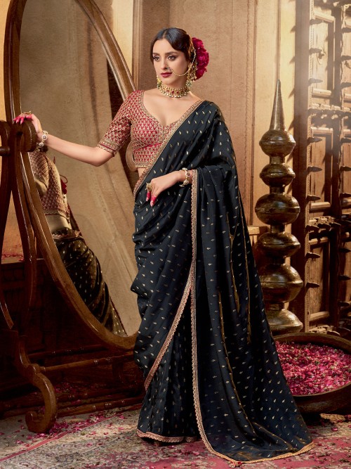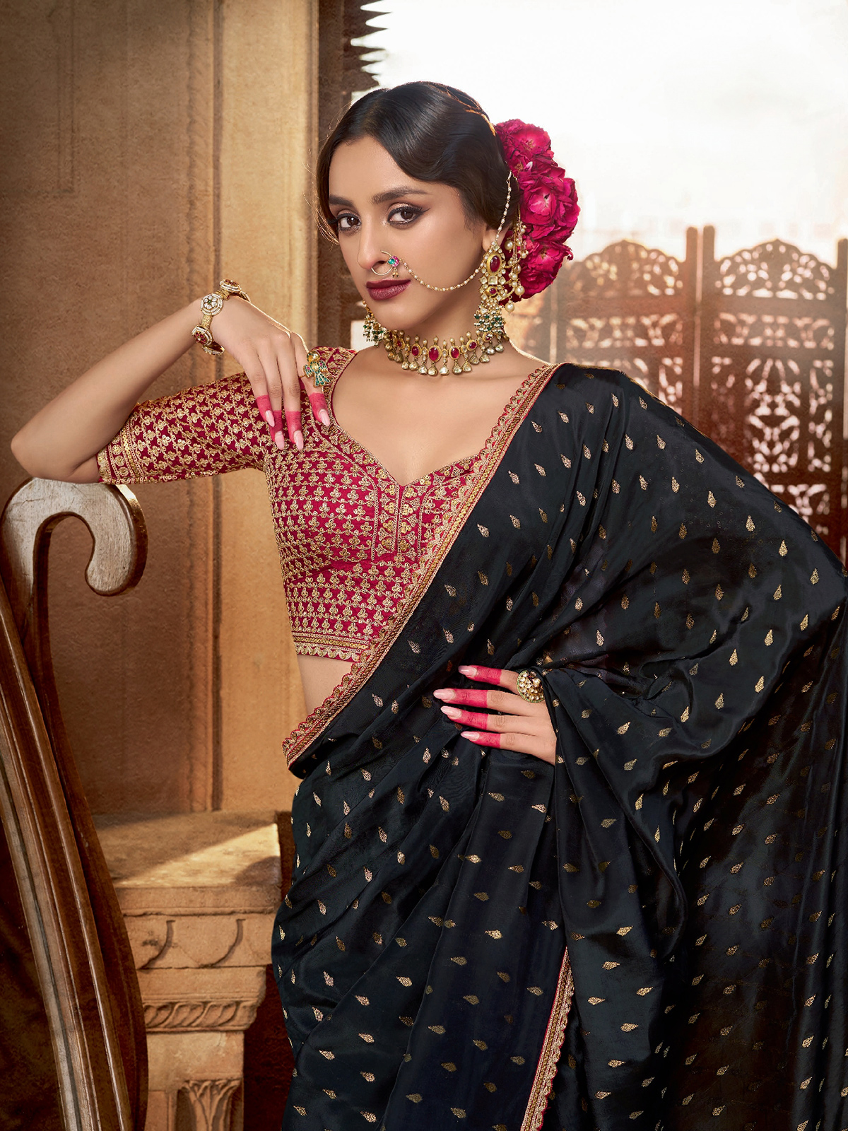 Elegant black viscose crepe silk saree adorned with resham, sequins, and zari in subtle butti weaving. A classic pick for weddings and festive events, it radiates sophistication. Includes an unstitched blouse piece for a tailored, personalized ensemble.