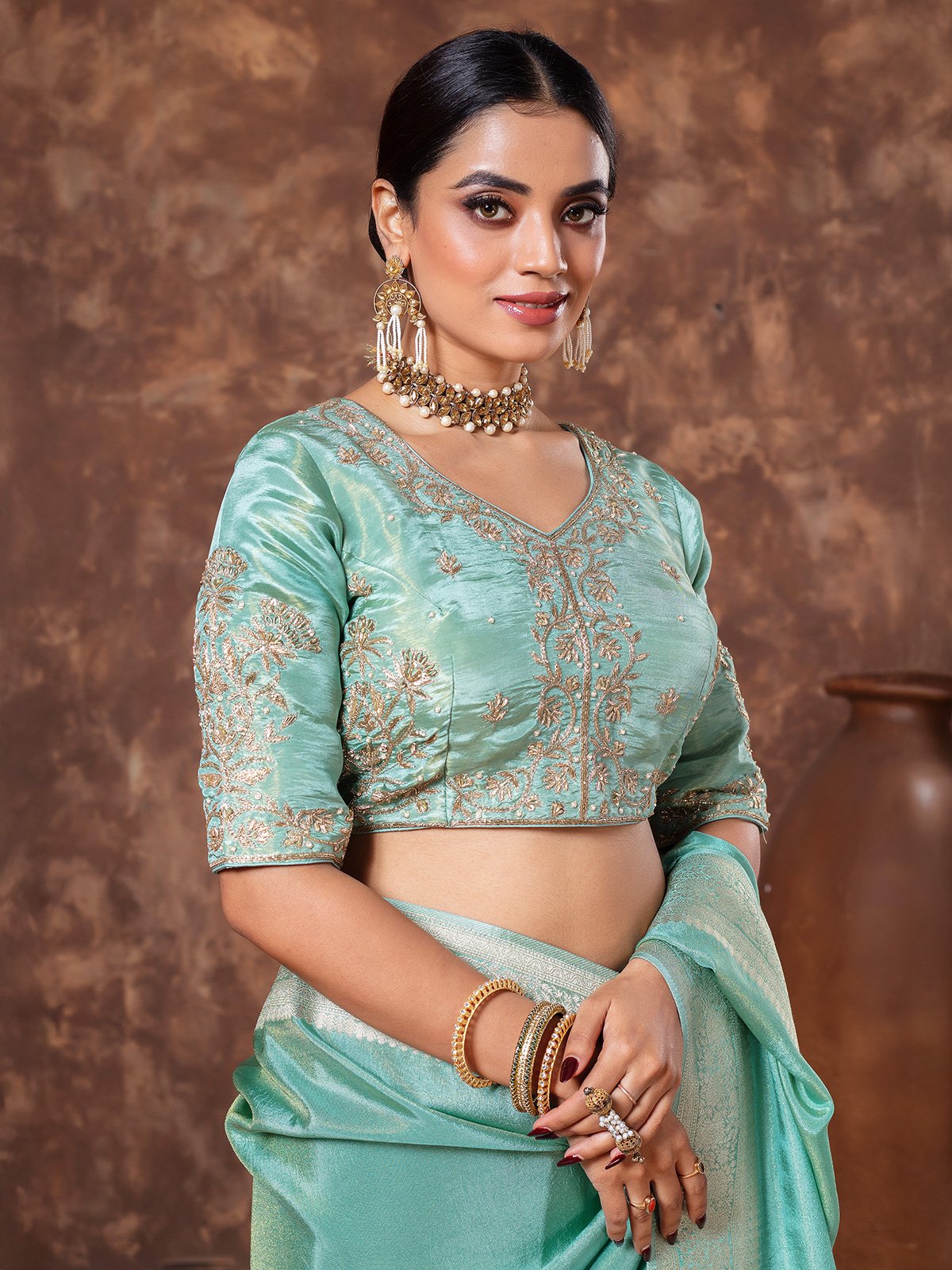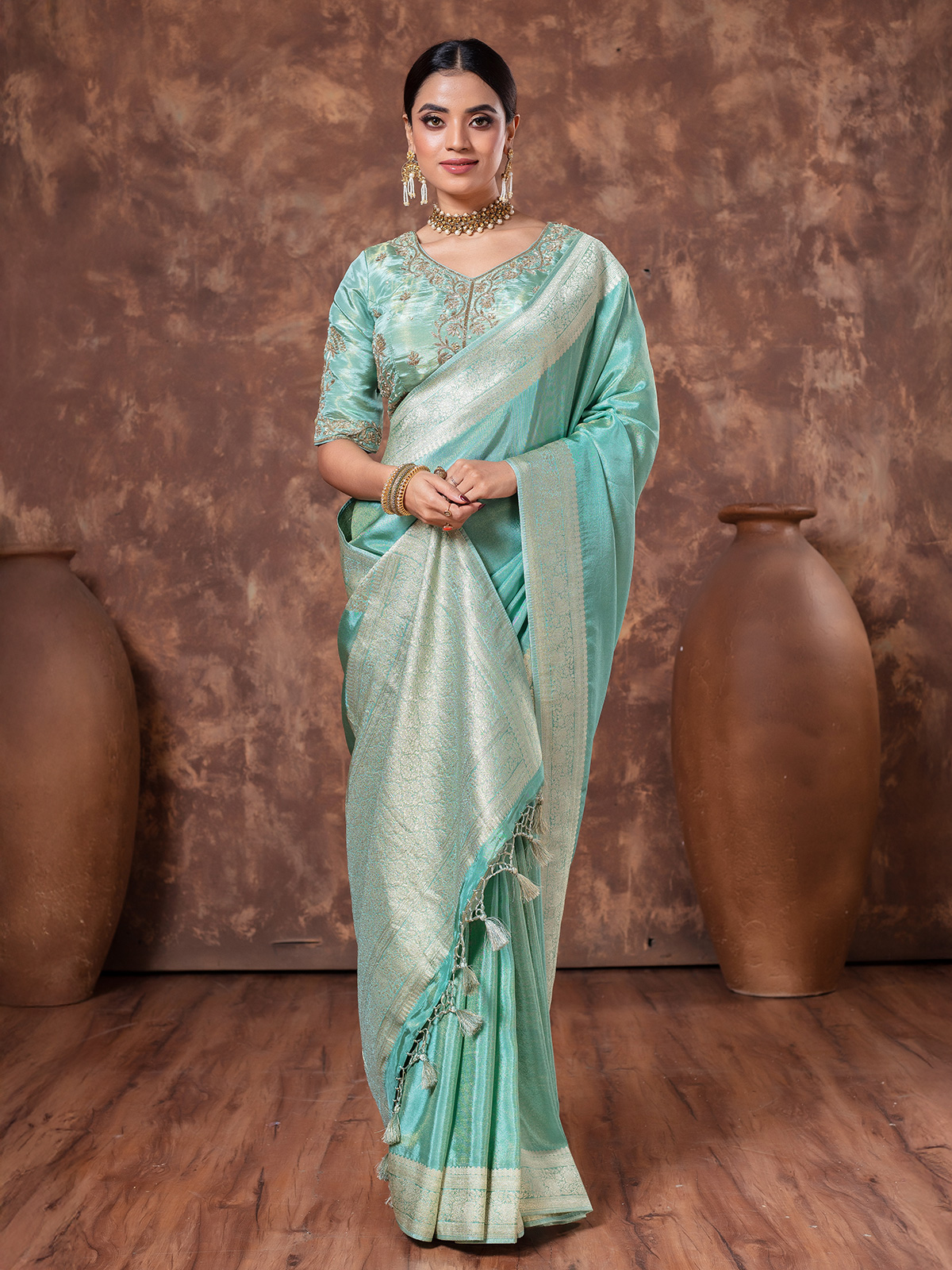 Exude regal charm in our mint green tissue silk saree, beautifully adorned with exquisite zari weaving. Comes with a ready-made blouse enhanced with fine handwork for a refined finish.