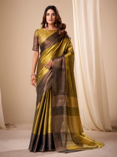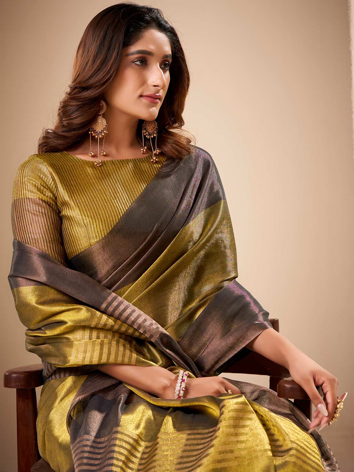 Crafted in traditional mehendi green tissue silk, this saree is highlighted with elegant zari work for timeless ethnic beauty. Paired with an unstitched blouse piece, it offers a graceful silhouette, making it a charming choice for wedding rituals, sangeet celebrations and festive mehndi gatherings.