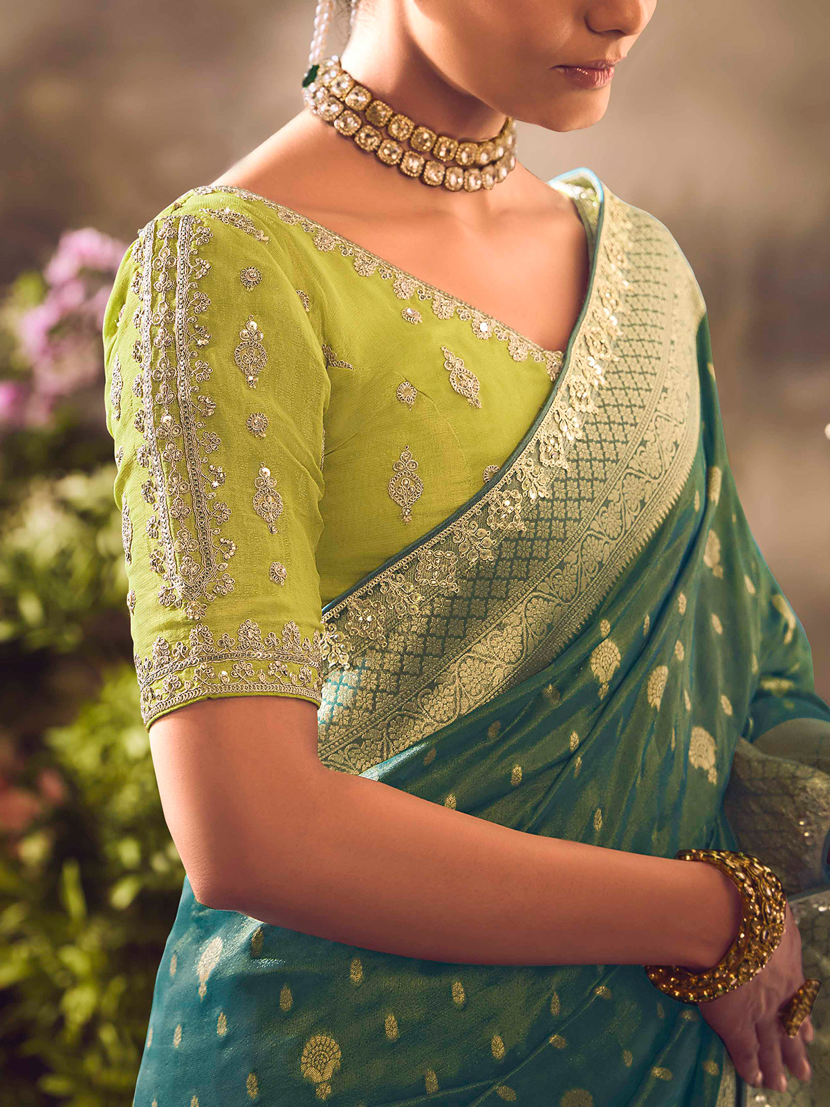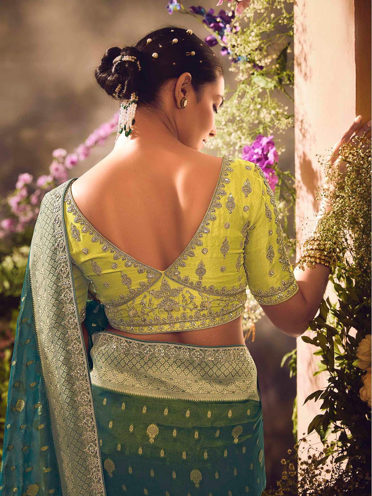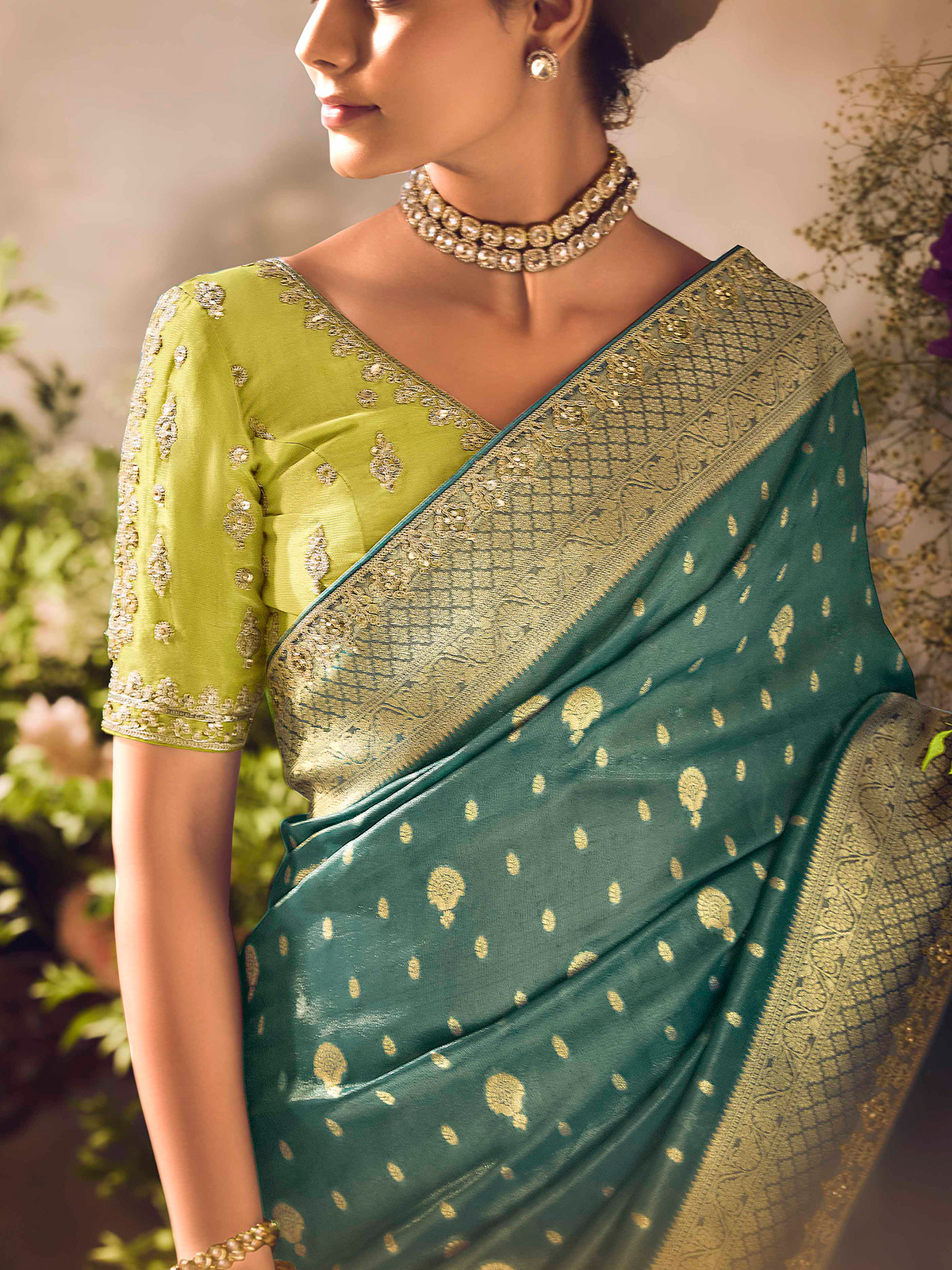 Crafted in vibrant teal blue Banarasi tissue fabric, this saree features elaborate zari, zardosi, resham, stone and sequin work. Perfect for weddings and festive occasions, it comes with an unstitched blouse piece to help you create a personalized ethnic ensemble.