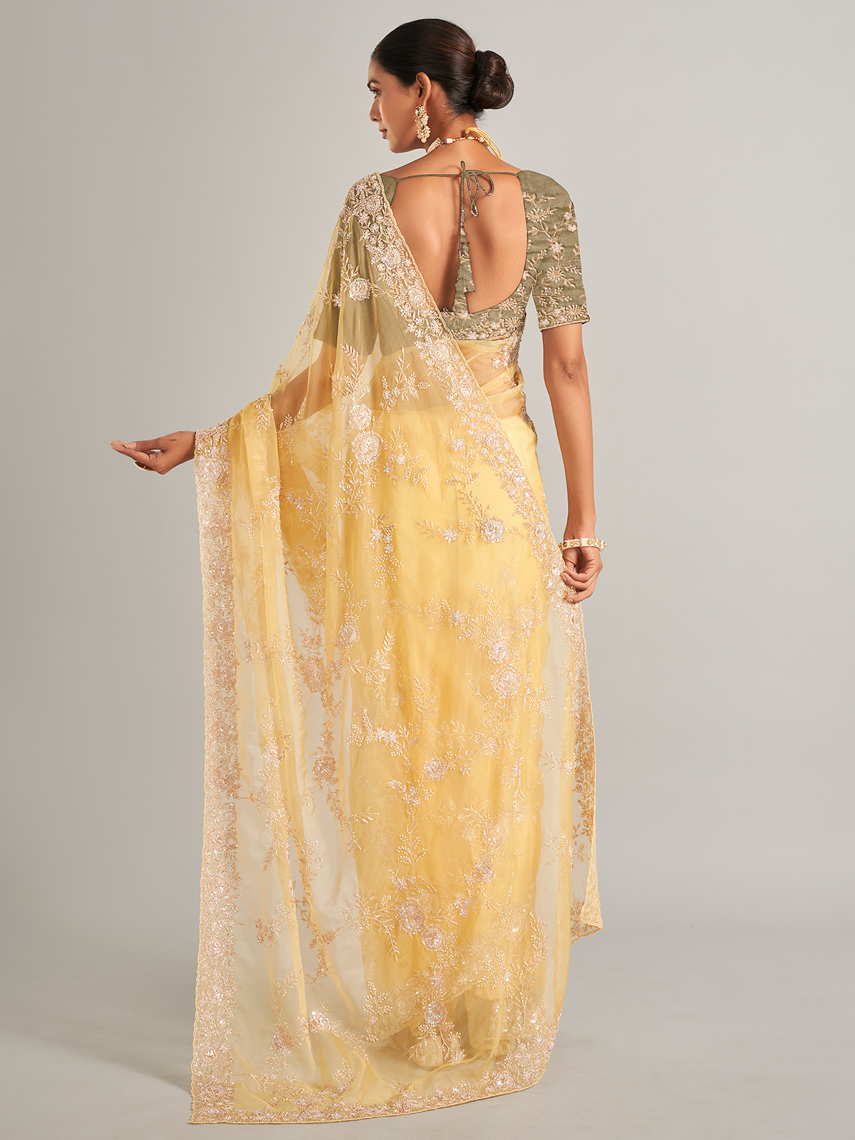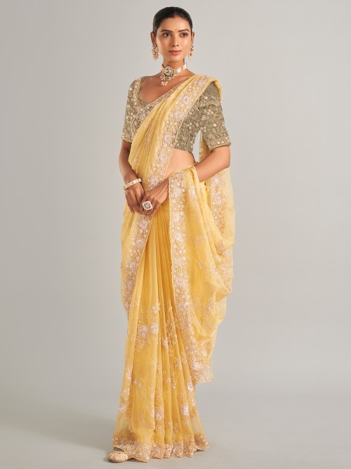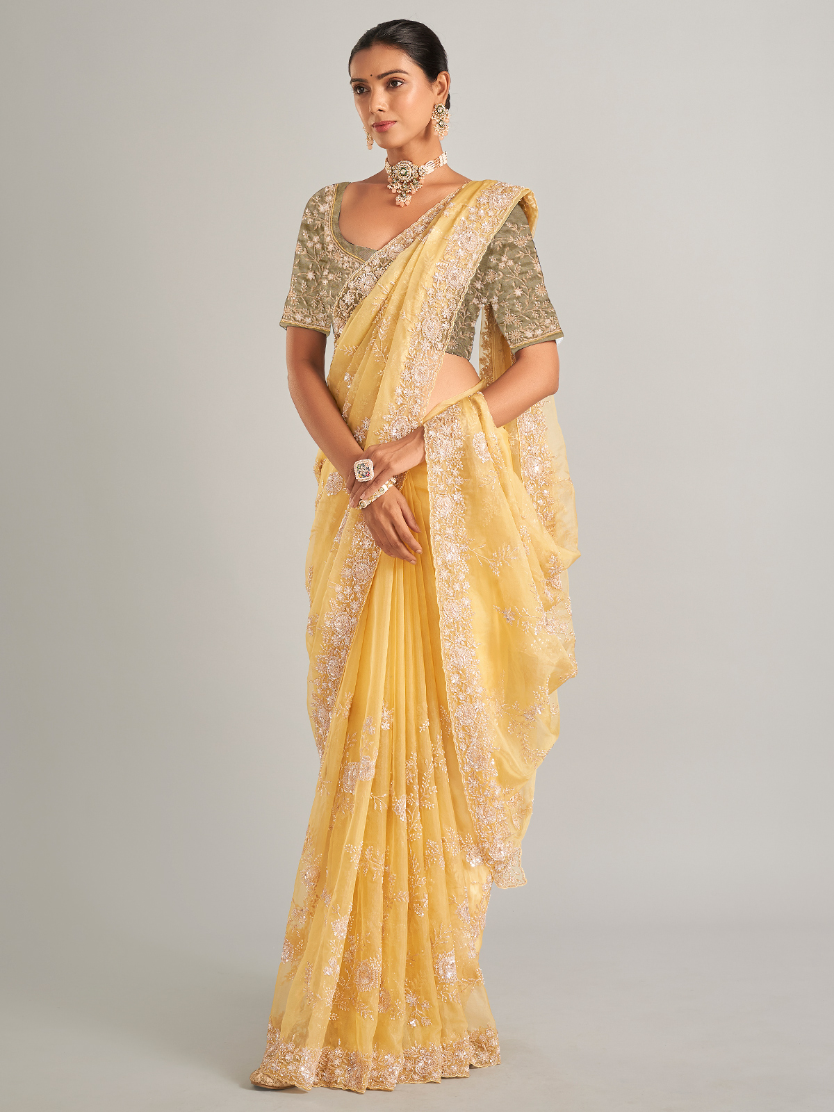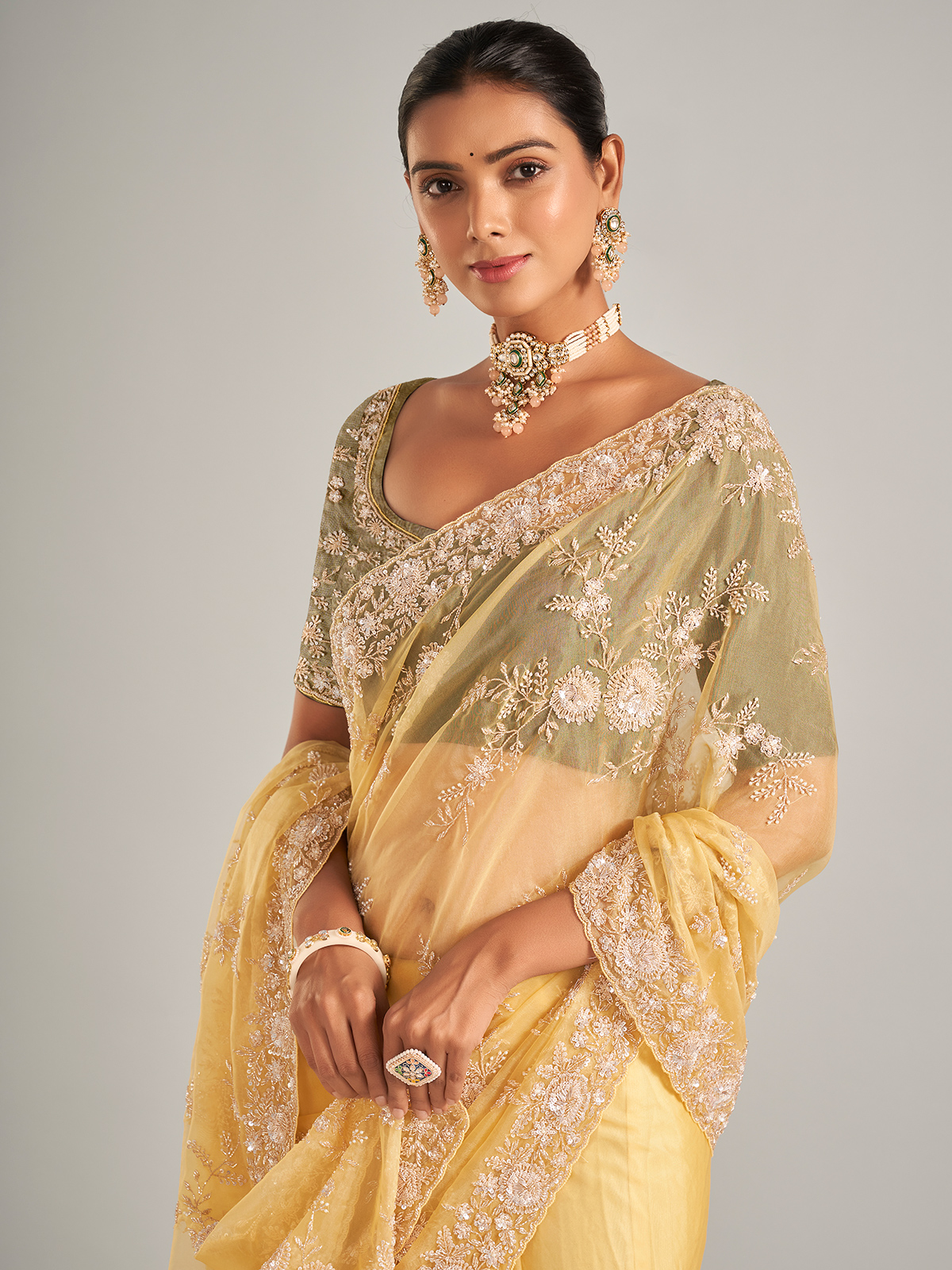Wear this lovely light yellow organza silk saree to show off your charm. Beads, cutdana, sequins, and zardosi work that has been particularly designed for a classic appeal add to its charm. It has olive unstitched blouse piece.