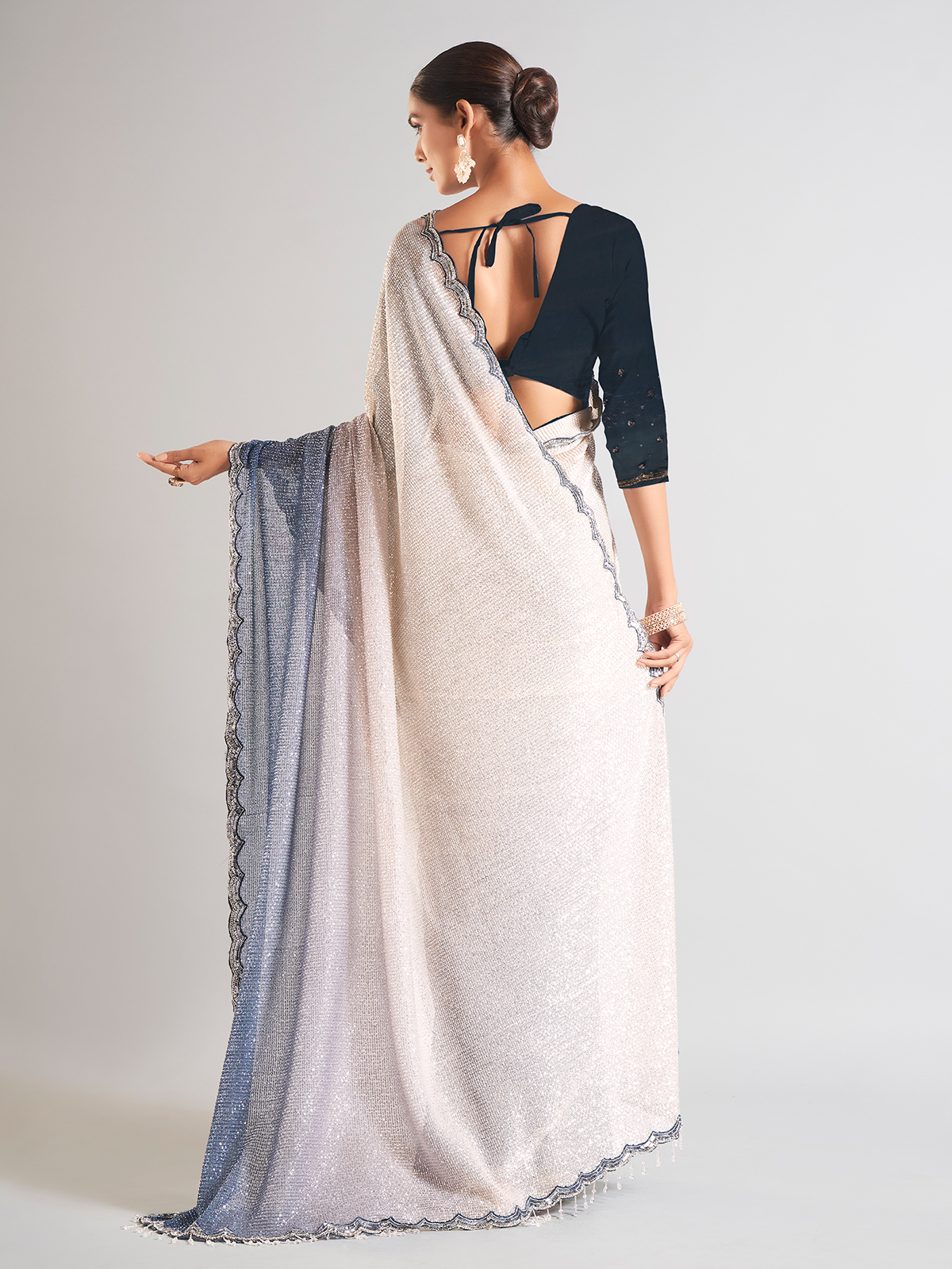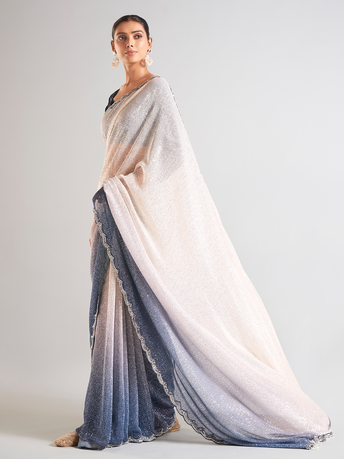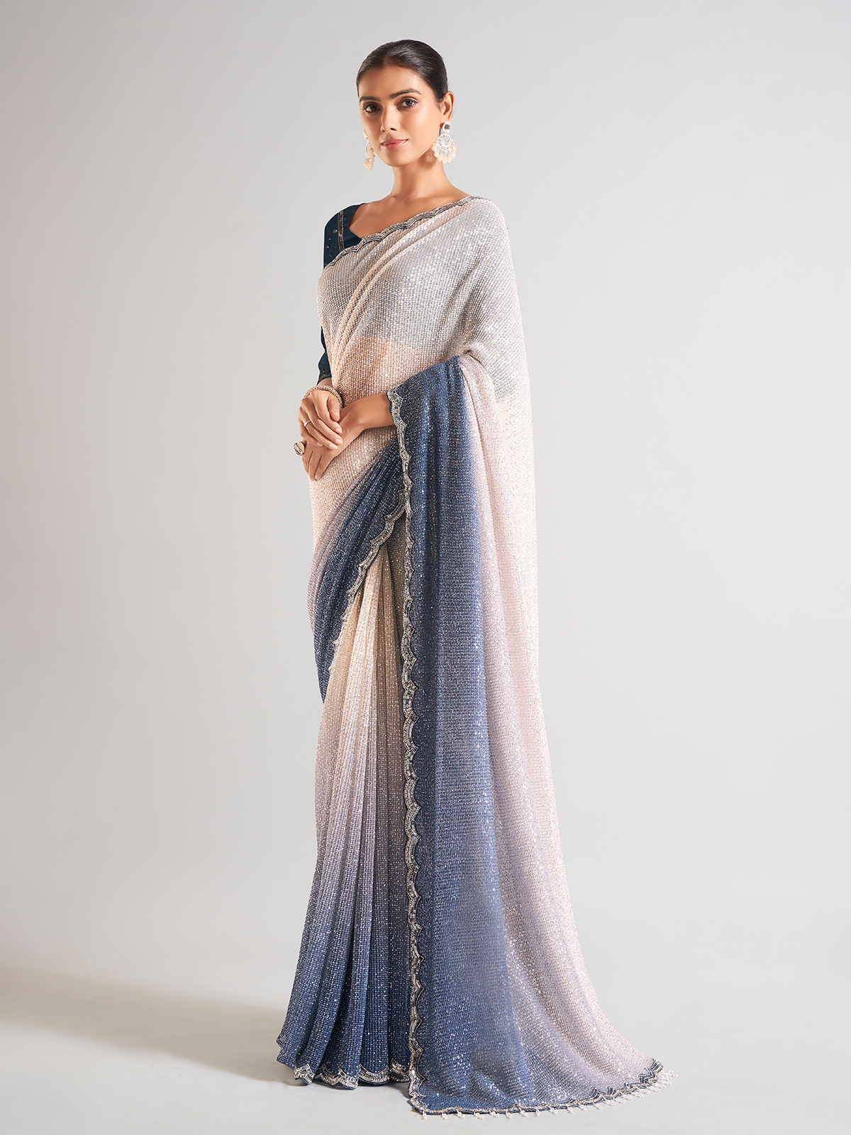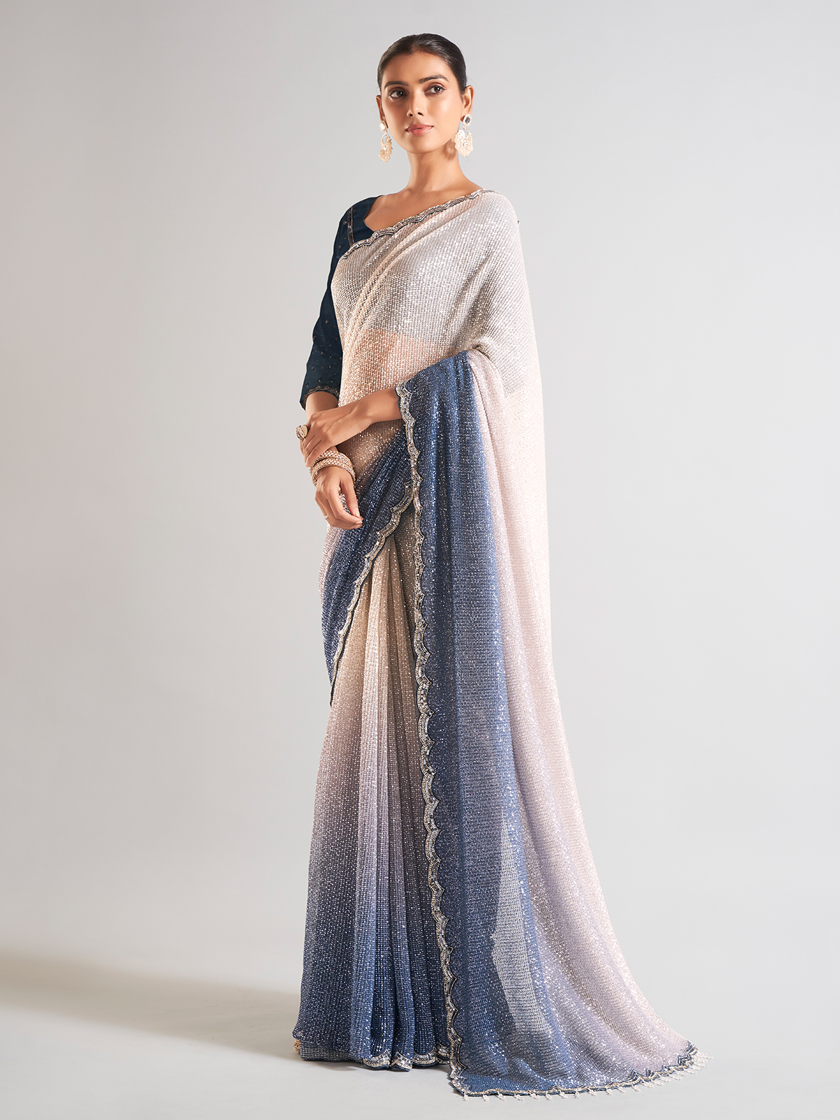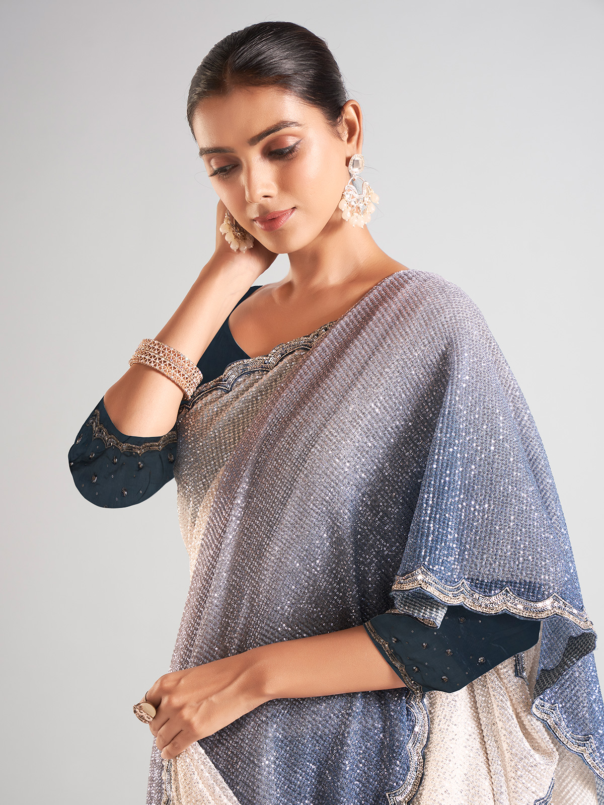 Shine at your next function with our cream and blue sequins saree. Adorned with cutdana, stone, and sequins work, it makes for a captivating choice. It comes with a blouse piece.