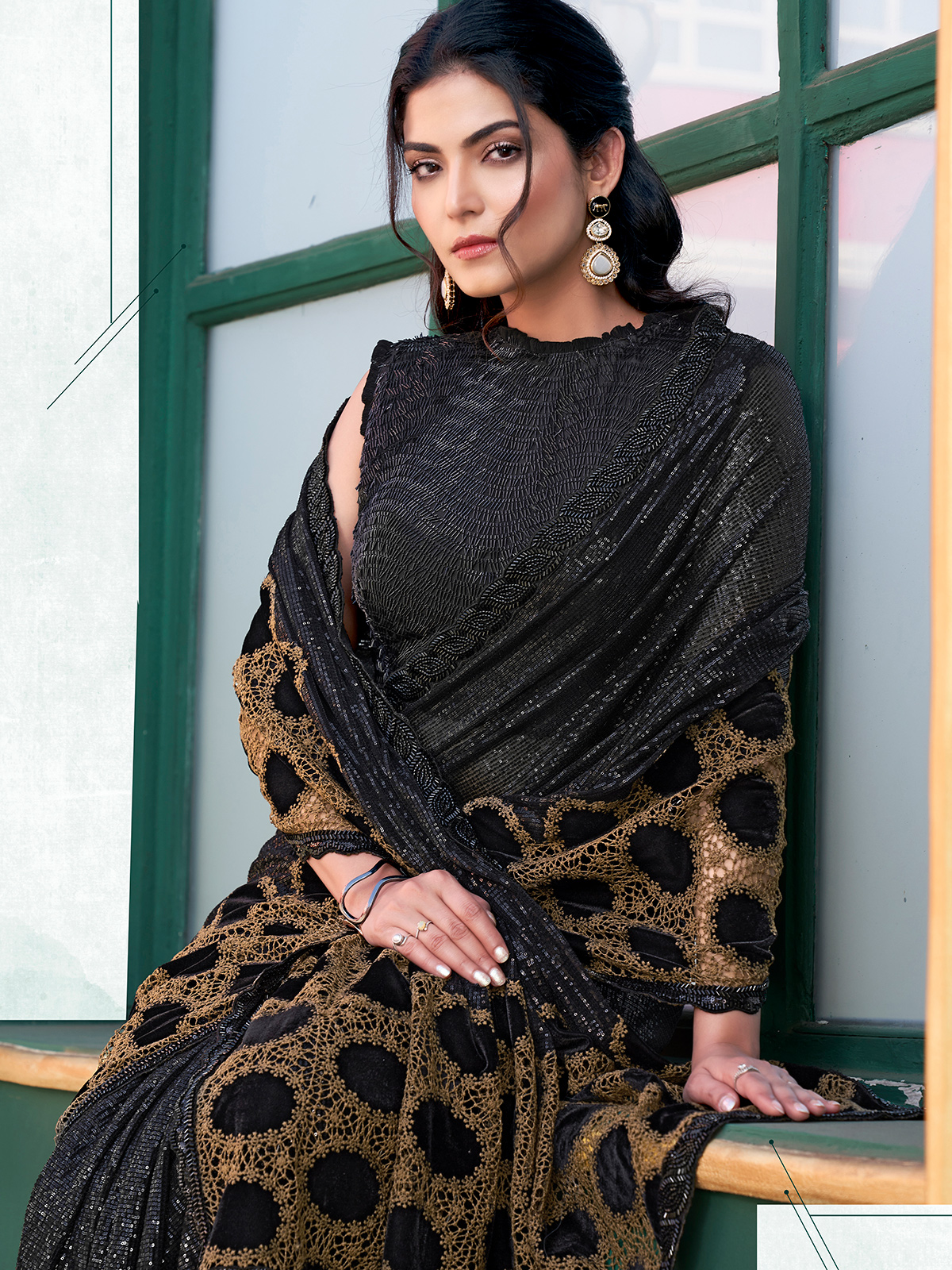 Crafted in deep black velvet, this saree highlights detailed work with cutdana, zari and sequins. Its soft texture and quiet shine make it ideal for festive nights or wedding functions. Paired with a stitched blouse, it offers comfort and a ready to wear charm for graceful occasions.