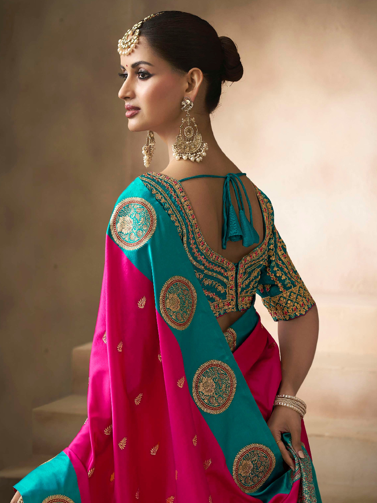 Bright magenta satin silk saree sparkles with resham, embroidery, and sequins, featuring a contrasting border and ornate butti weaving. Perfect for weddings and festive celebrations, it radiates traditional elegance. Includes an unstitched blouse piece for customized styling.