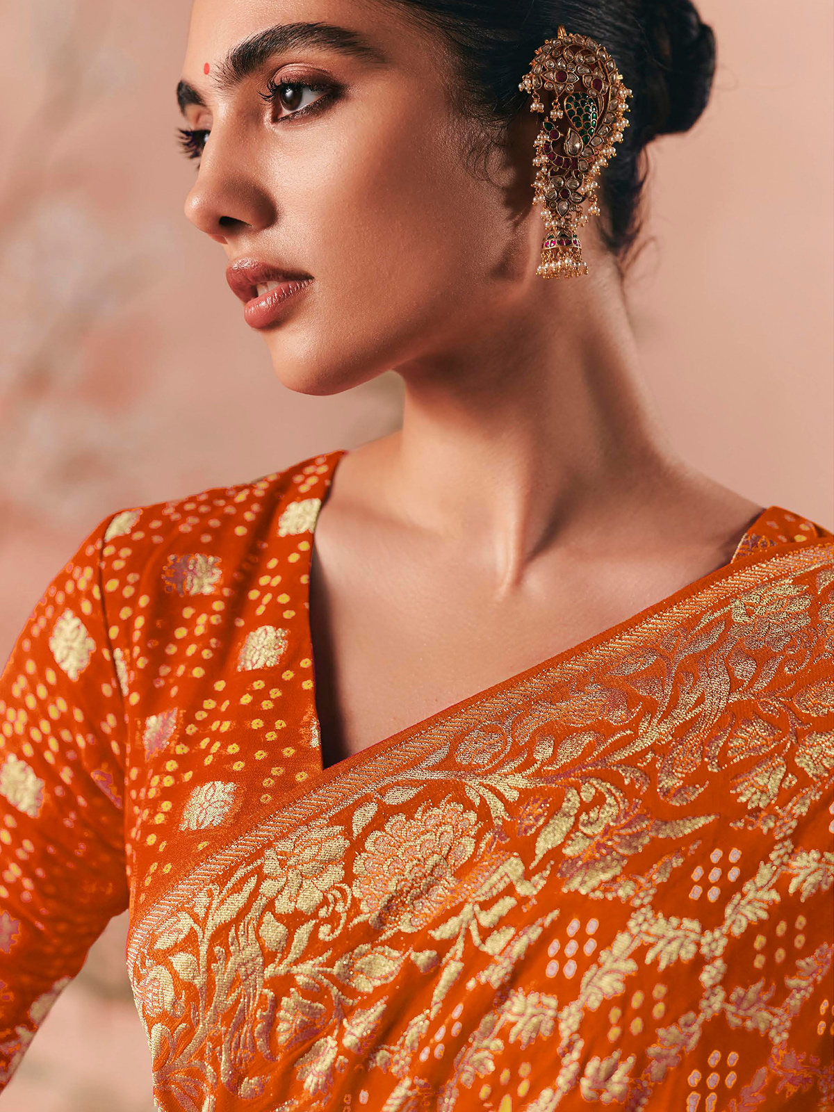 Celebrate in color with this orange georgette saree, detailed with artistic Bandhej weaving and rich zari motifs. The tasseled pallu adds movement and festivity. Teamed with an unstitched blouse piece, this saree is perfect for cultural events and joyous occasions.