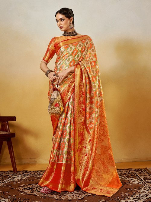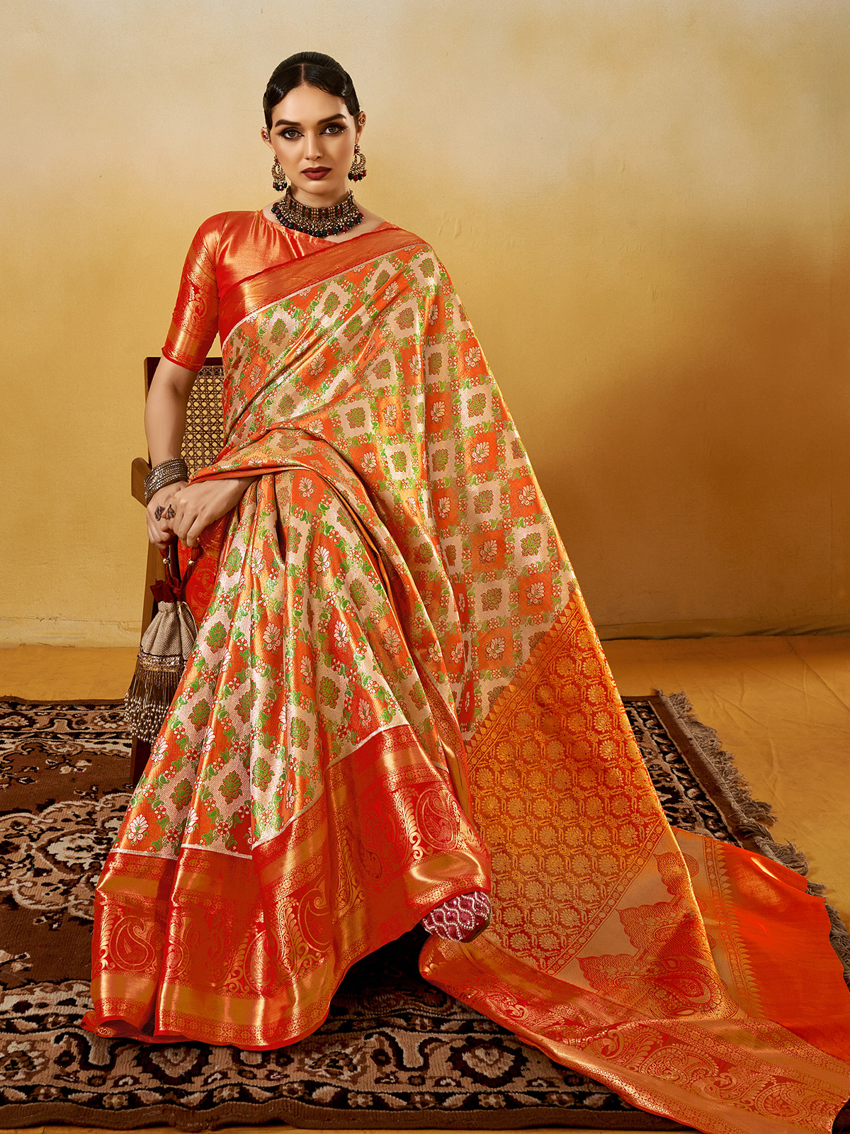 Vibrant Orange Silk Drape With Zari Detailing Touch