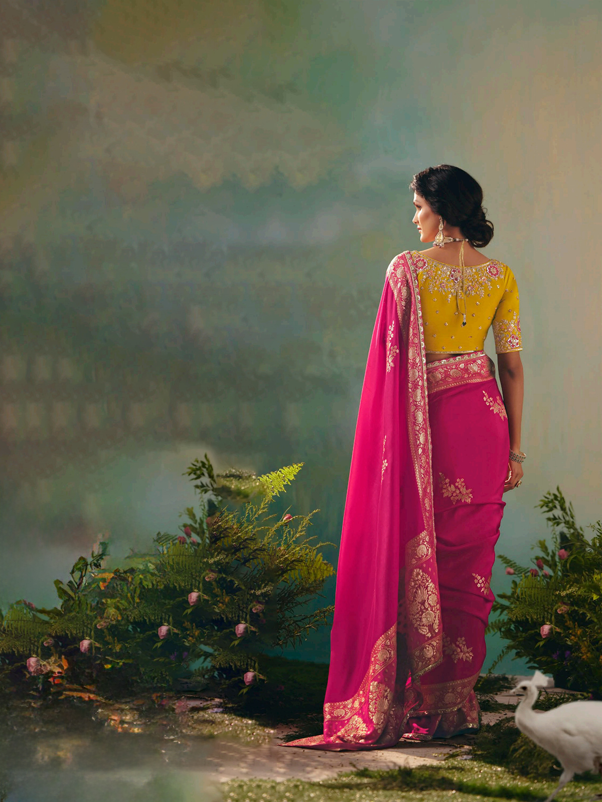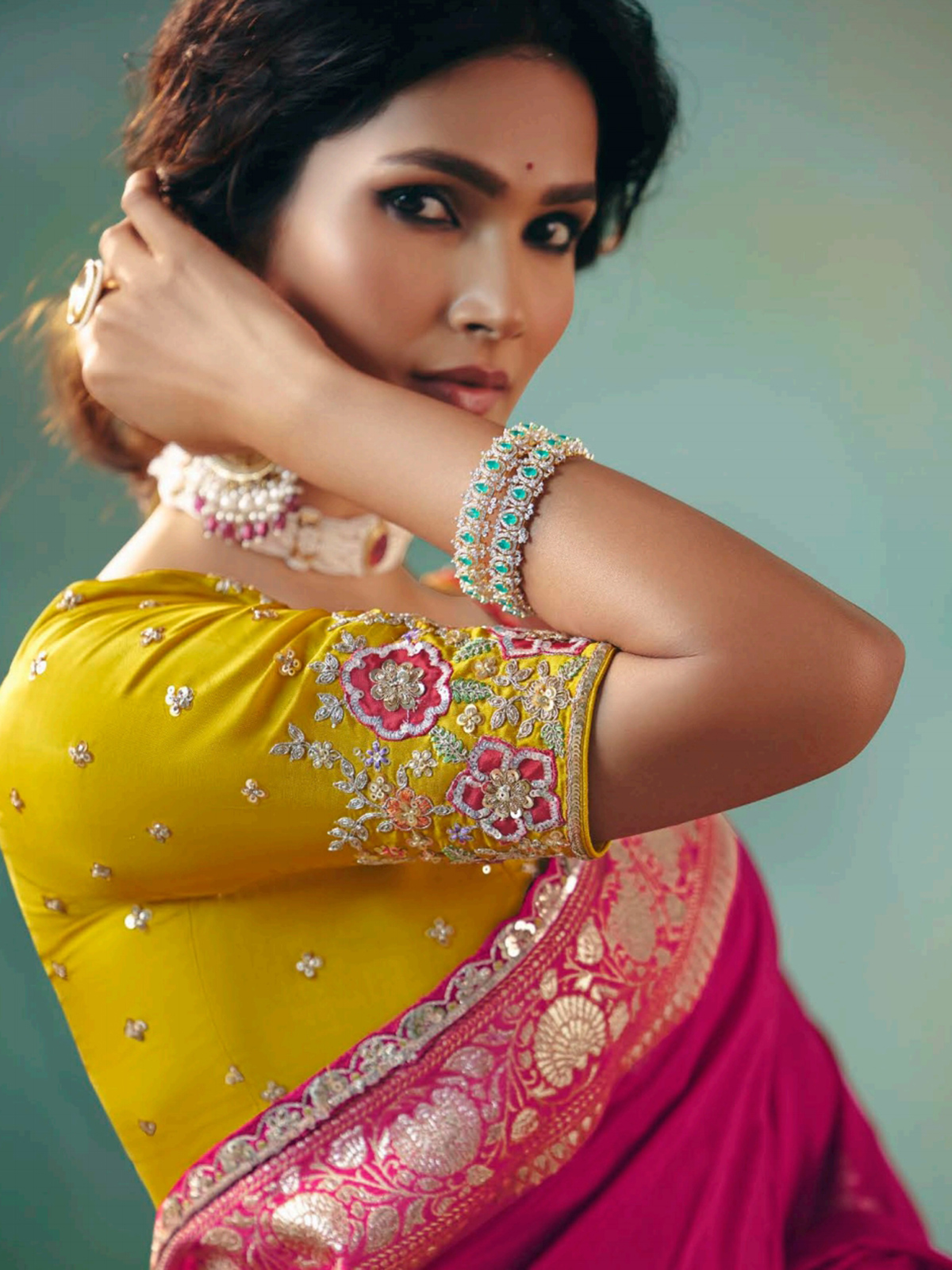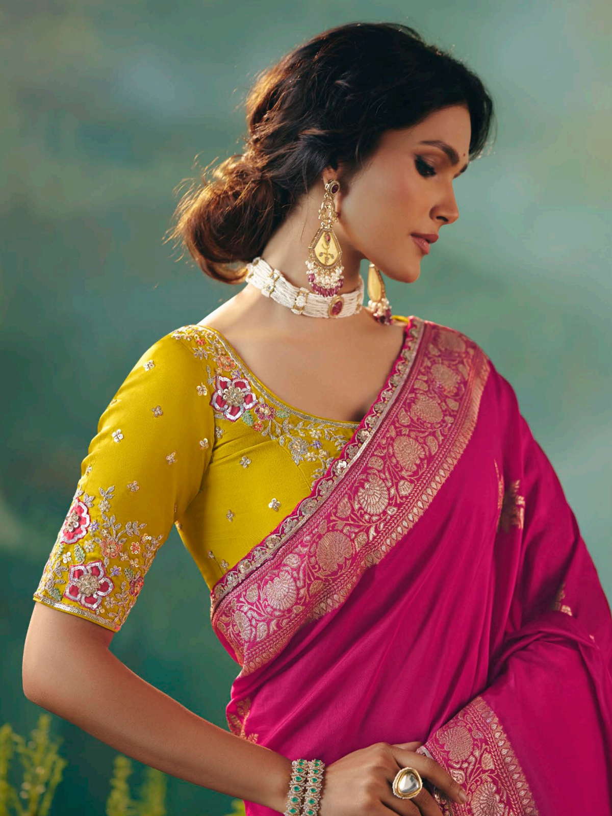 This rani pink viscose dola silk saree shines with intricate resham, zari, and sequins work. A graceful choice for weddings and festive celebrations, it blends modern style with cultural charm. Includes an unstitched blouse piece for a tailored, personalized finish.
