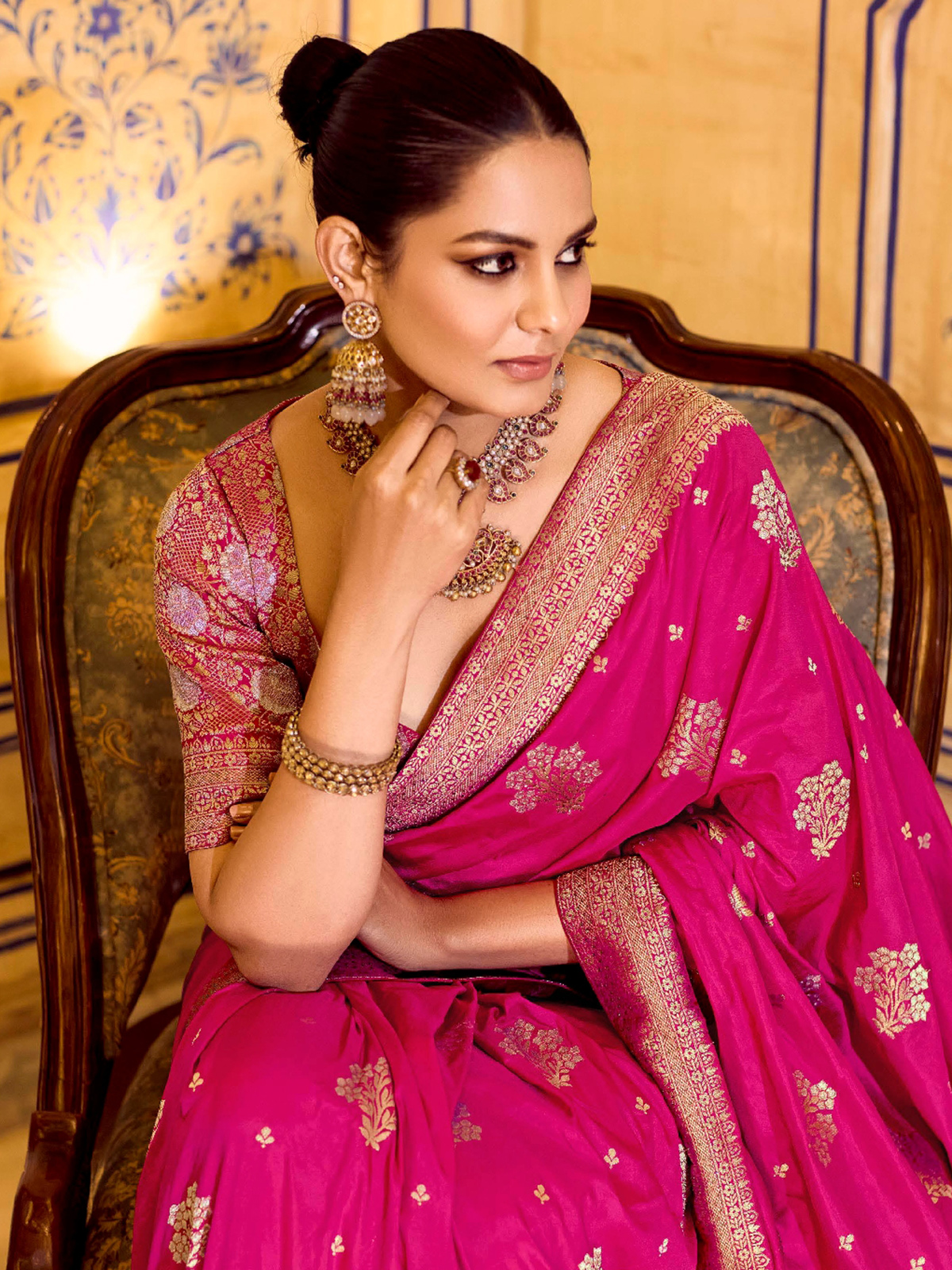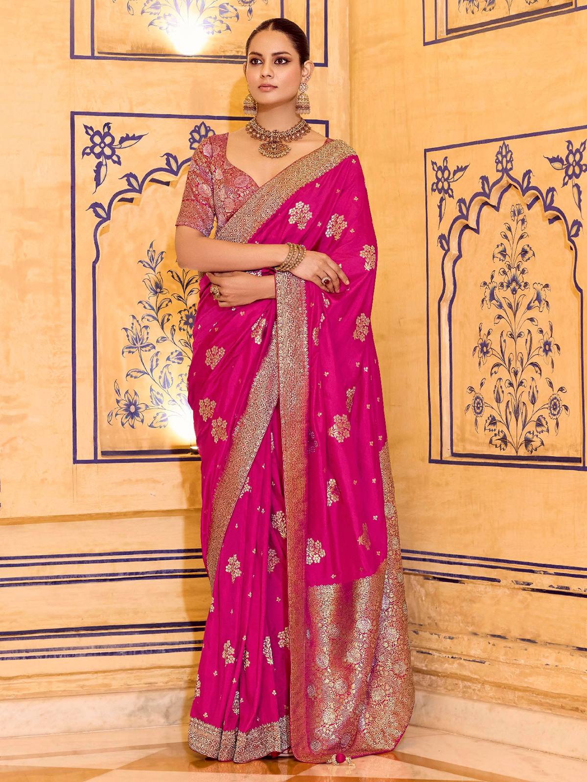 Vivid magenta tones and intricate zari craftsmanship give this banarasi crepe silk saree a bold festive presence. Ideal for weddings, receptions, and auspicious puja moments, it offers a luxurious drape and timeless appeal. The unstitched blouse completes a stunning, customizable outfit.