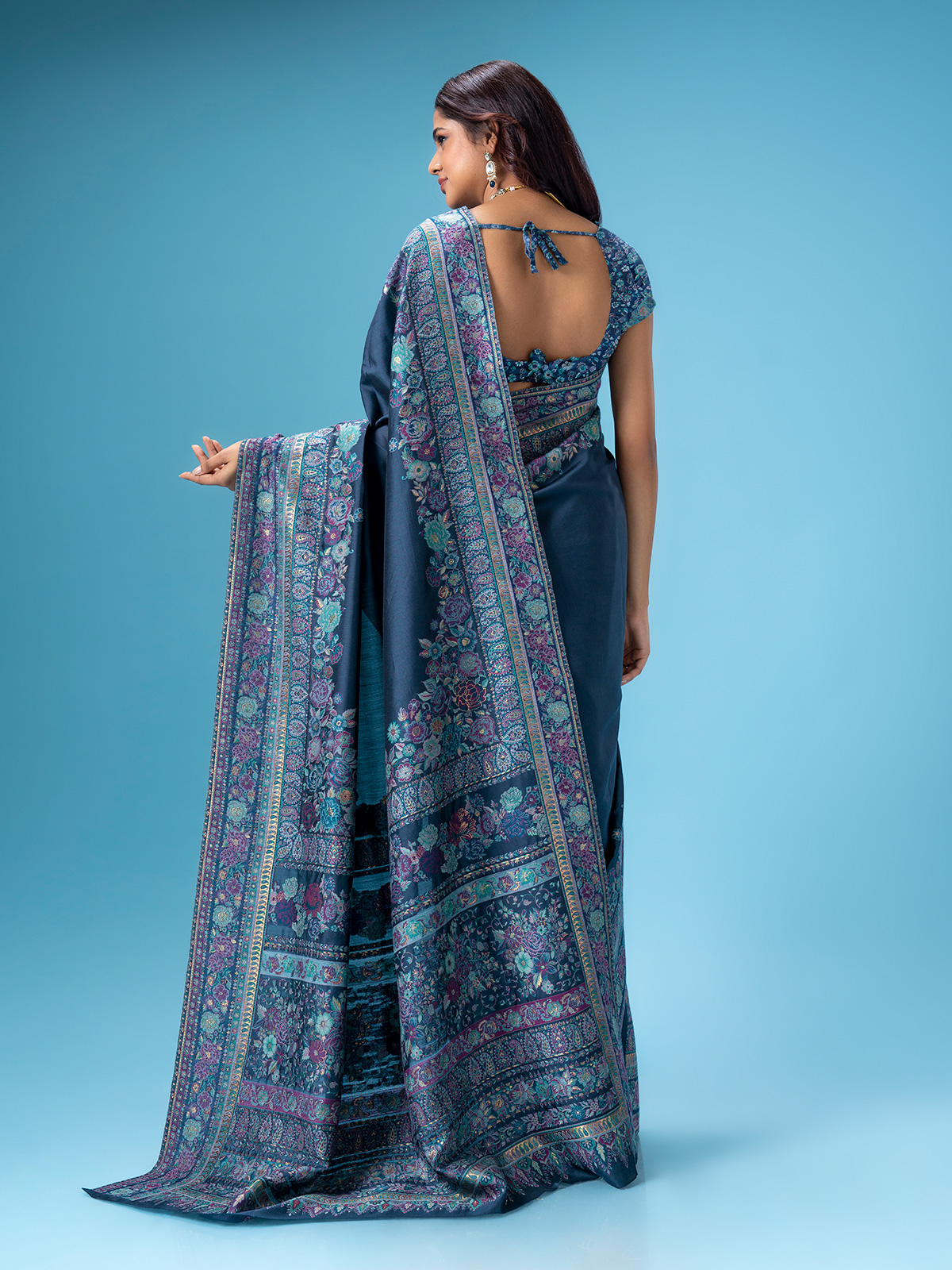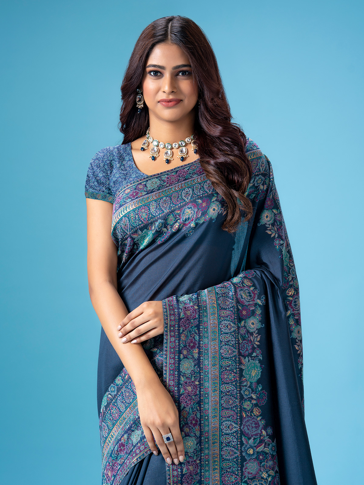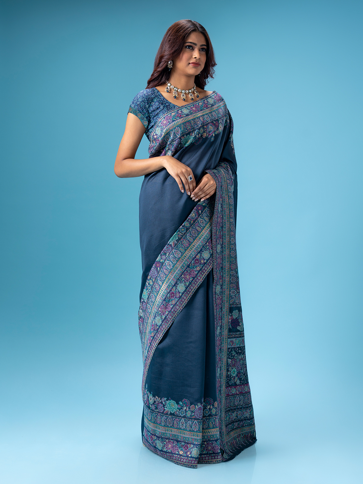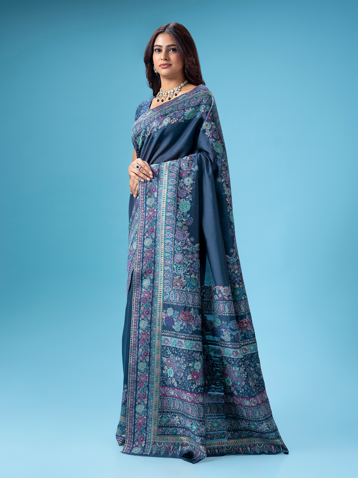 Embrace elegance in this dark grey pashmina silk saree, adorned with intricate Kashmiri weaving across the border and pallu. The rich texture and graceful design add timeless charm to your ethnic look. Paired with a matching blouse piece.