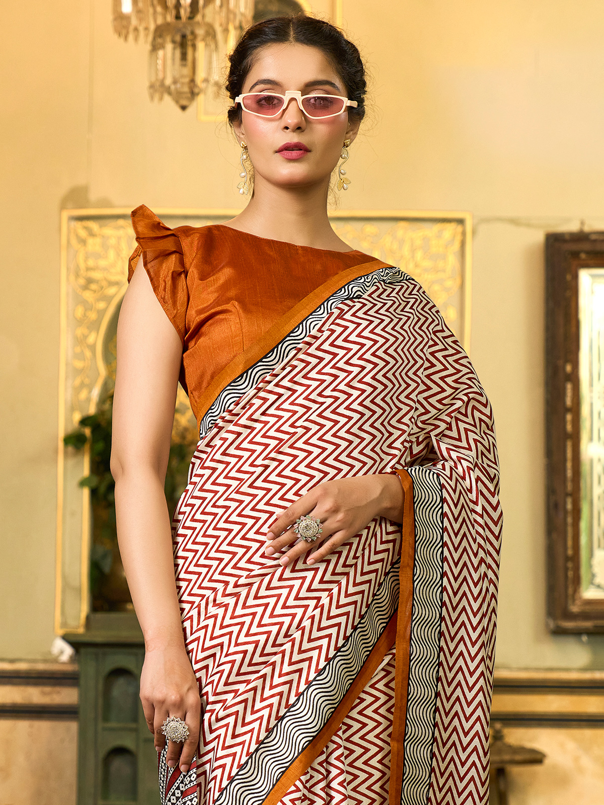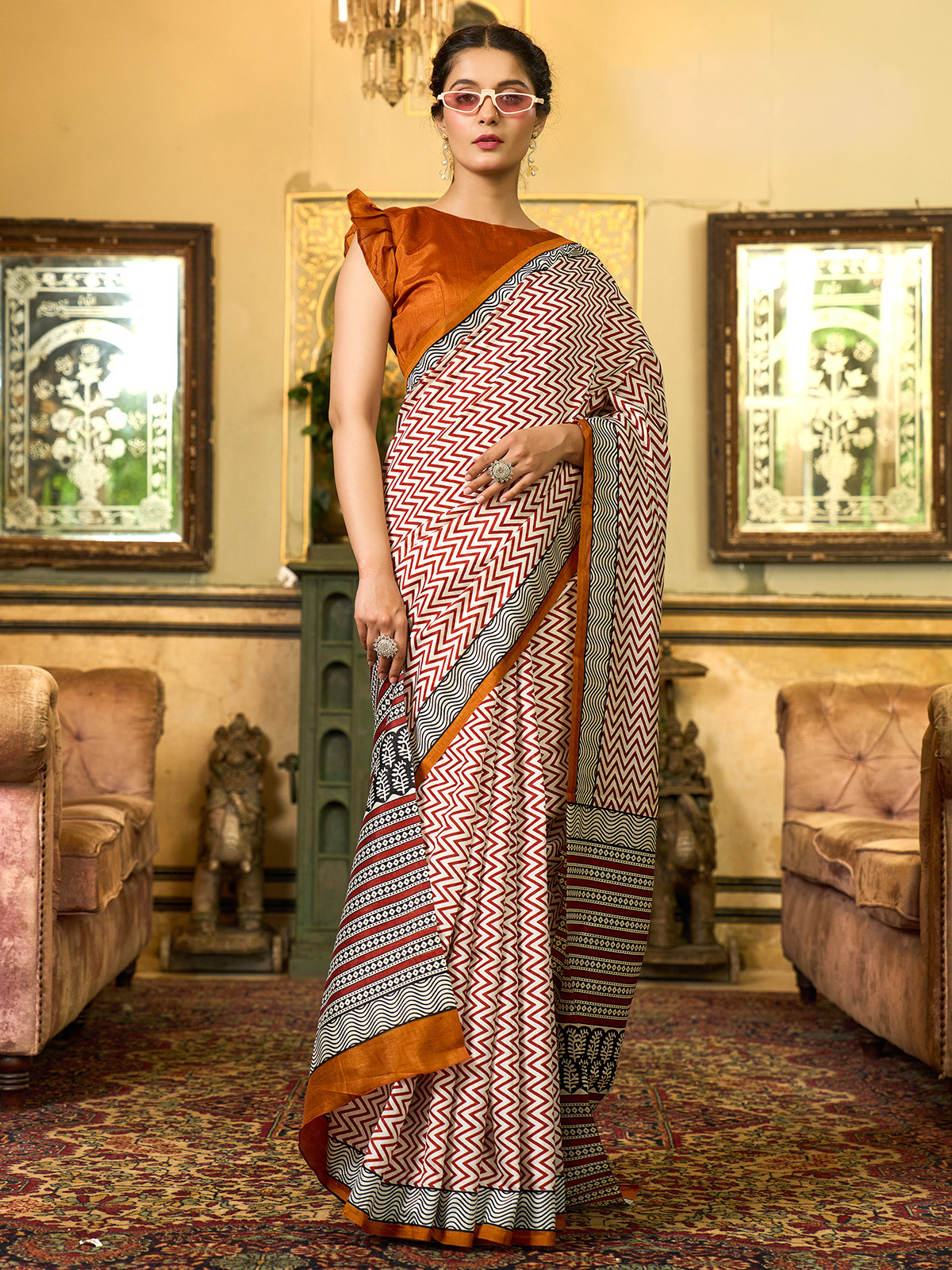 Add a touch of vibrance to your wardrobe with this white and brown Bhagalpuri silk saree. Featuring a striking printed design and crafted from soft, breathable fabric, it’s sure to earn compliments. Comes with an unstitched blouse piece for a tailored finish.