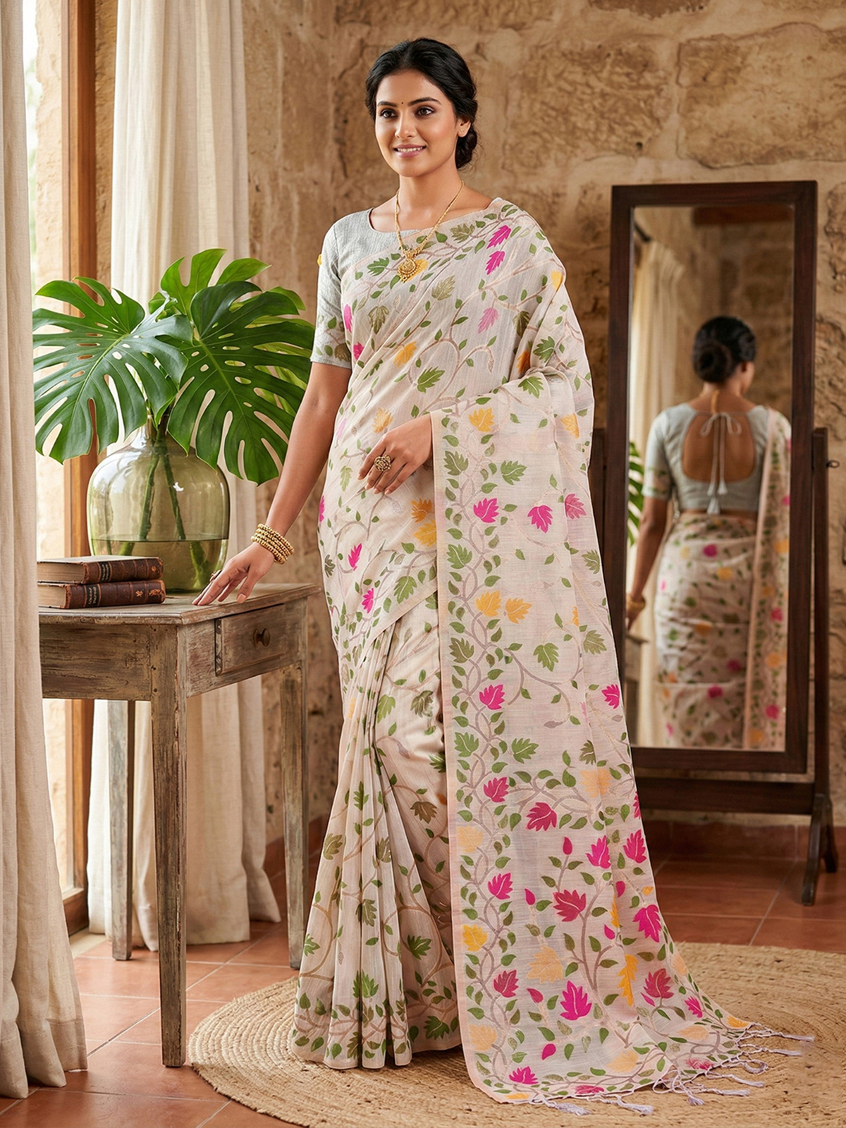 This timeless white cotton linen silk saree is decorated with a delicate all-over floral pattern in maroon, burnt orange, and forest green leaf motifs. The saree is enhanced with a patterned border and tasseled pallu, creating a refined and classic look. Paired with an unstitched blouse piece, it is perfect for traditional ceremonies and festive celebrations.
