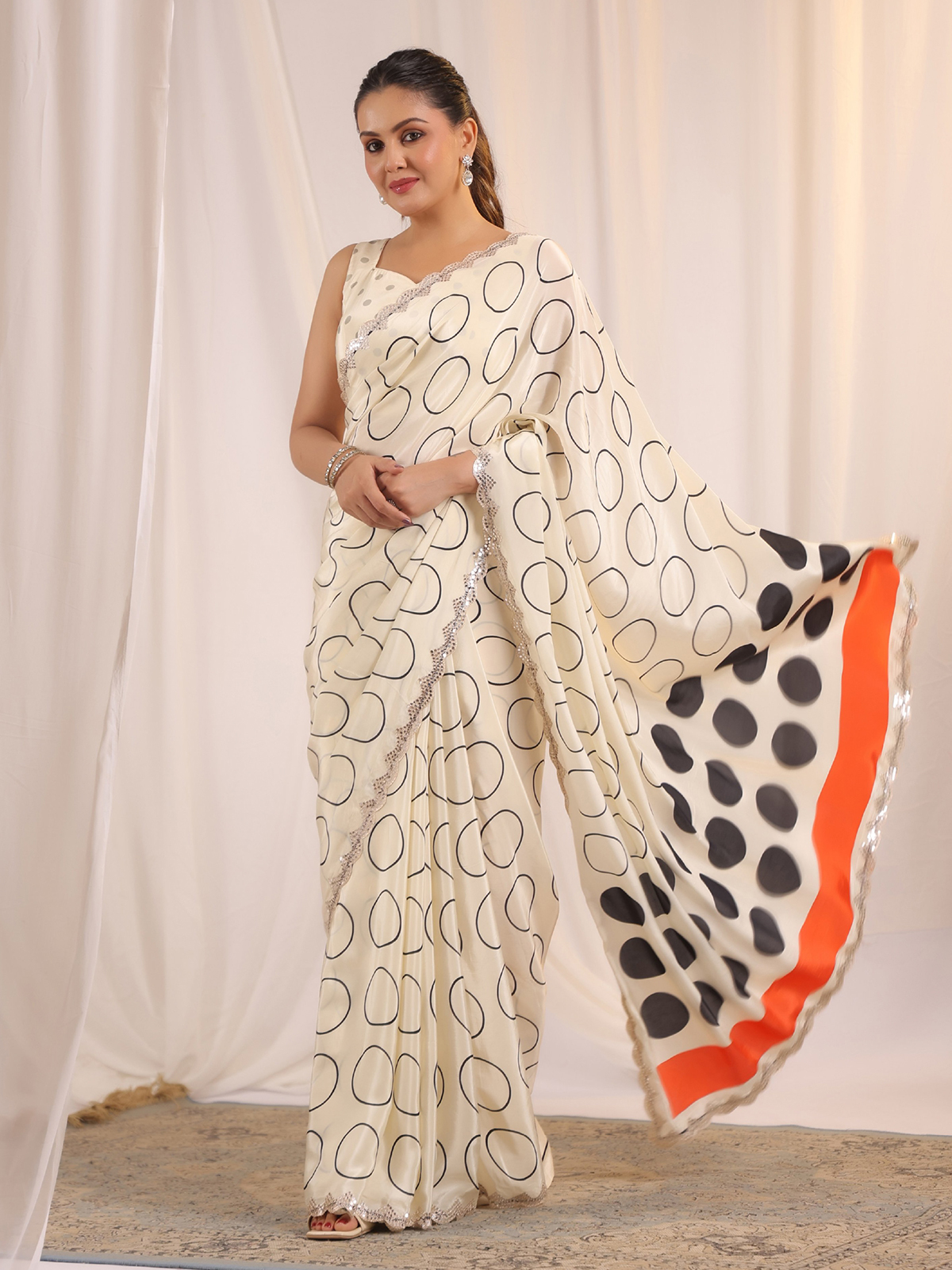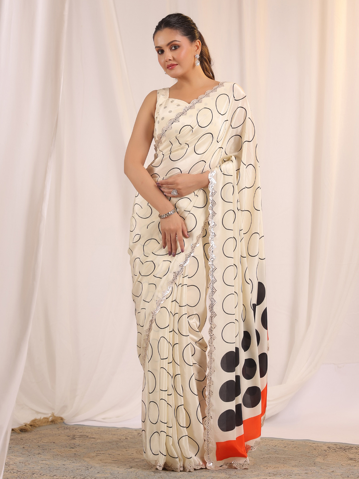 Elegant and festive, this white crepe silk blouse features printed accents and sparkling aabla work. A graceful choice for celebrations like raksha bandhan or poojas, it blends timeless design with a light, contemporary feel.